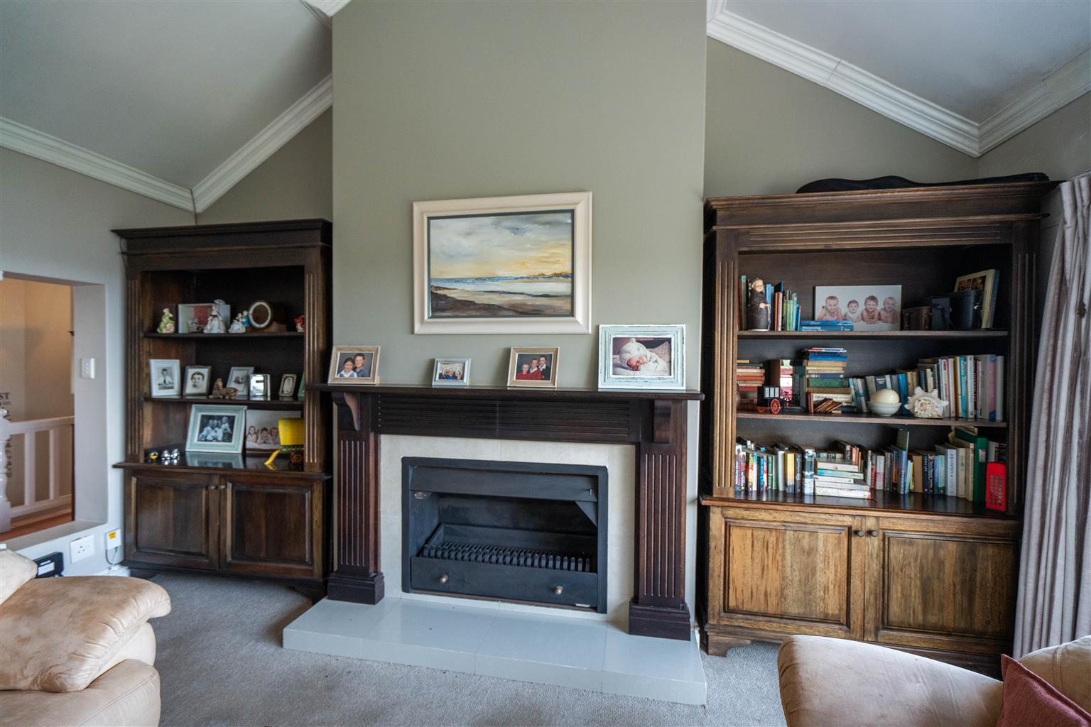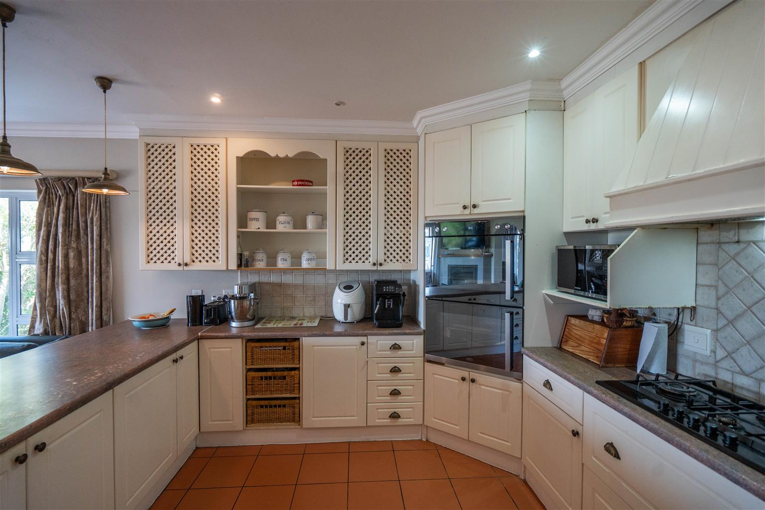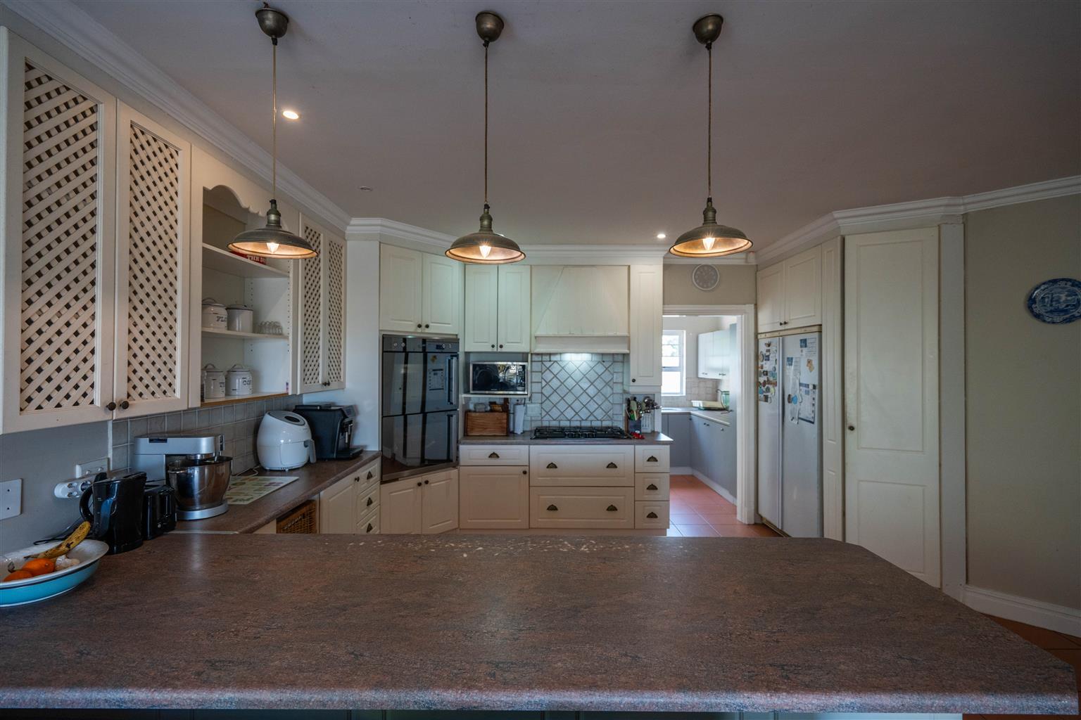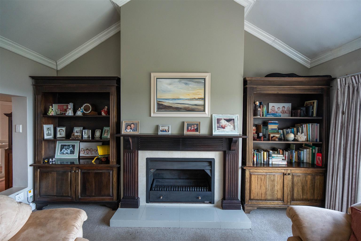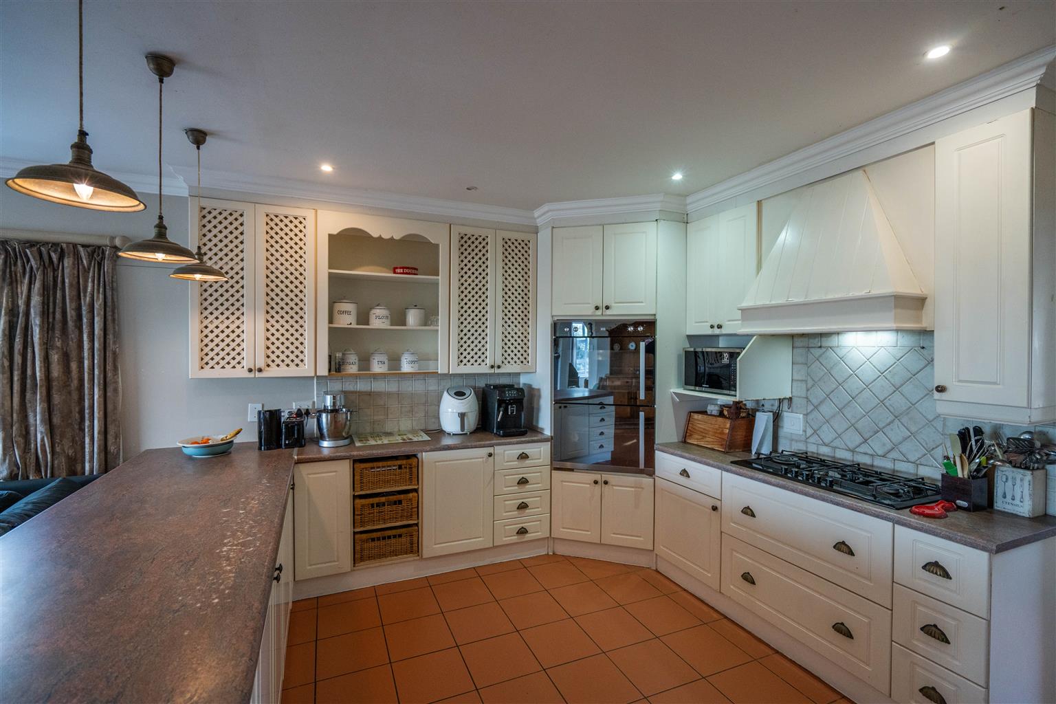 A hallway with dining room on the right of the entrance, leading into a comfortable lounge, superb views. Next to the lounge an open plan TV lounge, kitchen and scullery with enclosed washline area at the back of the home. The TV lounge leads onto a balcony with views of the beautiful garden and pool. A fireplace in the lounge and TV area, perfect for chilly evenings. The double garage leads onto the top floor landing, easily accessible.