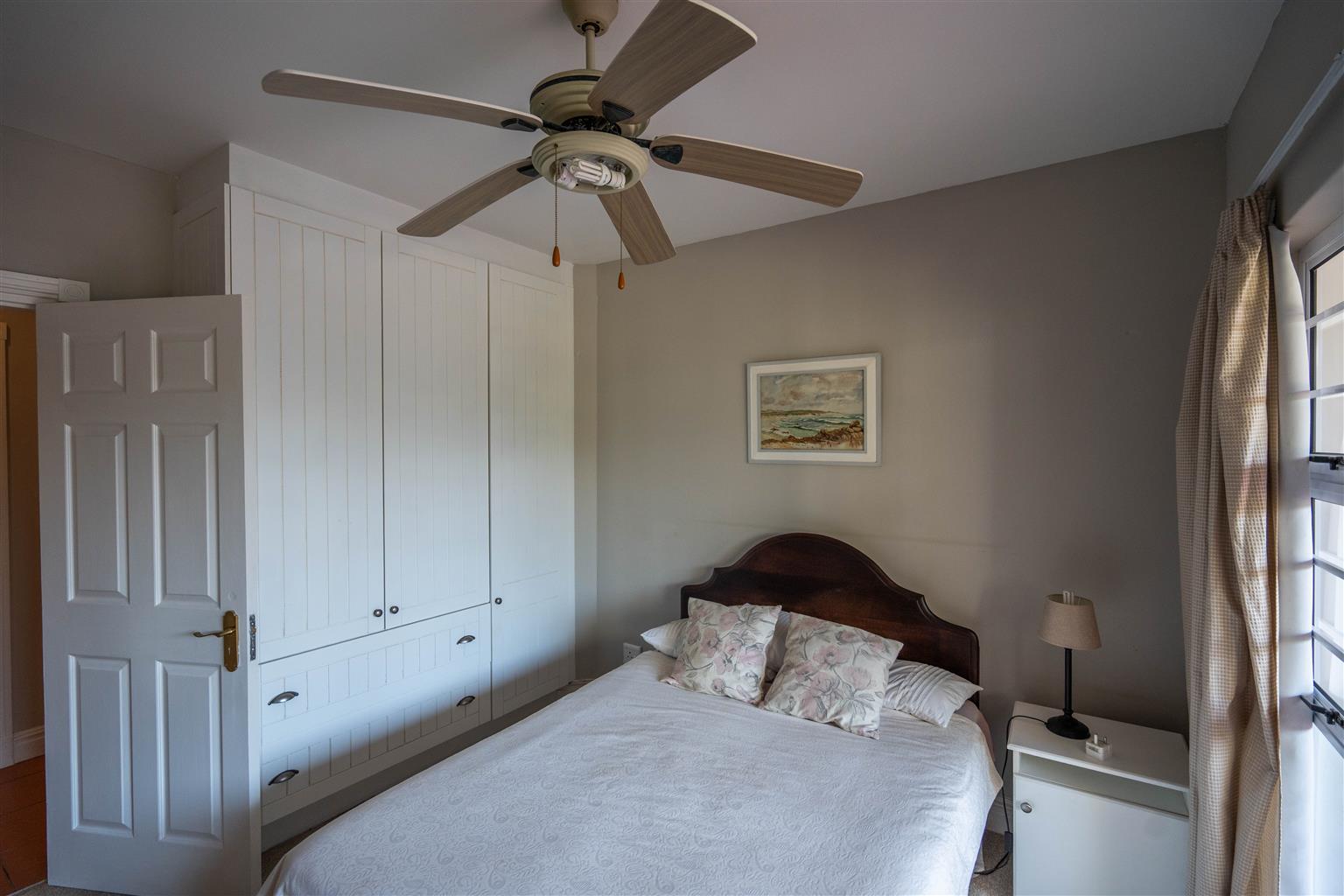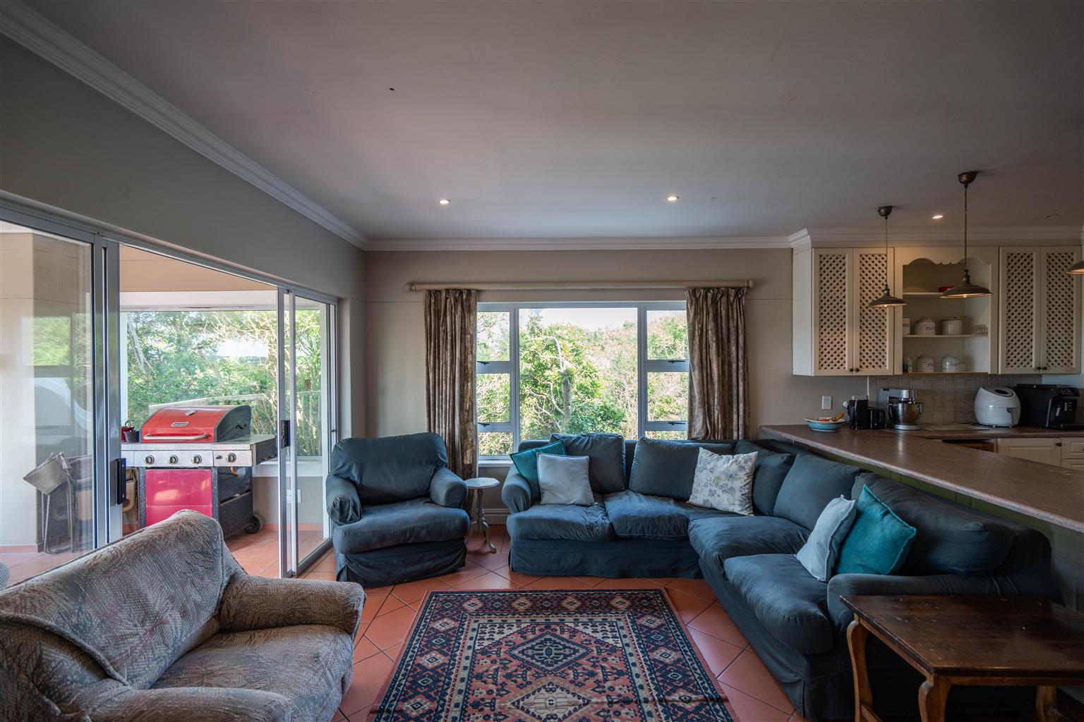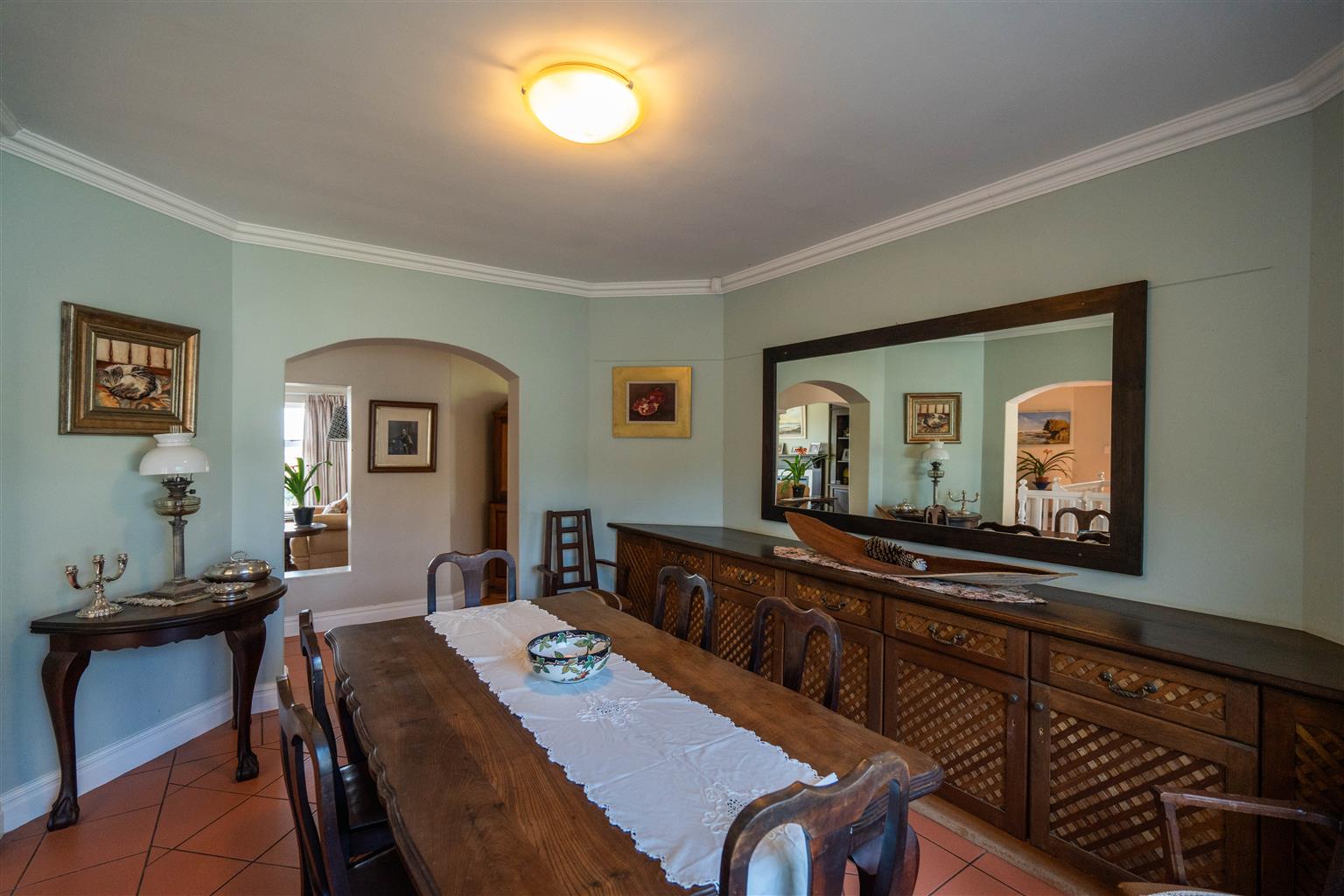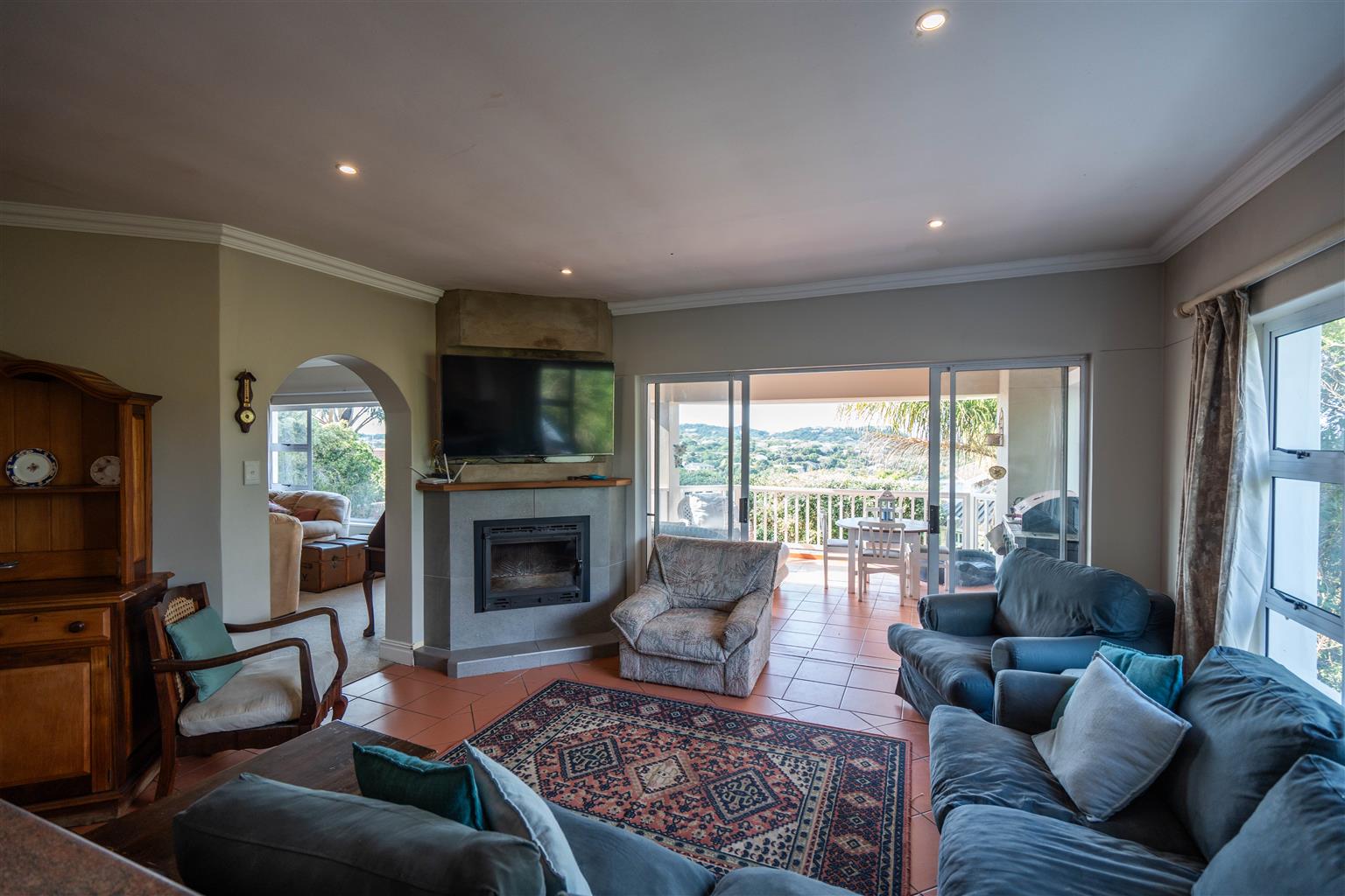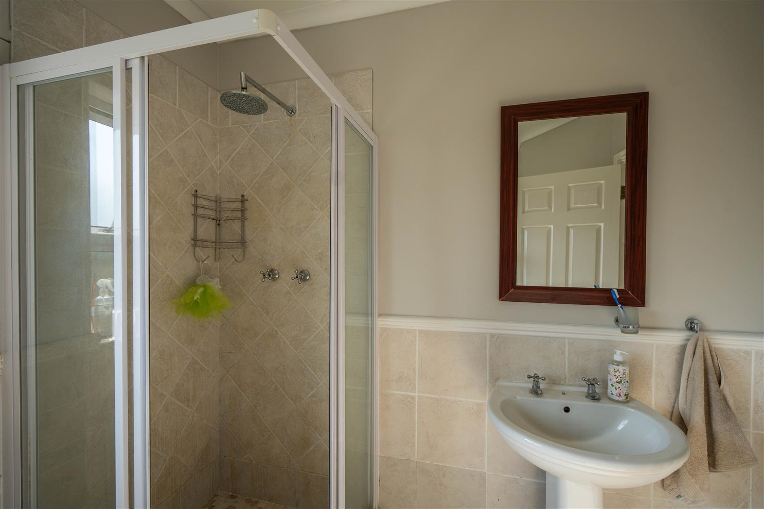 A hallway with dining room on the right of the entrance, leading into a comfortable lounge, superb views. Next to the lounge an open plan TV lounge, kitchen and scullery with enclosed washline area at the back of the home. The TV lounge leads onto a balcony with views of the beautiful garden and pool. A fireplace in the lounge and TV area, perfect for chilly evenings. The double garage leads onto the top floor landing, easily accessible.