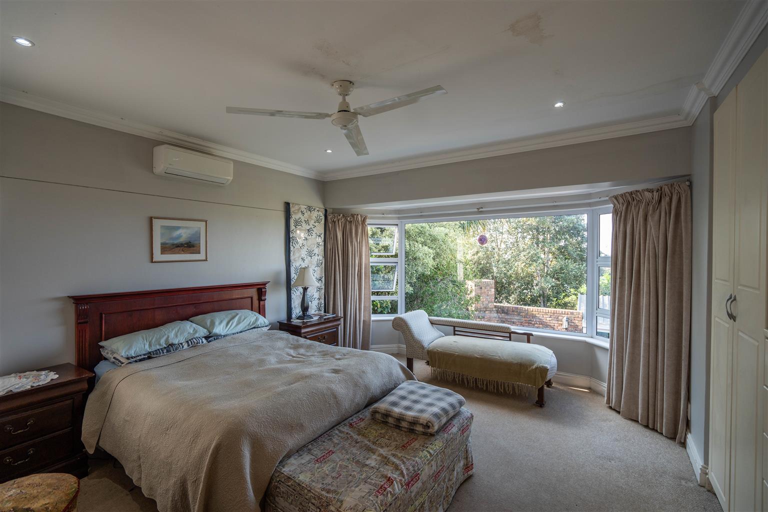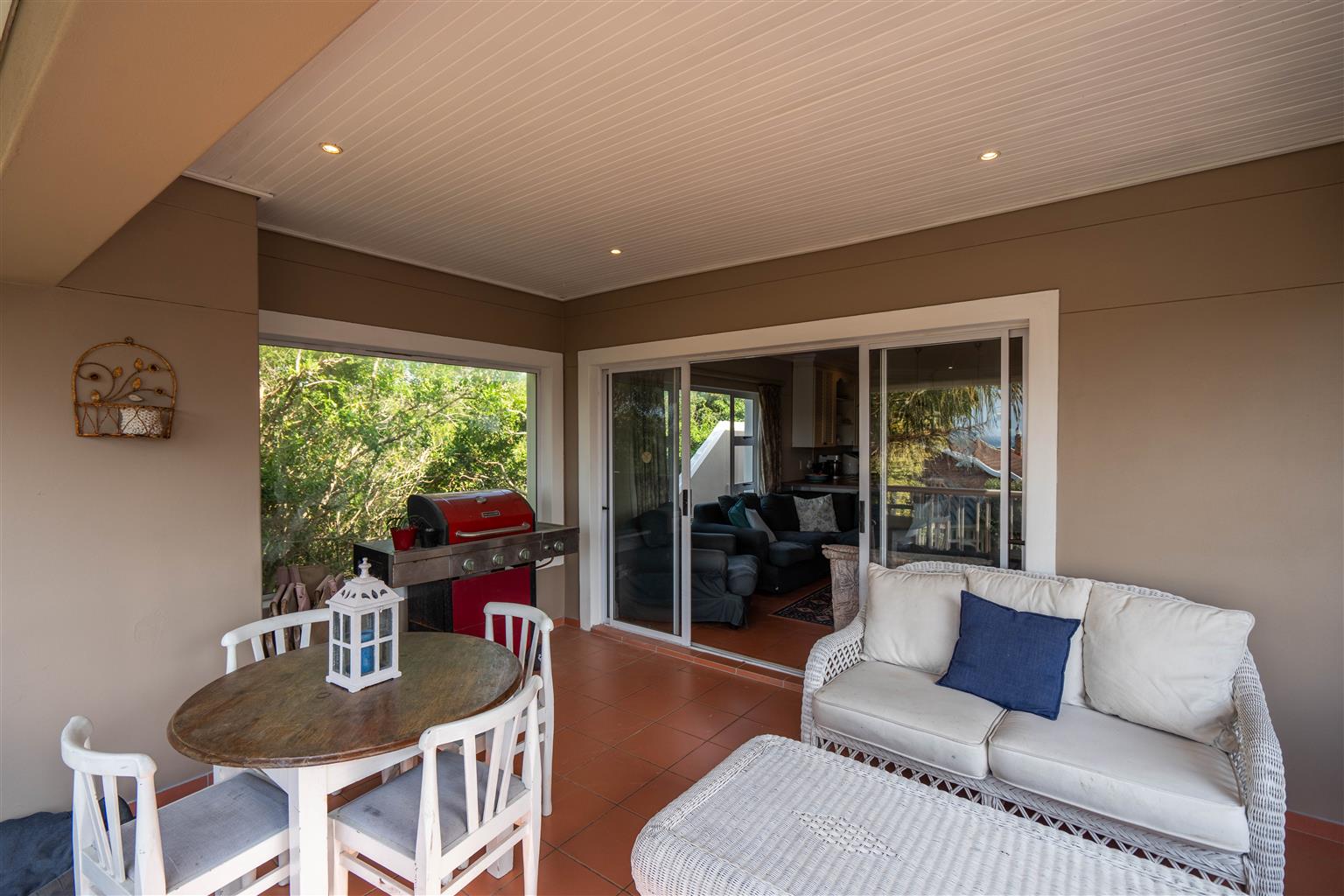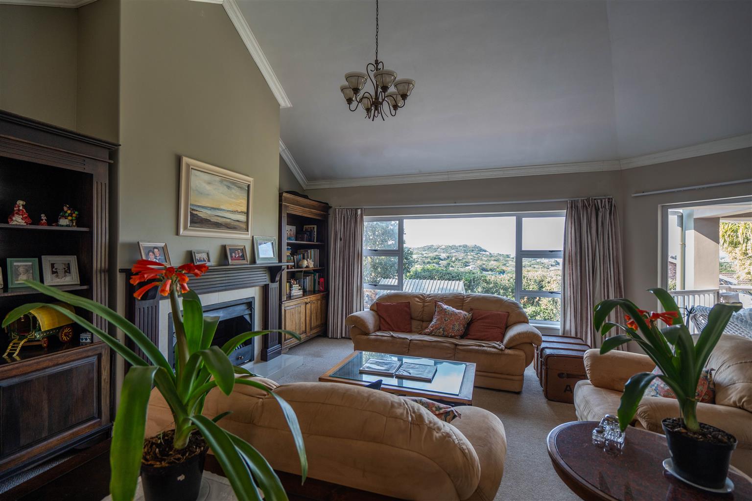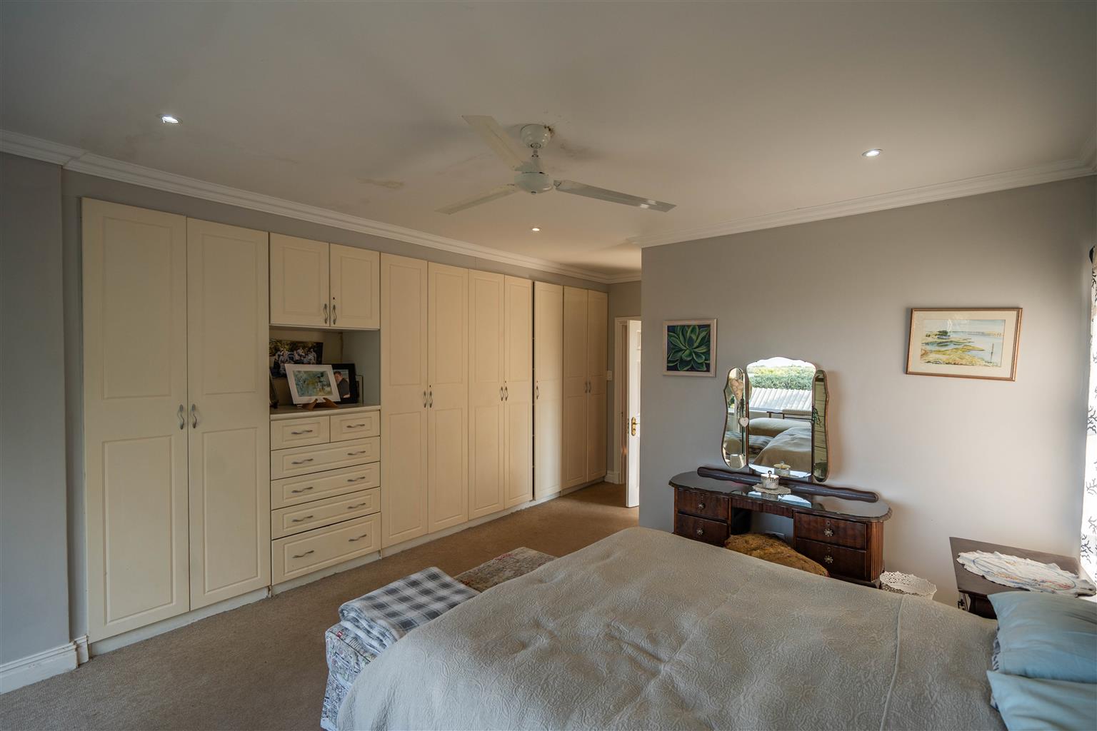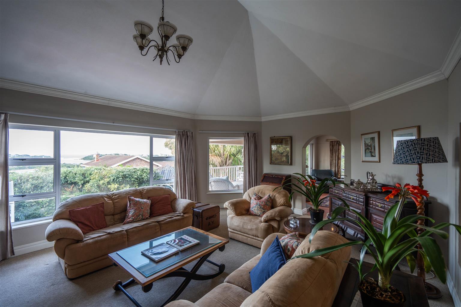 A hallway with dining room on the right of the entrance, leading into a comfortable lounge, superb views. Next to the lounge an open plan TV lounge, kitchen and scullery with enclosed washline area at the back of the home. The TV lounge leads onto a balcony with views of the beautiful garden and pool. A fireplace in the lounge and TV area, perfect for chilly evenings. The double garage leads onto the top floor landing, easily accessible.