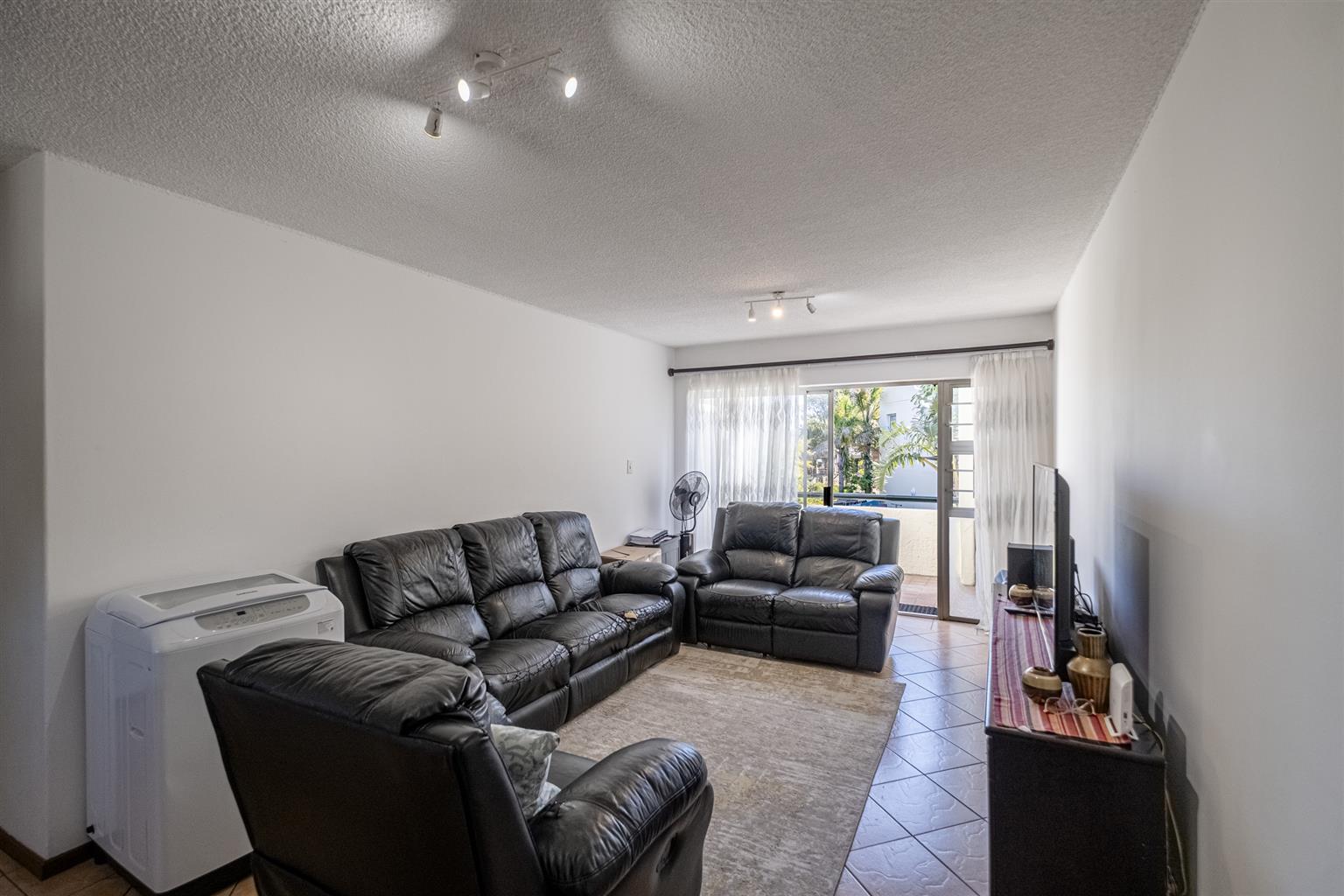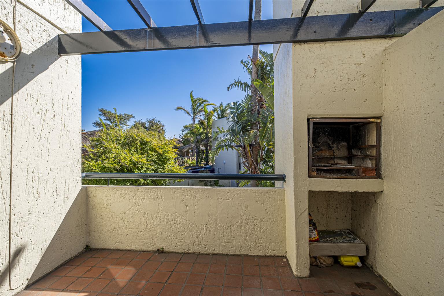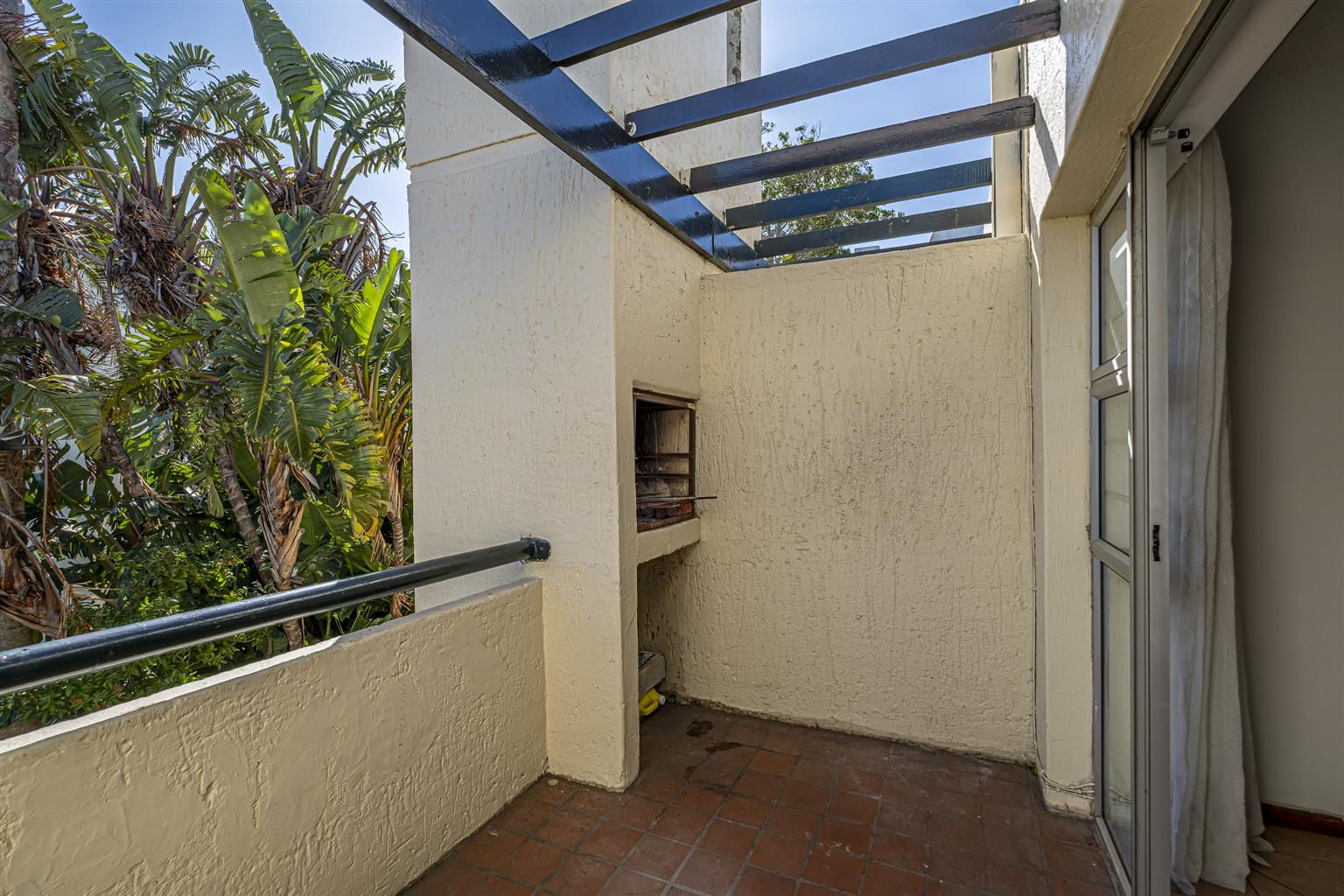 Spacious living area opening onto a balcony with built in braai, overlooking picturesque communal garden