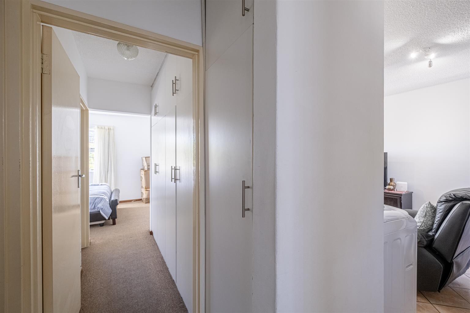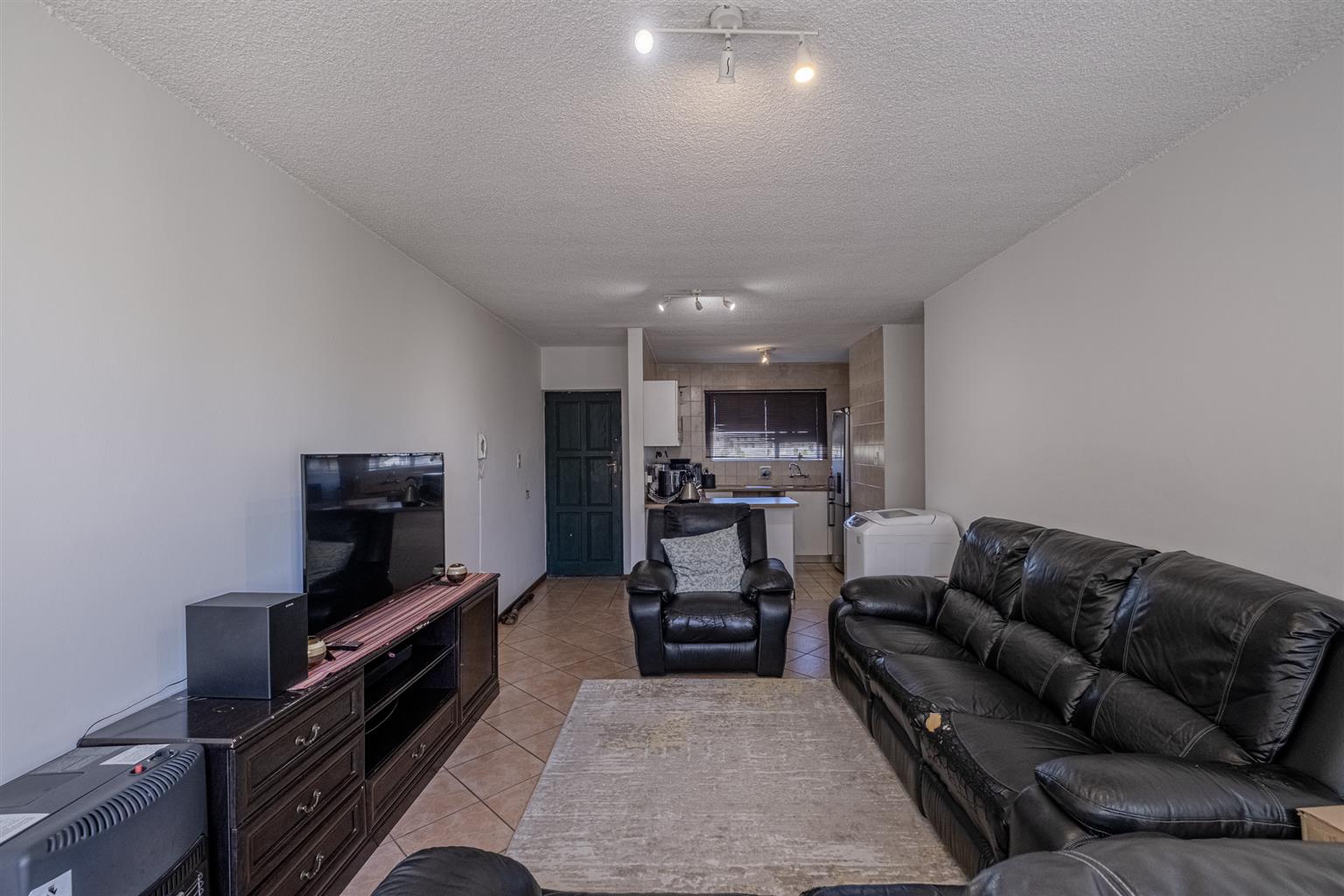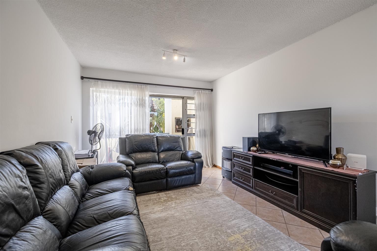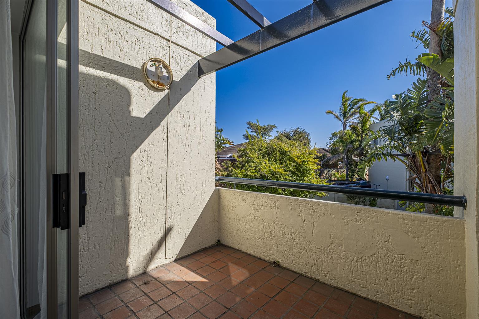 Spacious living area opening onto a balcony with built in braai, overlooking picturesque communal garden