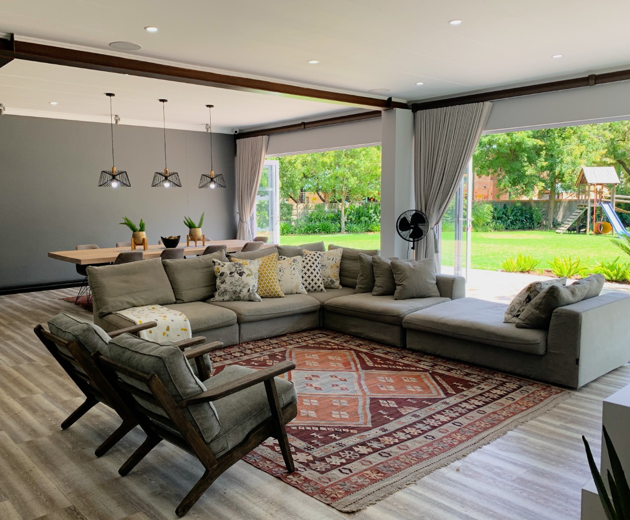 The open-plan layout seamlessly integrates a lounge, dining room, and a modern kitchen adorned with granite countertops and a premium SMEG gas stove. A scullery and laundry room add utilitarian elegance to these living spaces. Transitioning effortlessly from the interior is a spacious backyard, adorned with a meticulously manicured garden, a glistening pool, and ample space for familial recreation.