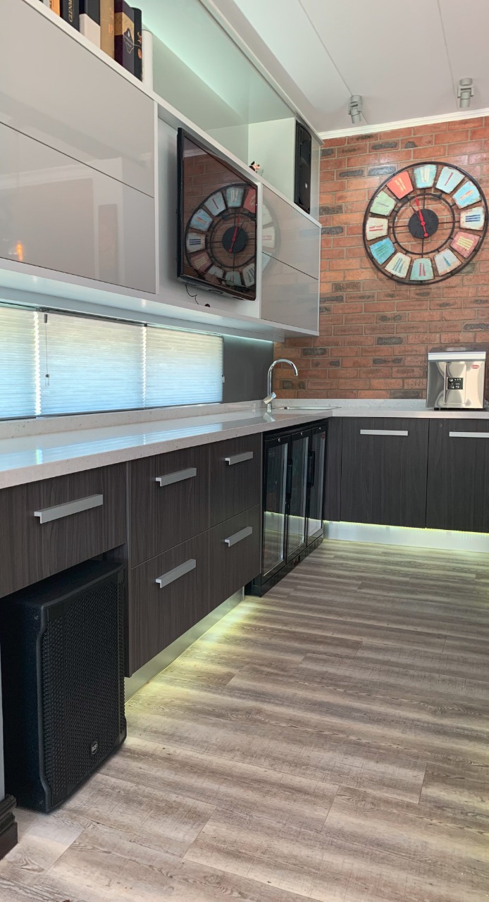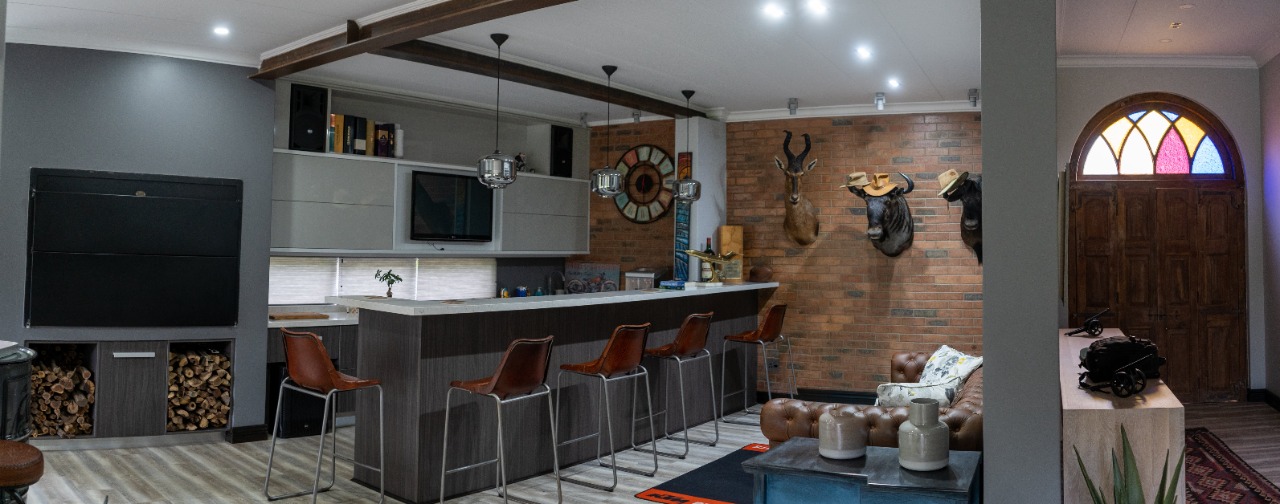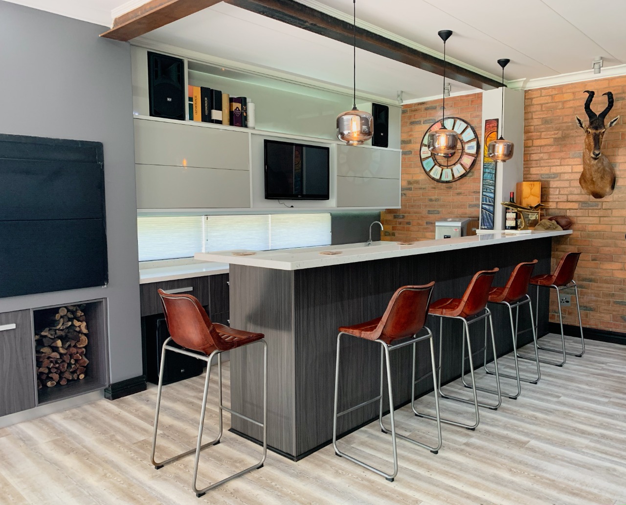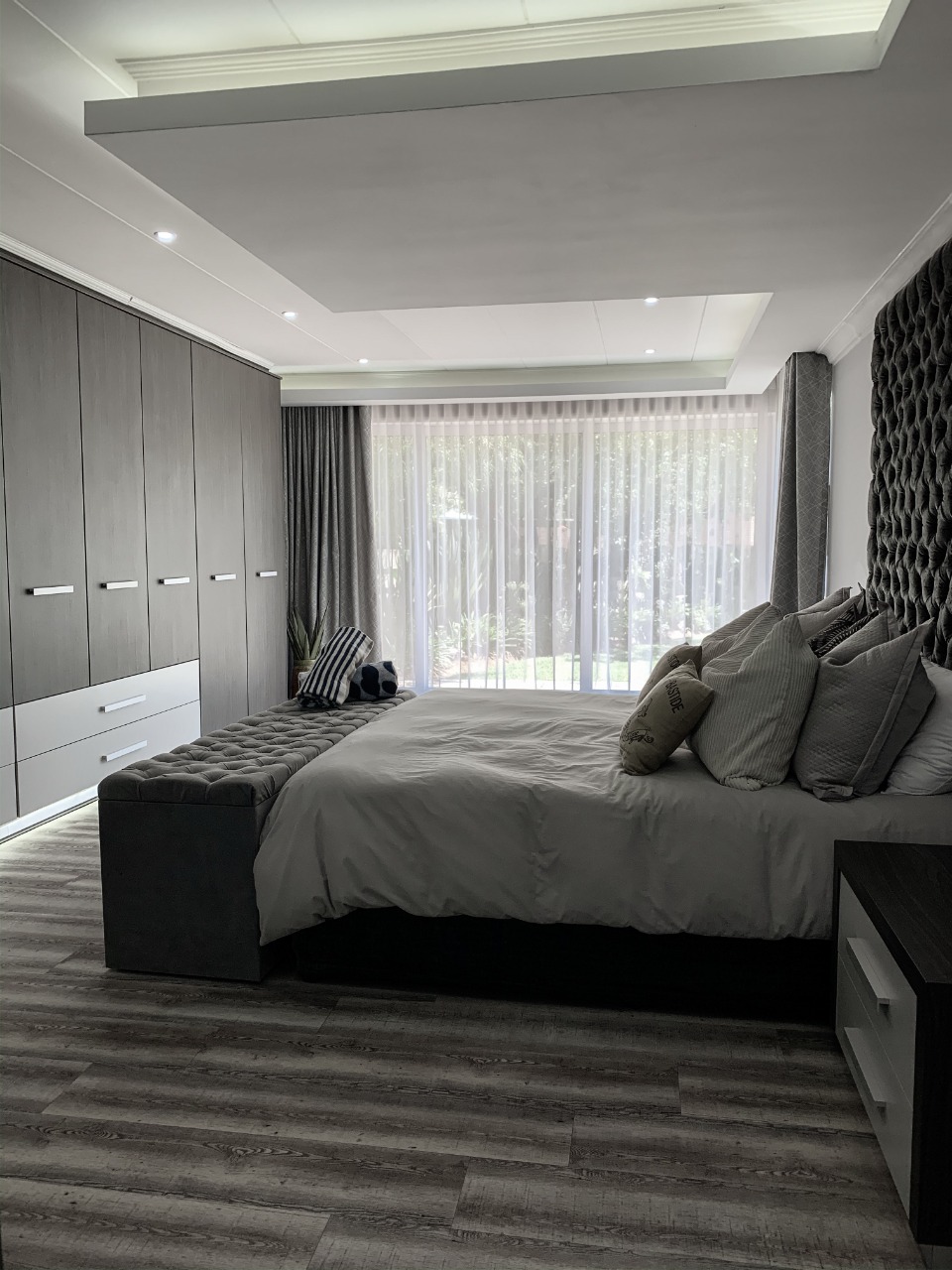 Entertain in style within the bespoke entertainment area, complete with a built-in bar, refrigerator, and a braai enclave, seamlessly connecting to the expansive backyard. Security is paramount, with features including security mesh screens, an automatic roll-up gate, an alarm system, 12 CCTV cameras, and electric fencing.