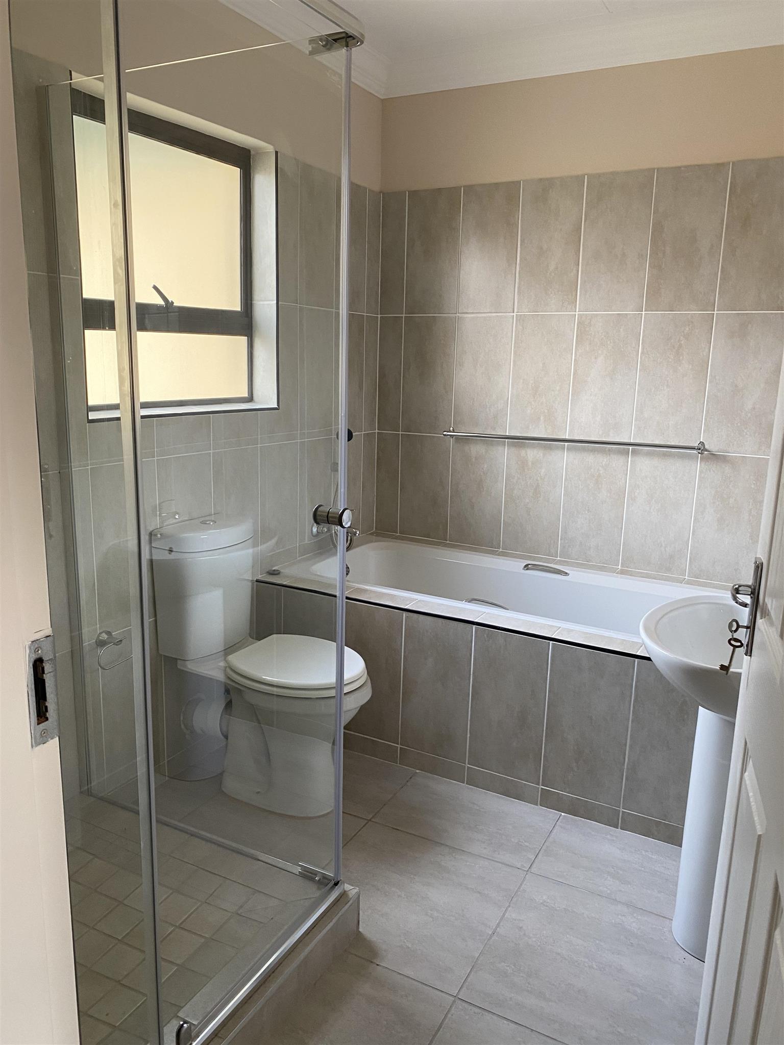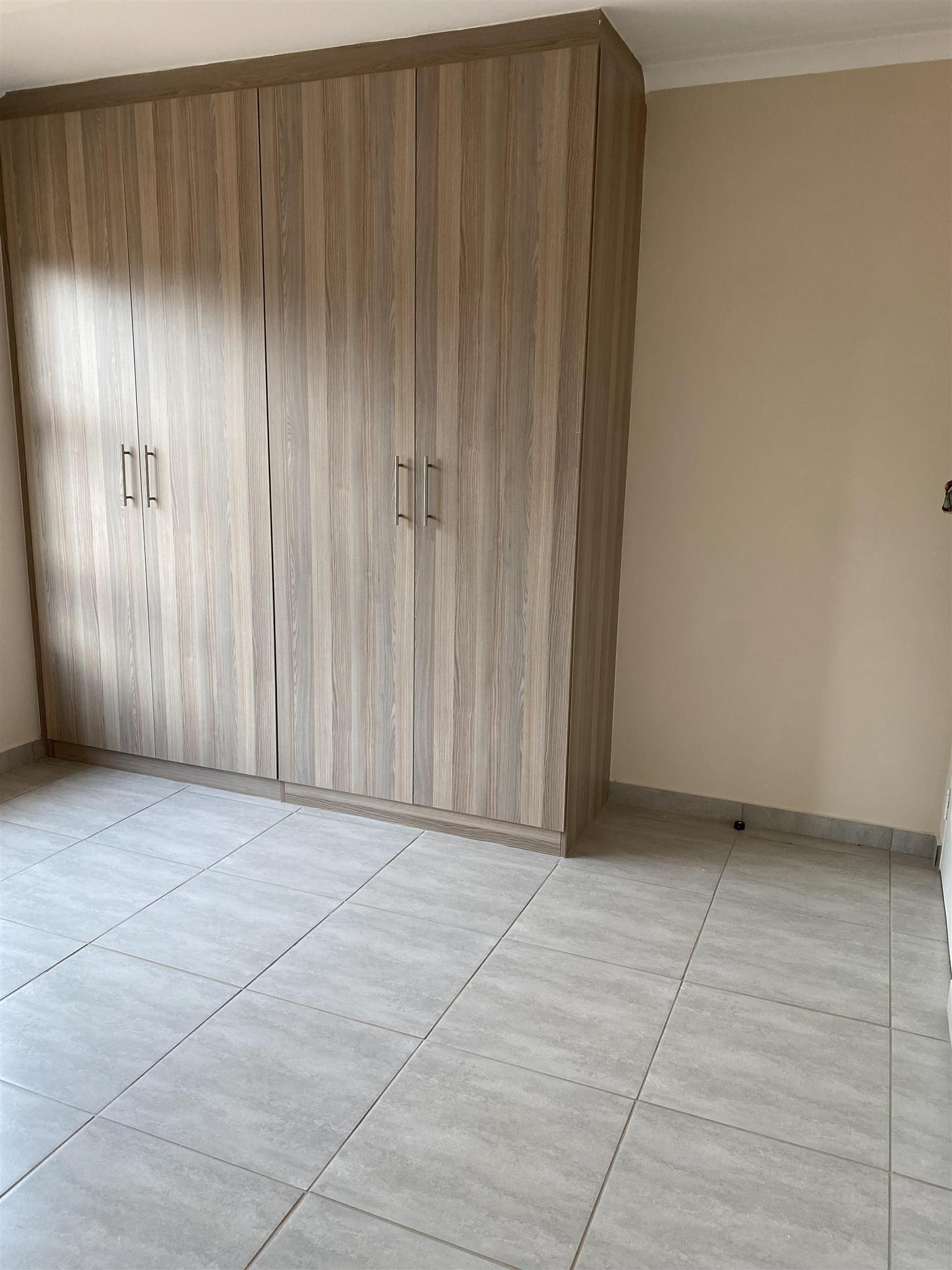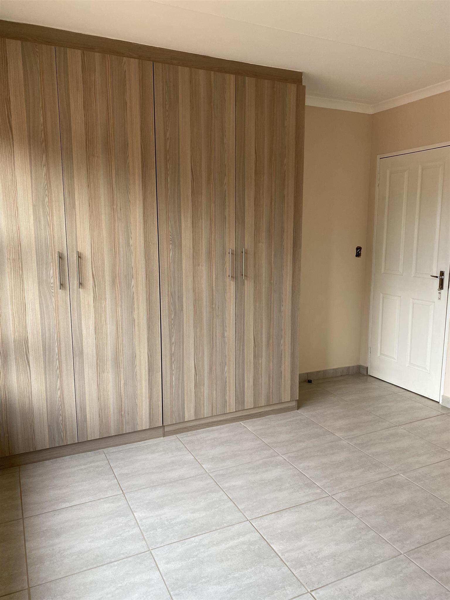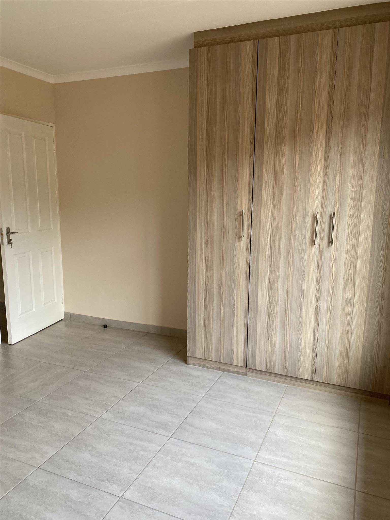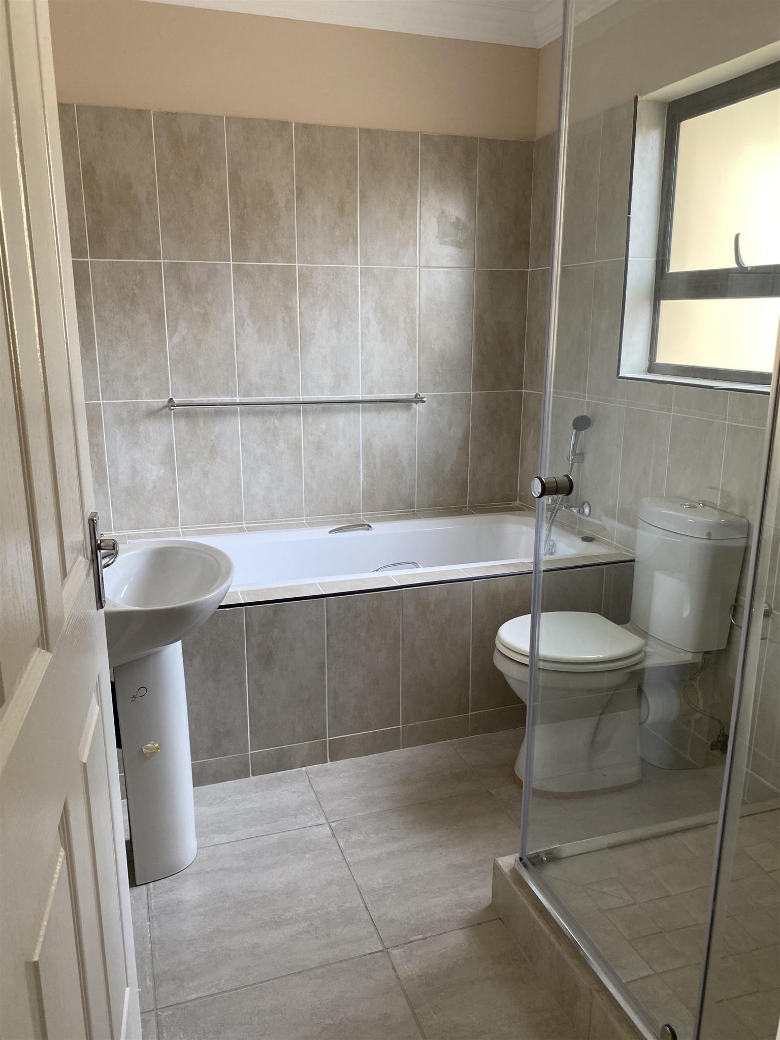 Modern duplex offers open plan kitchen with spacious lounge and guest loo downstairs. Good sized 3 bedrooms with built in cupboards and 2 full bathrooms are upstairs .Duplex has private garden, garage and covered carport . Brand new property includes solar system and solar geyser. Water and electricity are prepaid.
