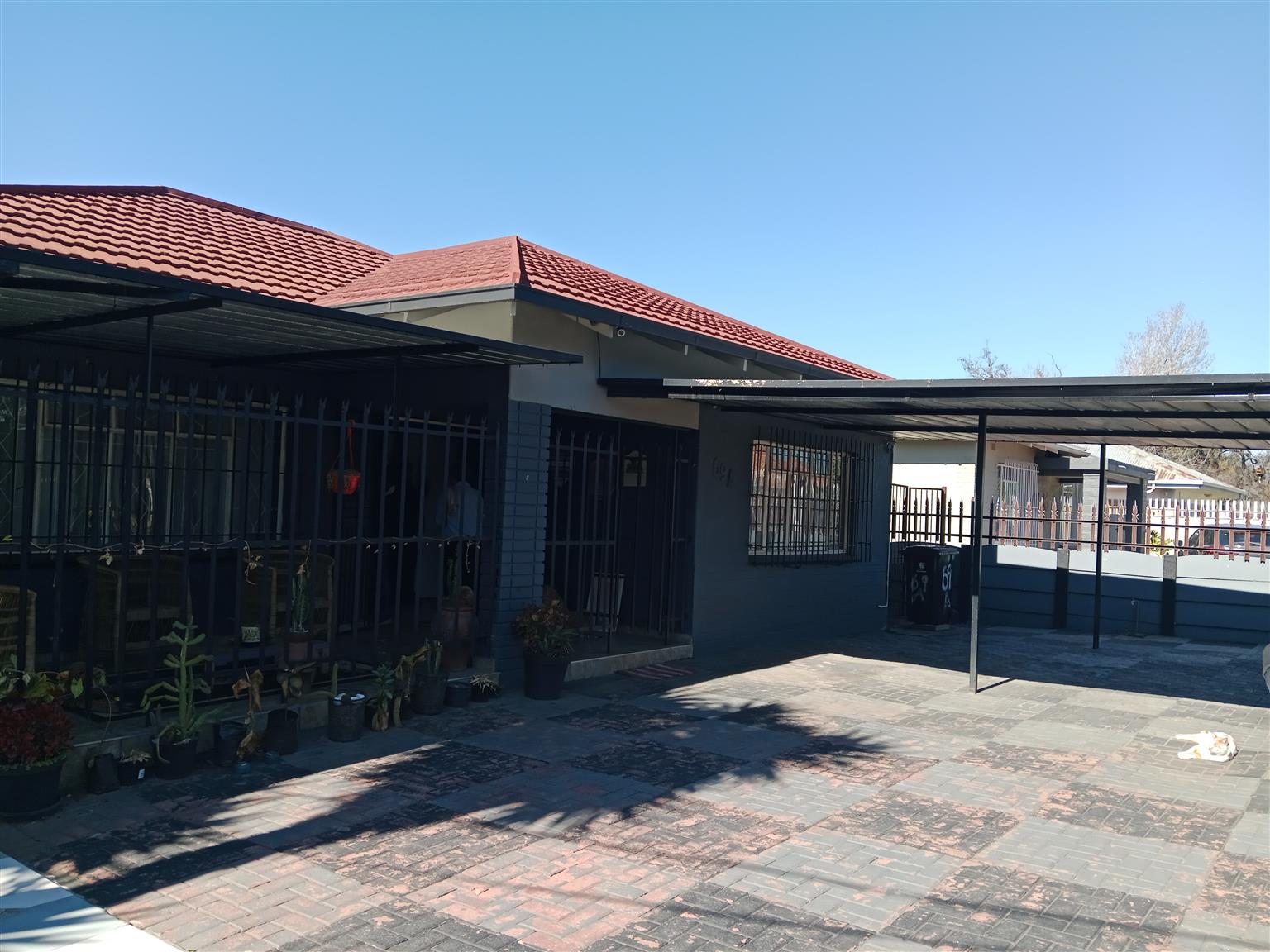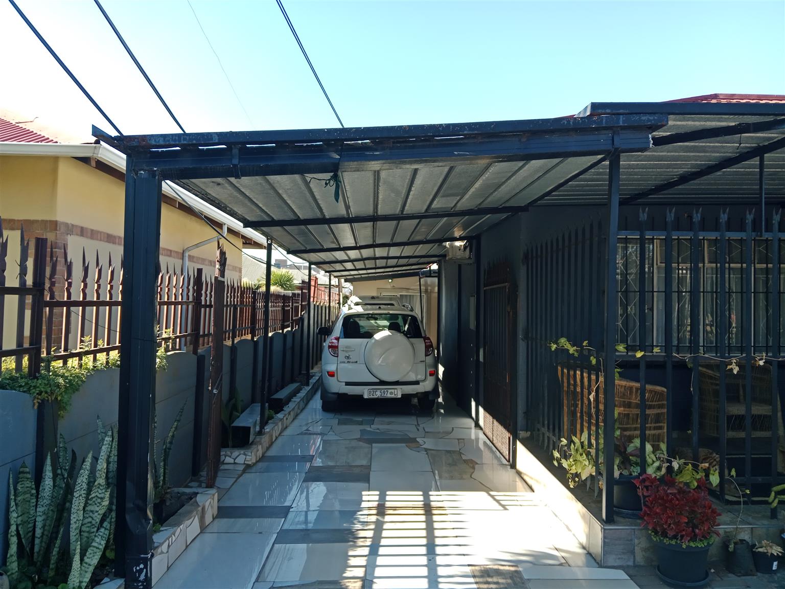 The modern kitchen is well-appointed with plenty of storage for all your culinary needs, making it ideal for family meals or entertaining guests. The exterior boasts a large carport that accommodates three vehicles, a second carport for two additional cars, and secure open parking for visitors.