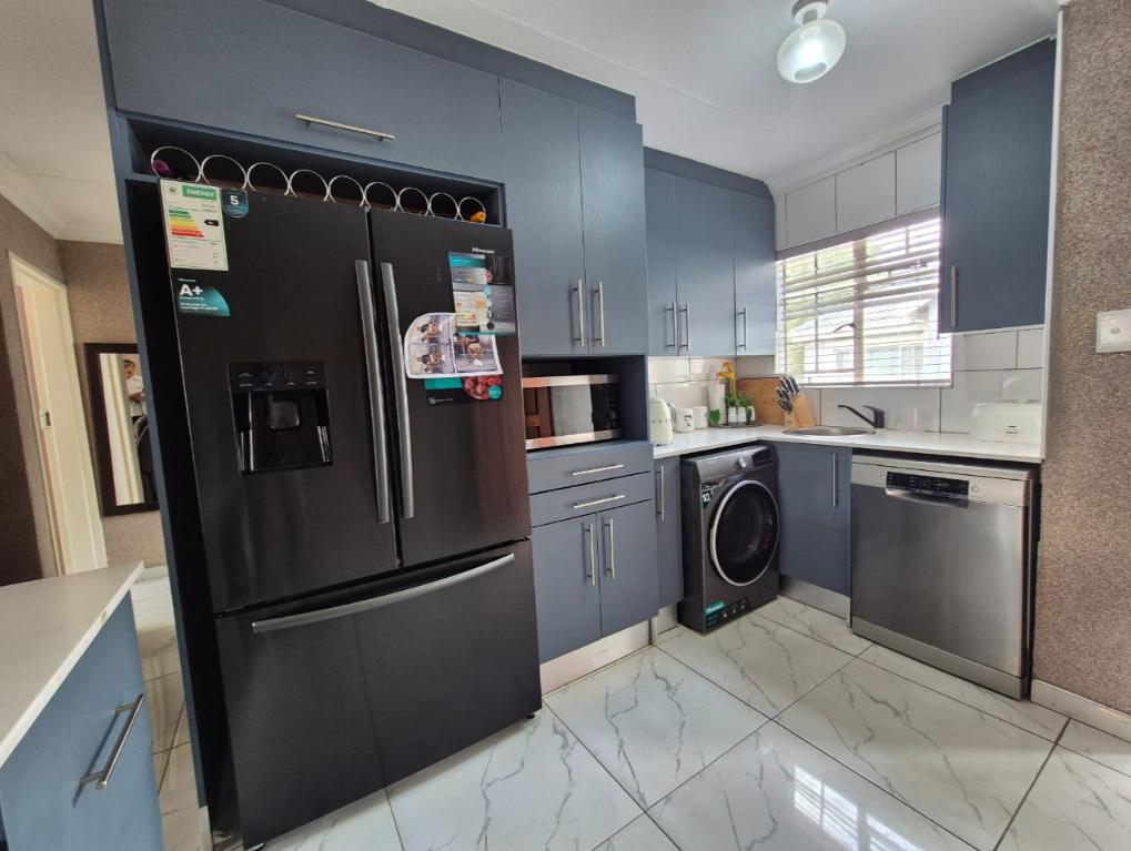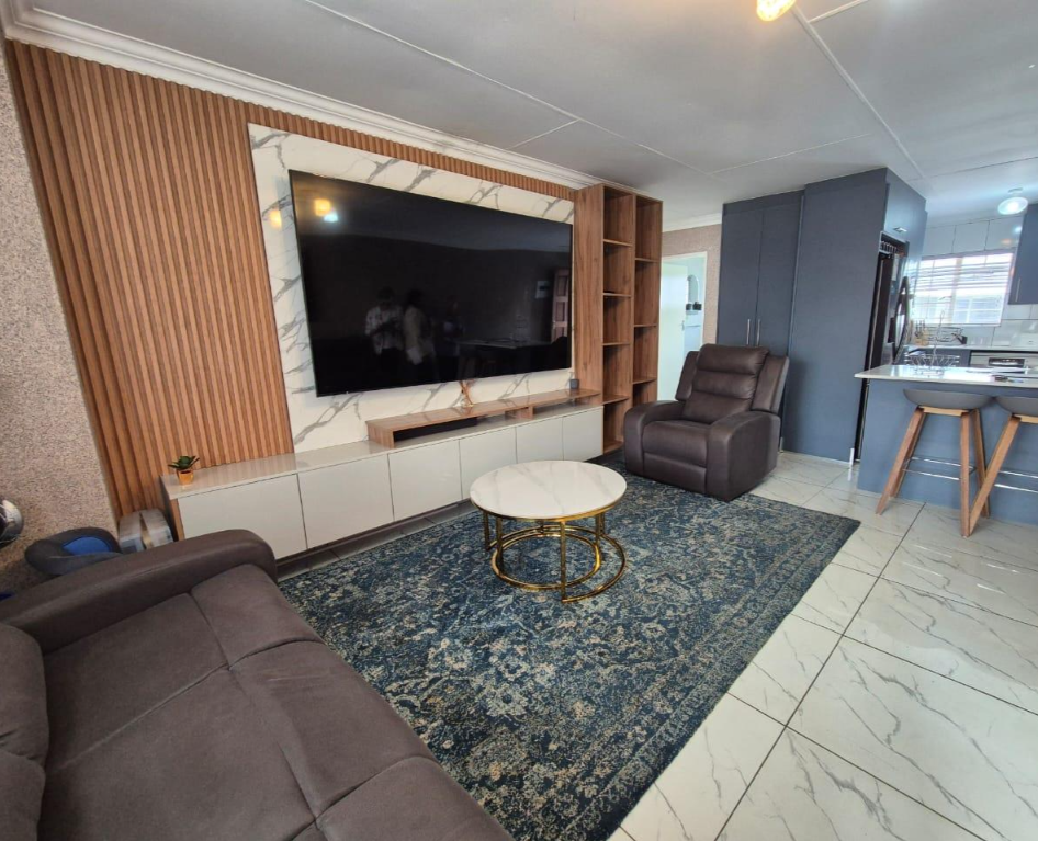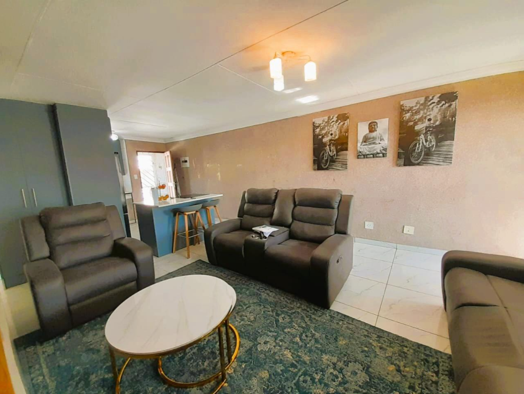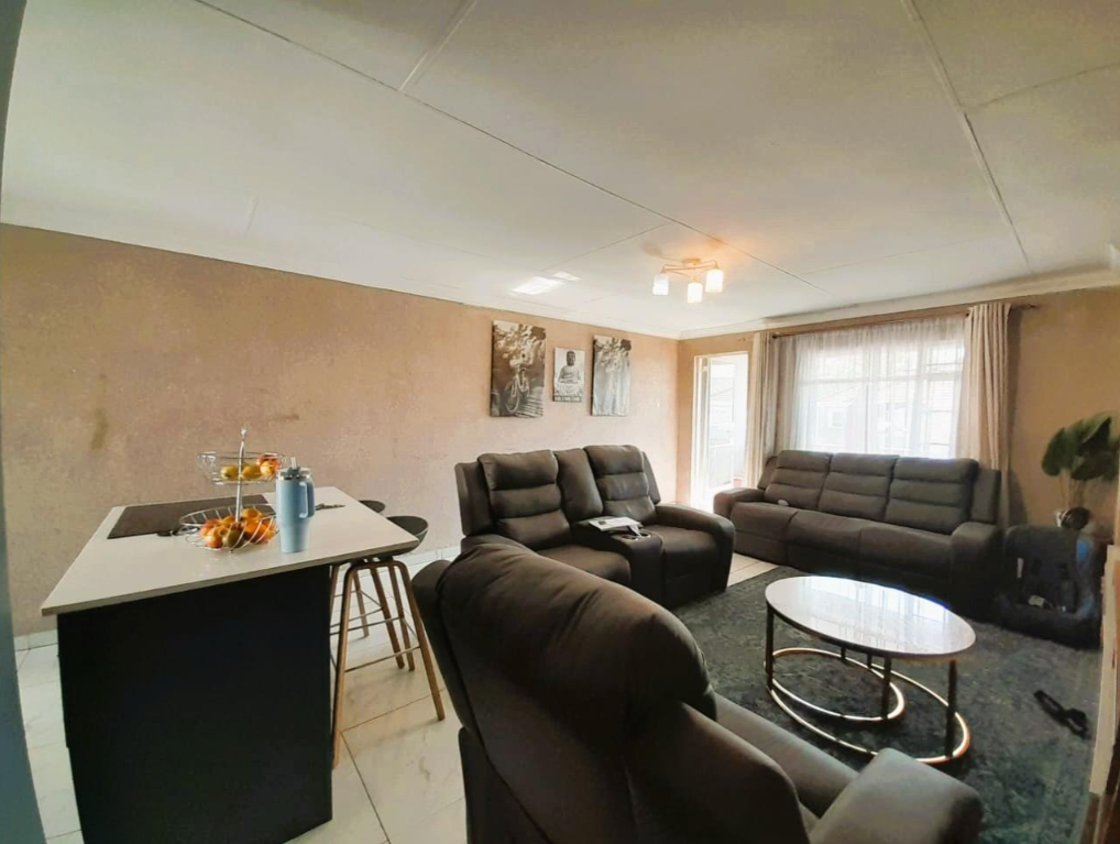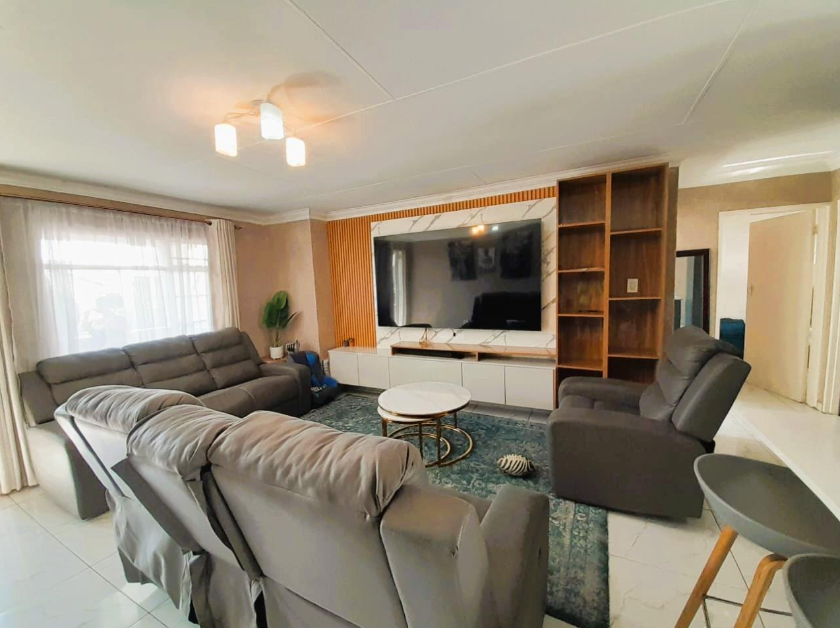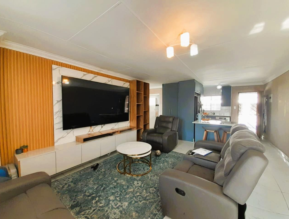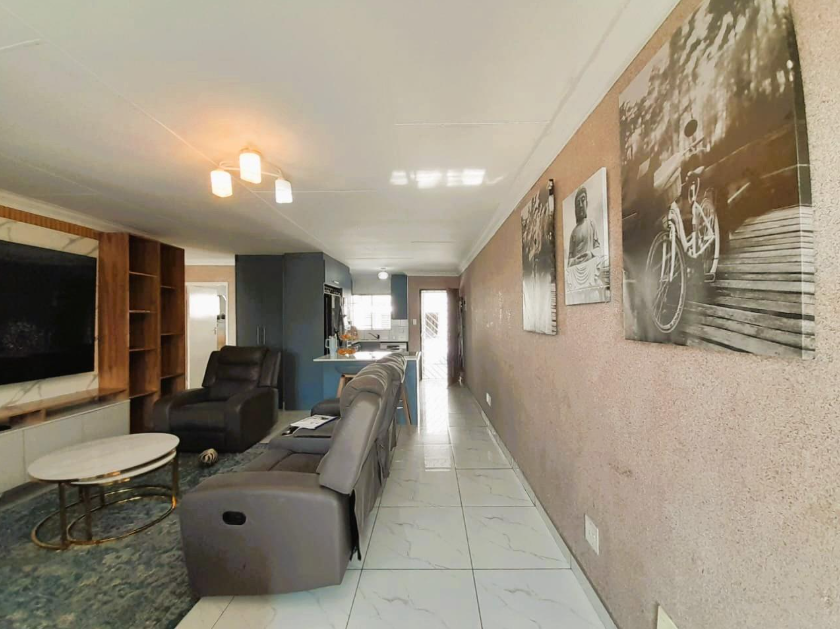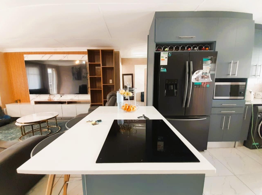 The open-plan living area flows seamlessly between the lounge, dining space, and kitchen. The kitchen is sleek and functional, featuring built-in cupboards, modern countertops, and space for essential appliances. Tiled floors throughout enhance the clean, contemporary feel.