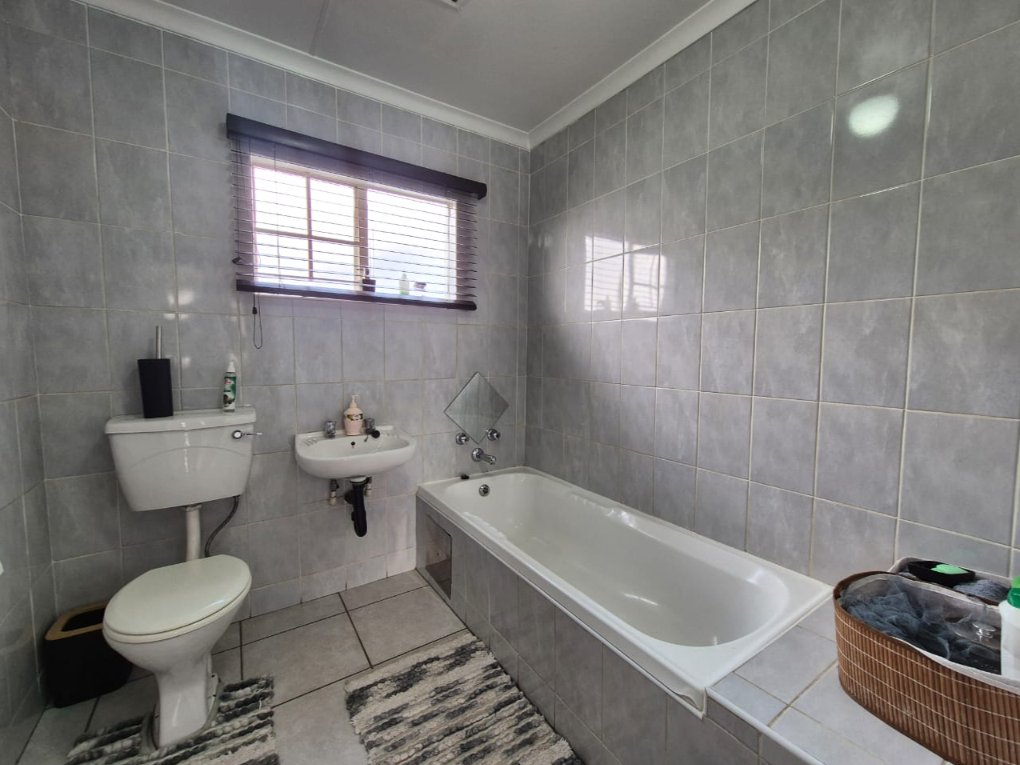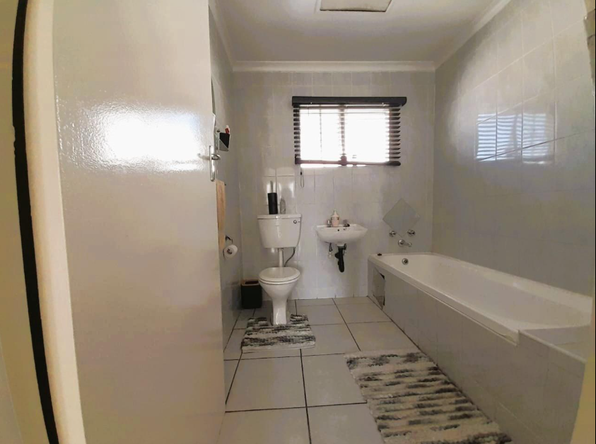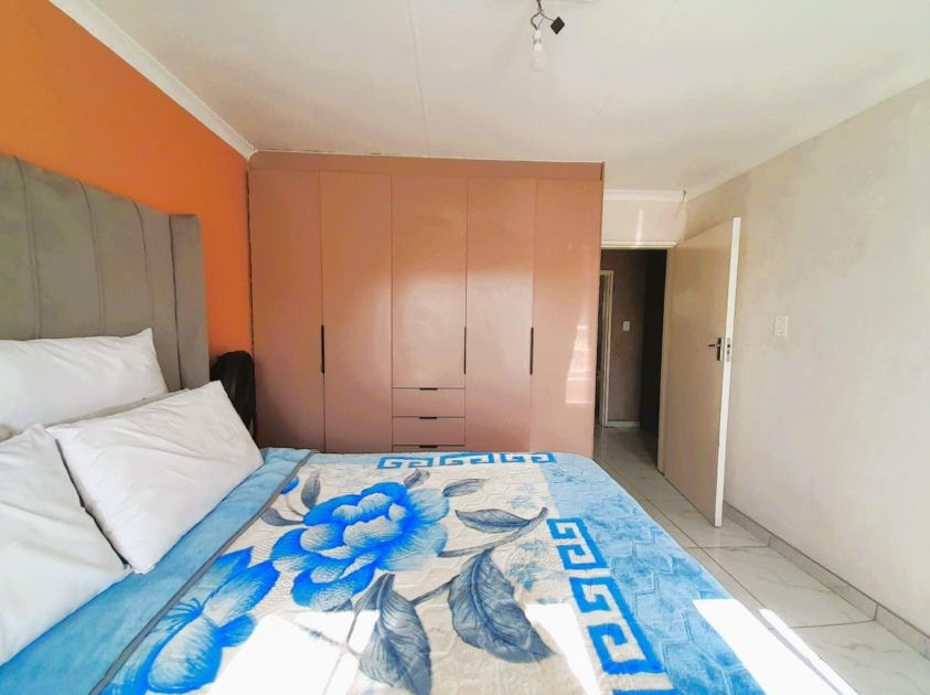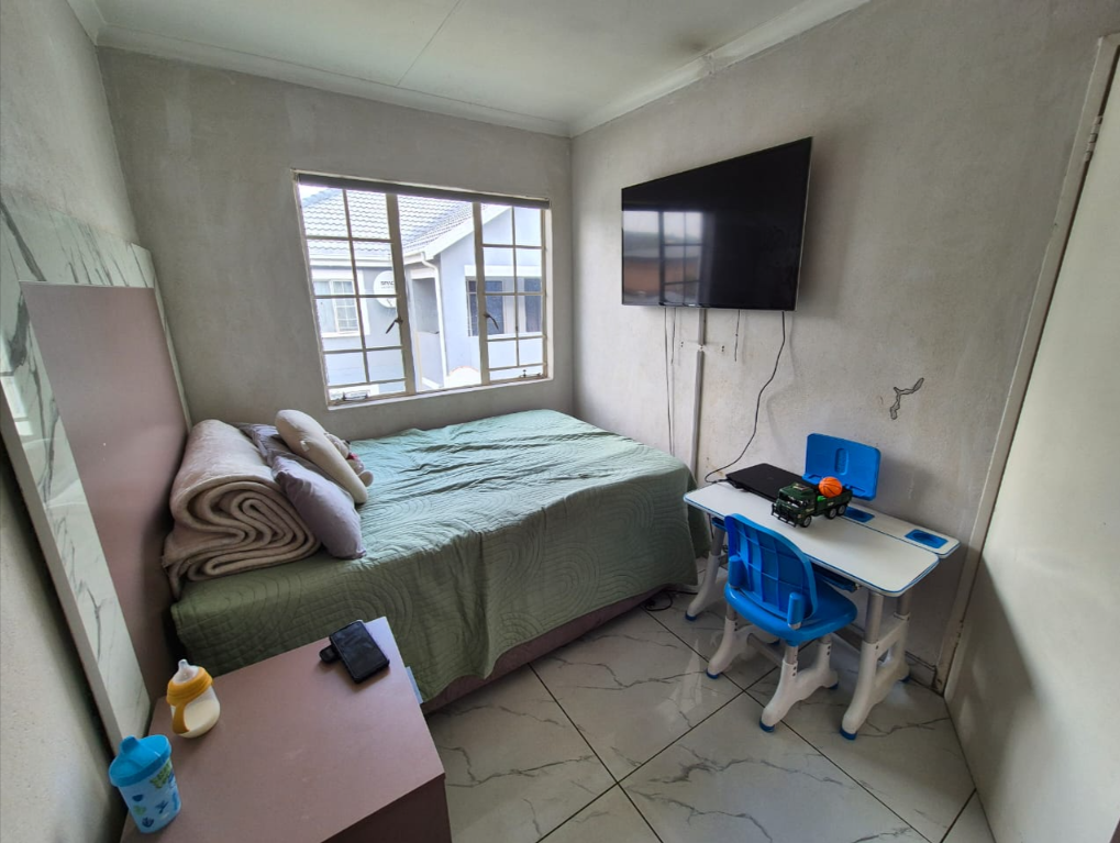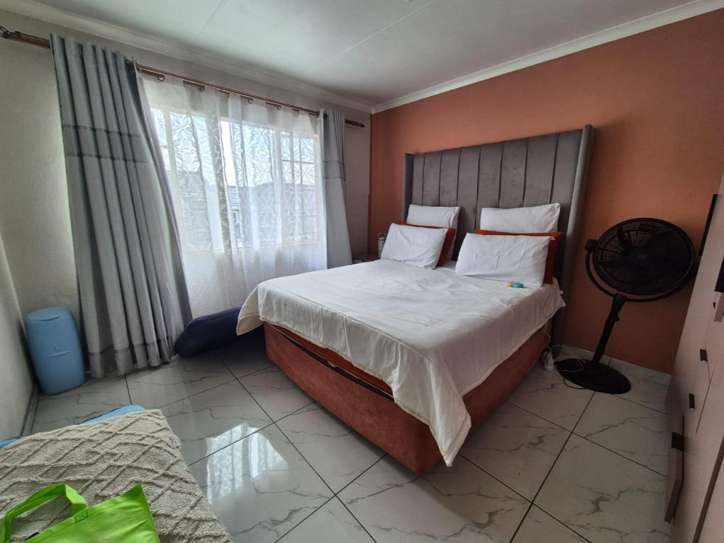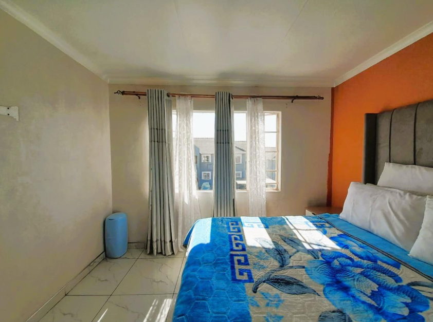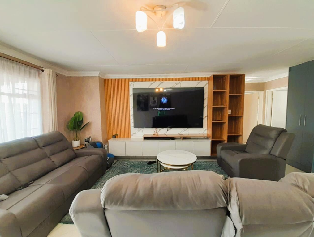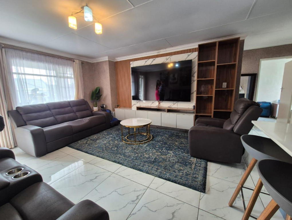 The open-plan living area flows seamlessly between the lounge, dining space, and kitchen. The kitchen is sleek and functional, featuring built-in cupboards, modern countertops, and space for essential appliances. Tiled floors throughout enhance the clean, contemporary feel.