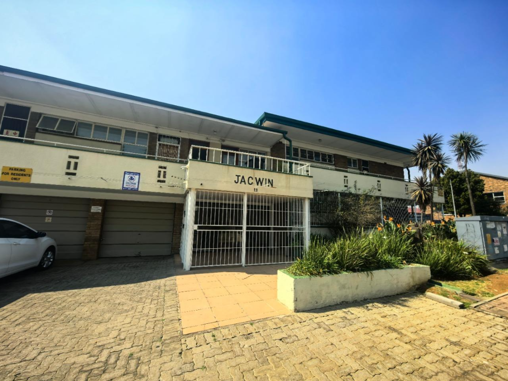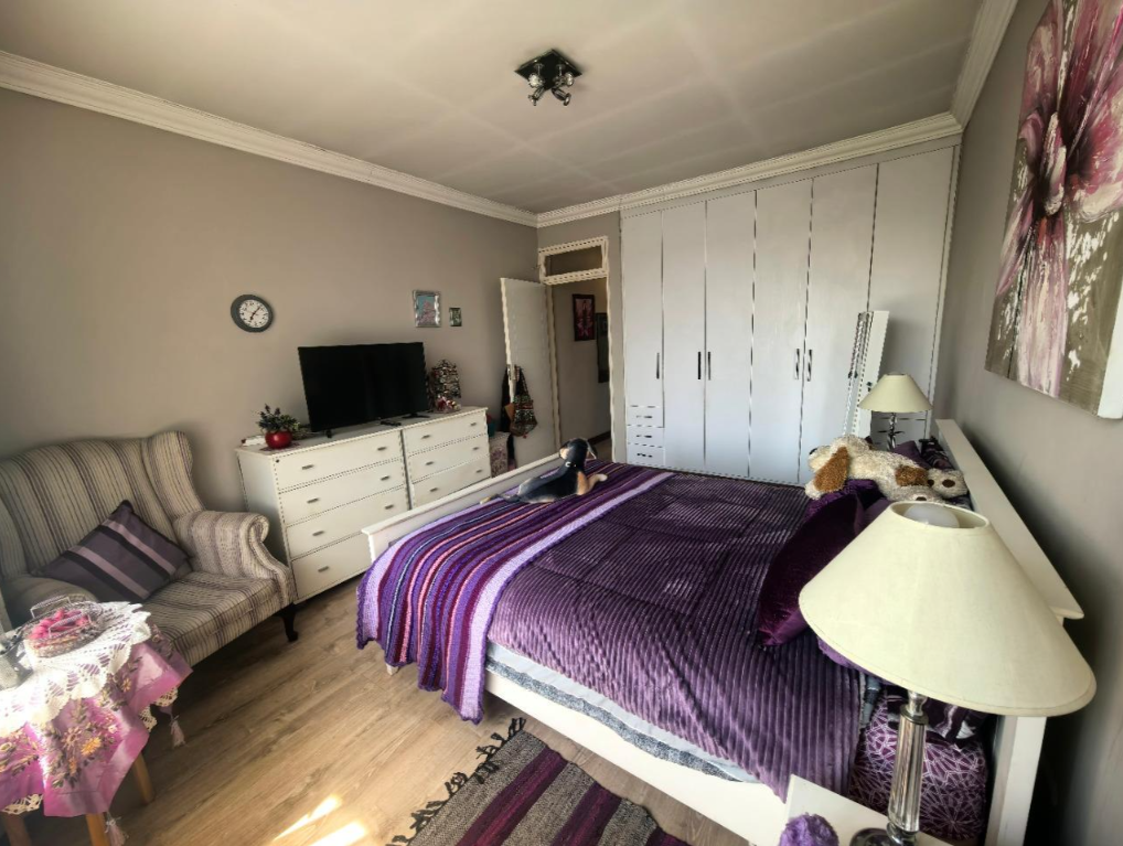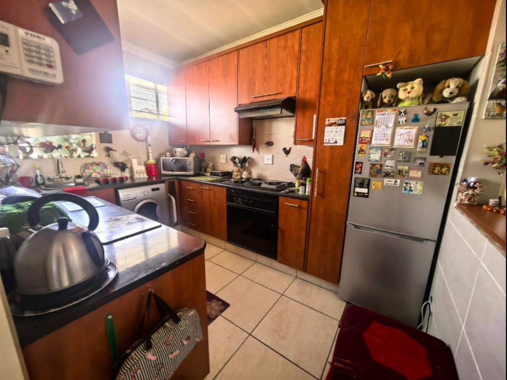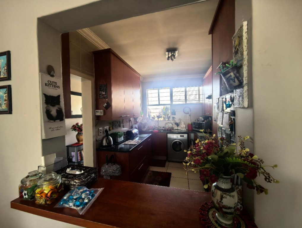 Both bedrooms feature built-in cupboards, and the full bathroom is neat and functional. The unit includes one open parking bay and is securely positioned within a complex fitted with electric fencing.