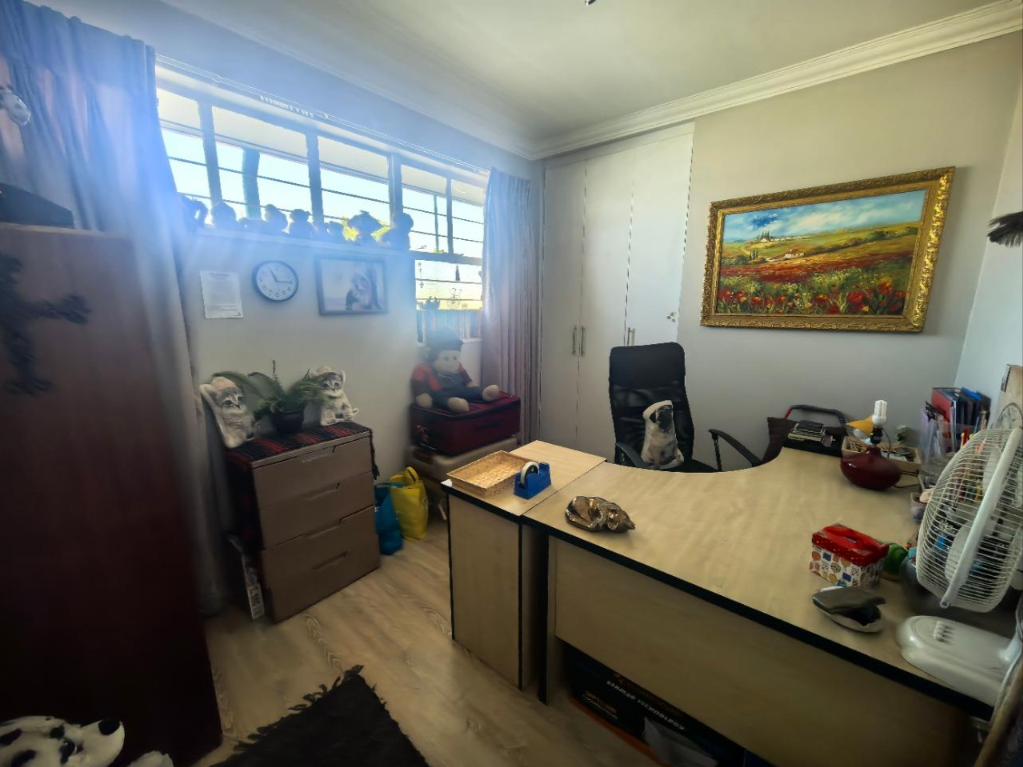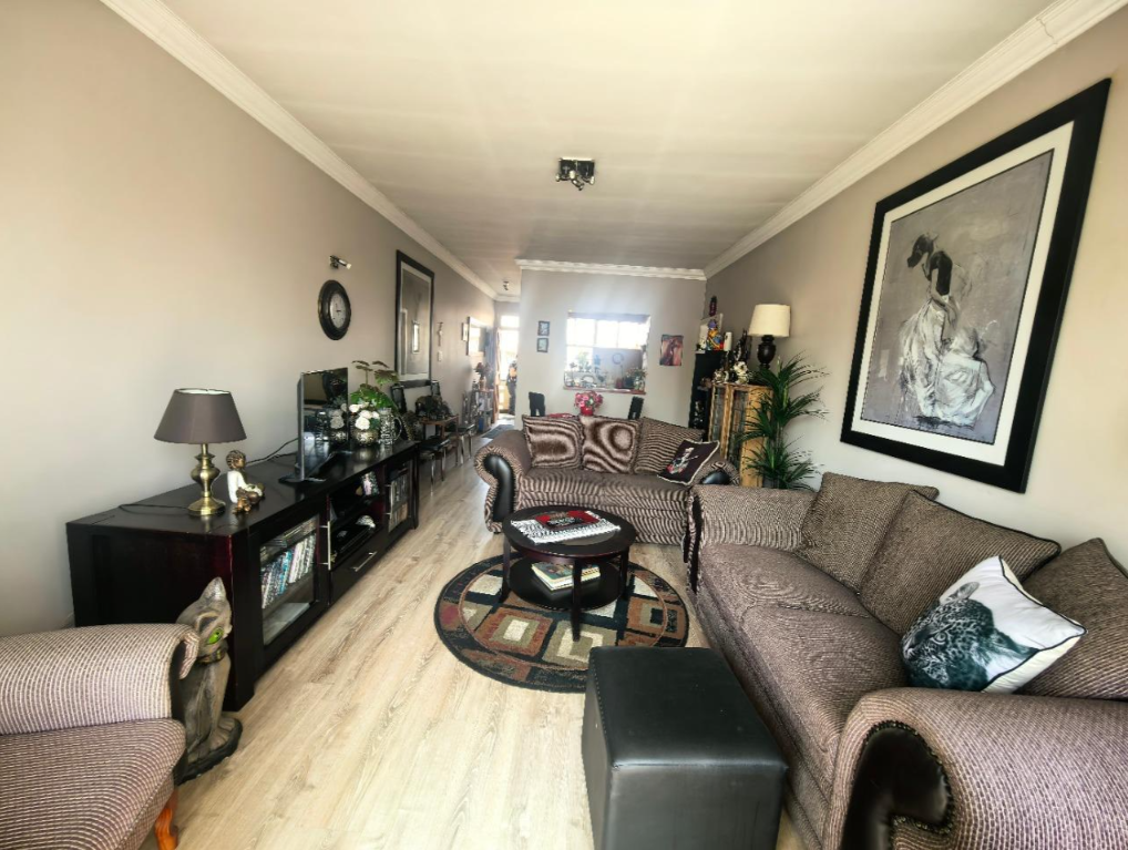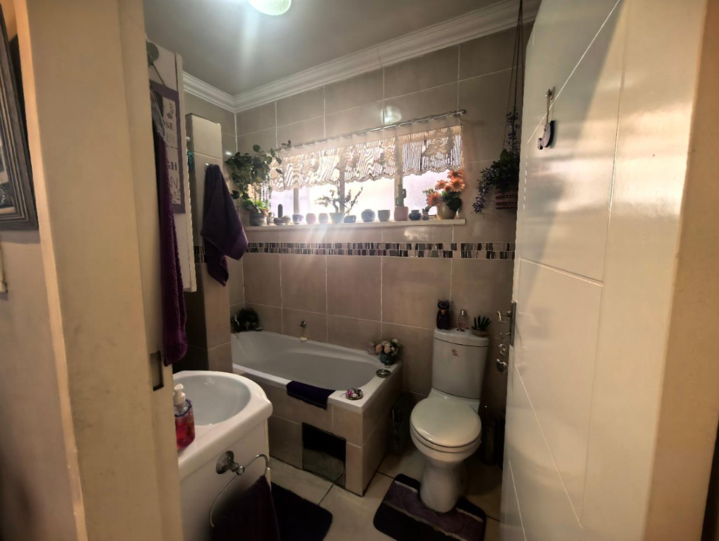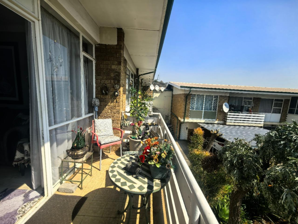 Both bedrooms feature built-in cupboards, and the full bathroom is neat and functional. The unit includes one open parking bay and is securely positioned within a complex fitted with electric fencing.