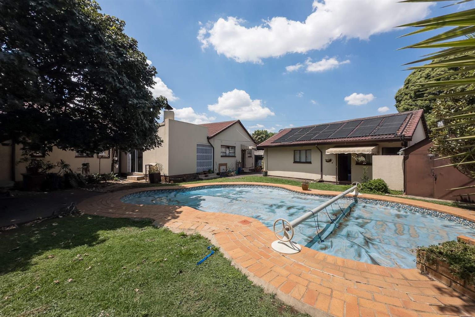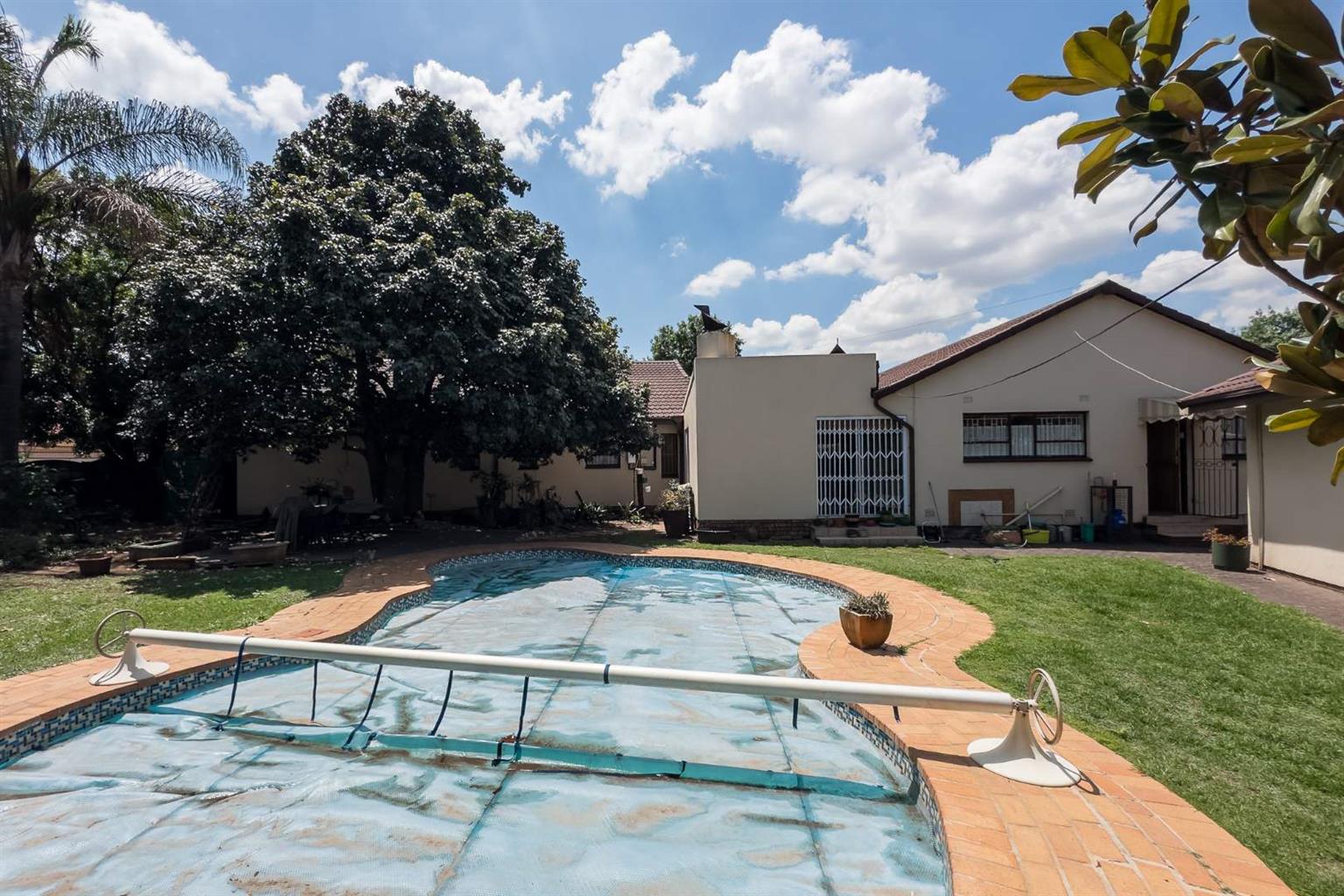Covered patio overlooking a neat garden & sparkling pool