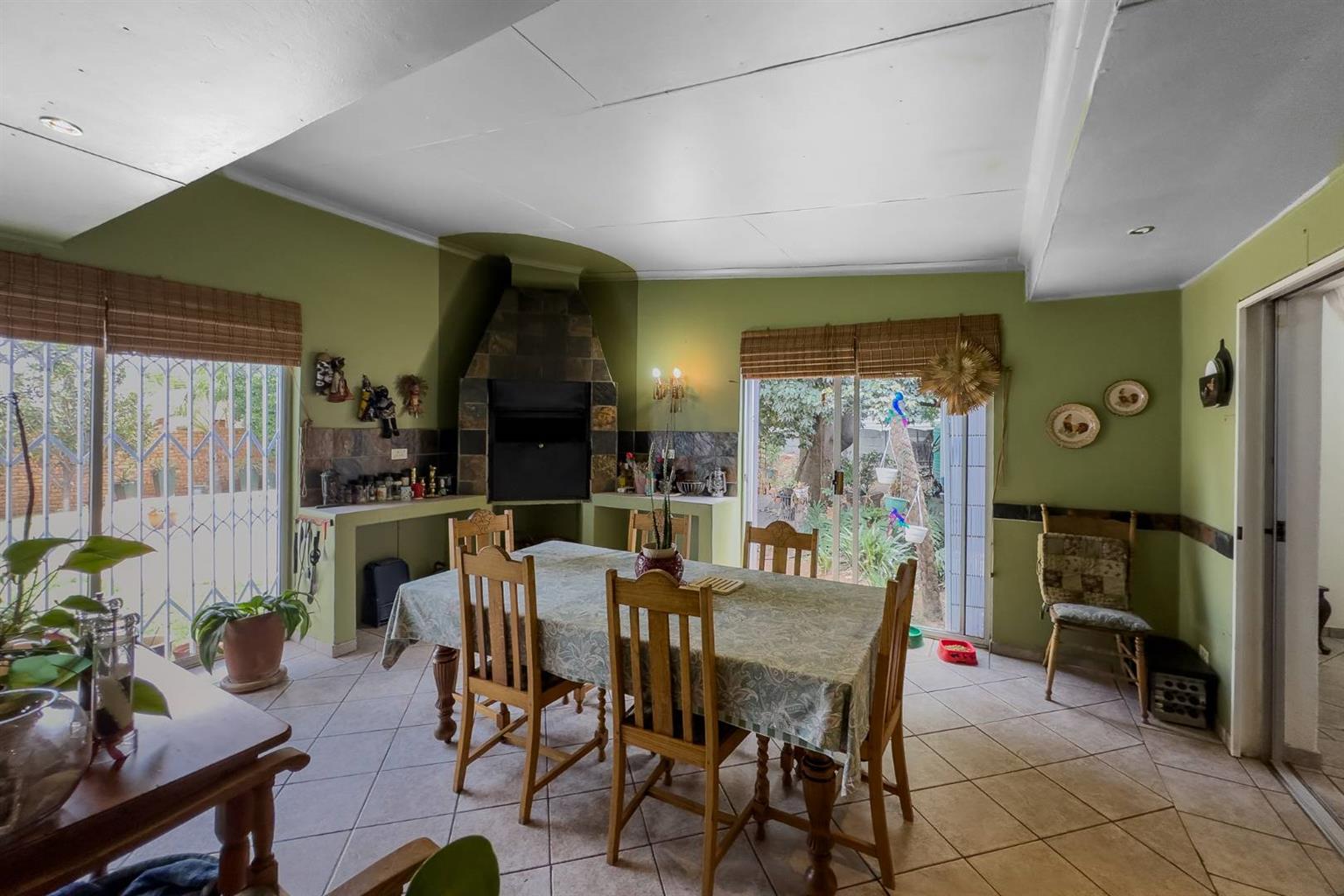 Open-plan lounge & dining area with fireplace