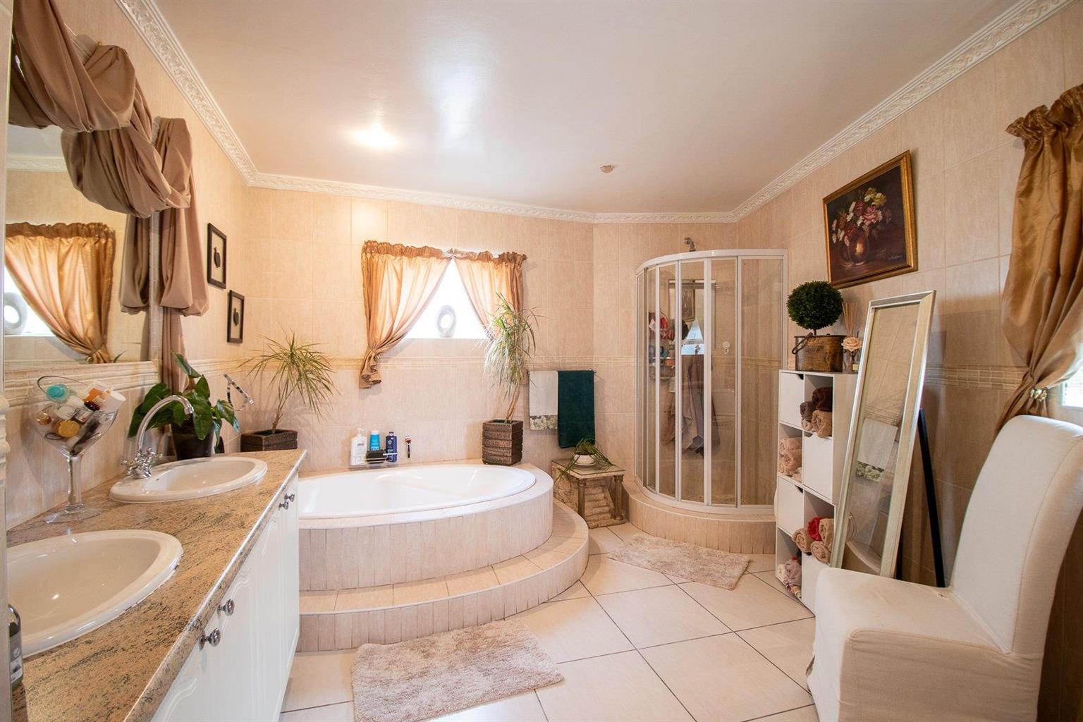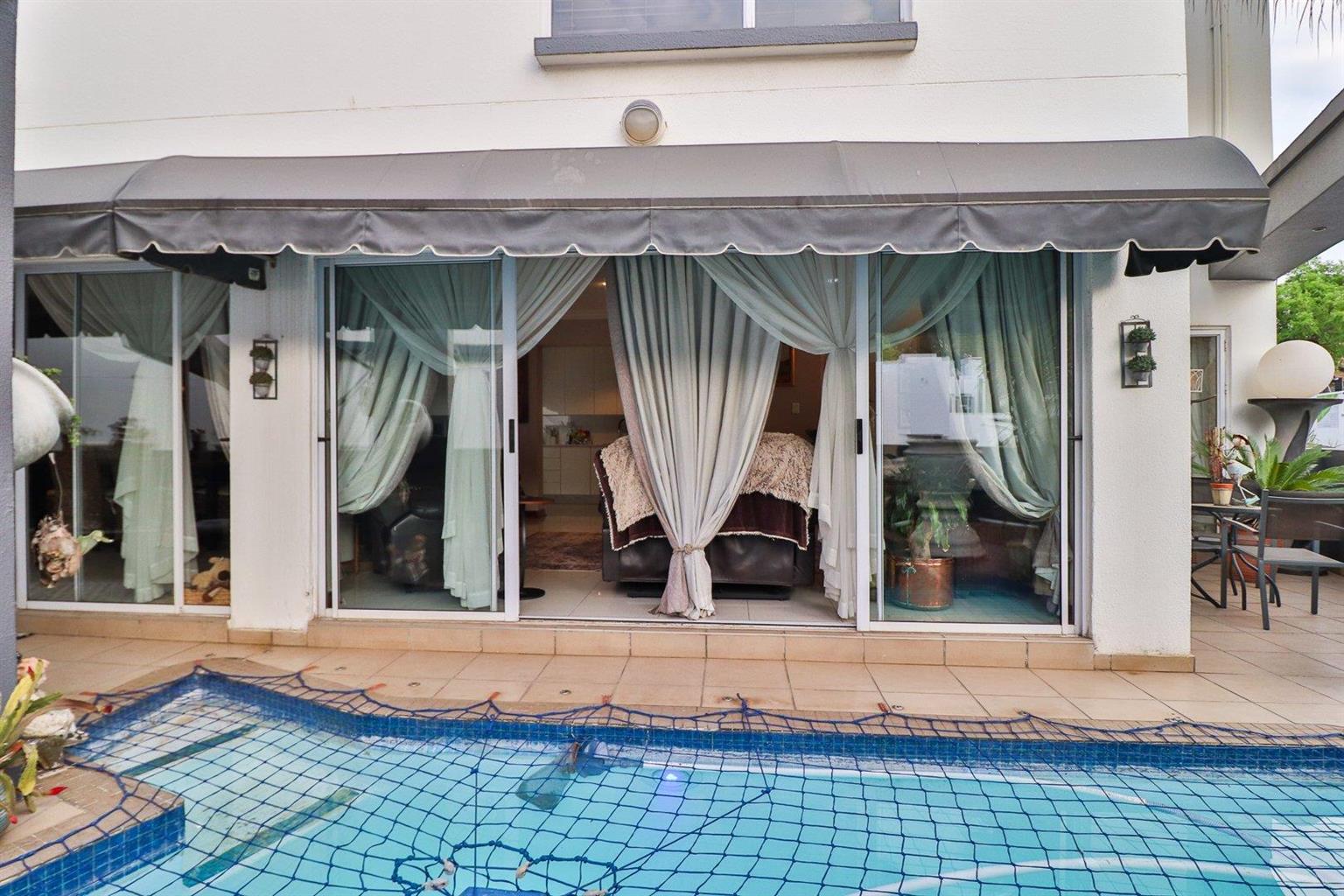 Upon entering, you are greeted by a sun-drenched entrance hall that leads to an open-plan lounge and dining area. Bathed in natural light and framed by glass doors, these spaces offer a seamless connection to the outdoors, where a charming patio and splash pool with a safety net await your enjoyment. The heart of the home is its exquisite kitchen, featuring sleek white gloss cupboards, Caesar stone countertops, a 5-plate gas stove, and an electric eye-level oven. There's ample space for a double-door fridge, and the adjoining scullery accommodates three additional appliances. For those who love to entertain, the private bar area and adjacent sunken entertainment room provide the perfect setting, complete with built-in cupboards, a built-in braai, and fitted blinds.