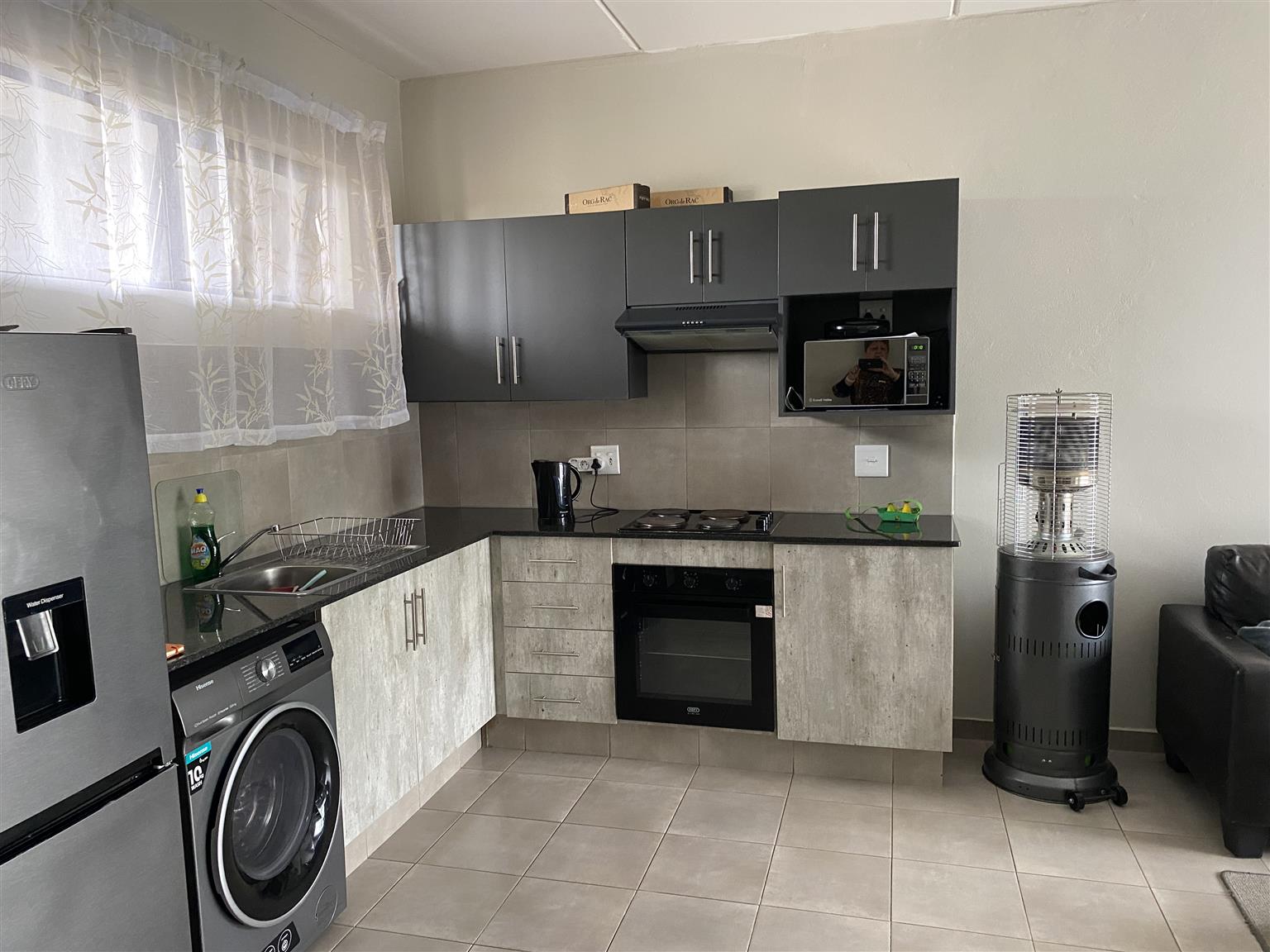 The unit is tiled throughout