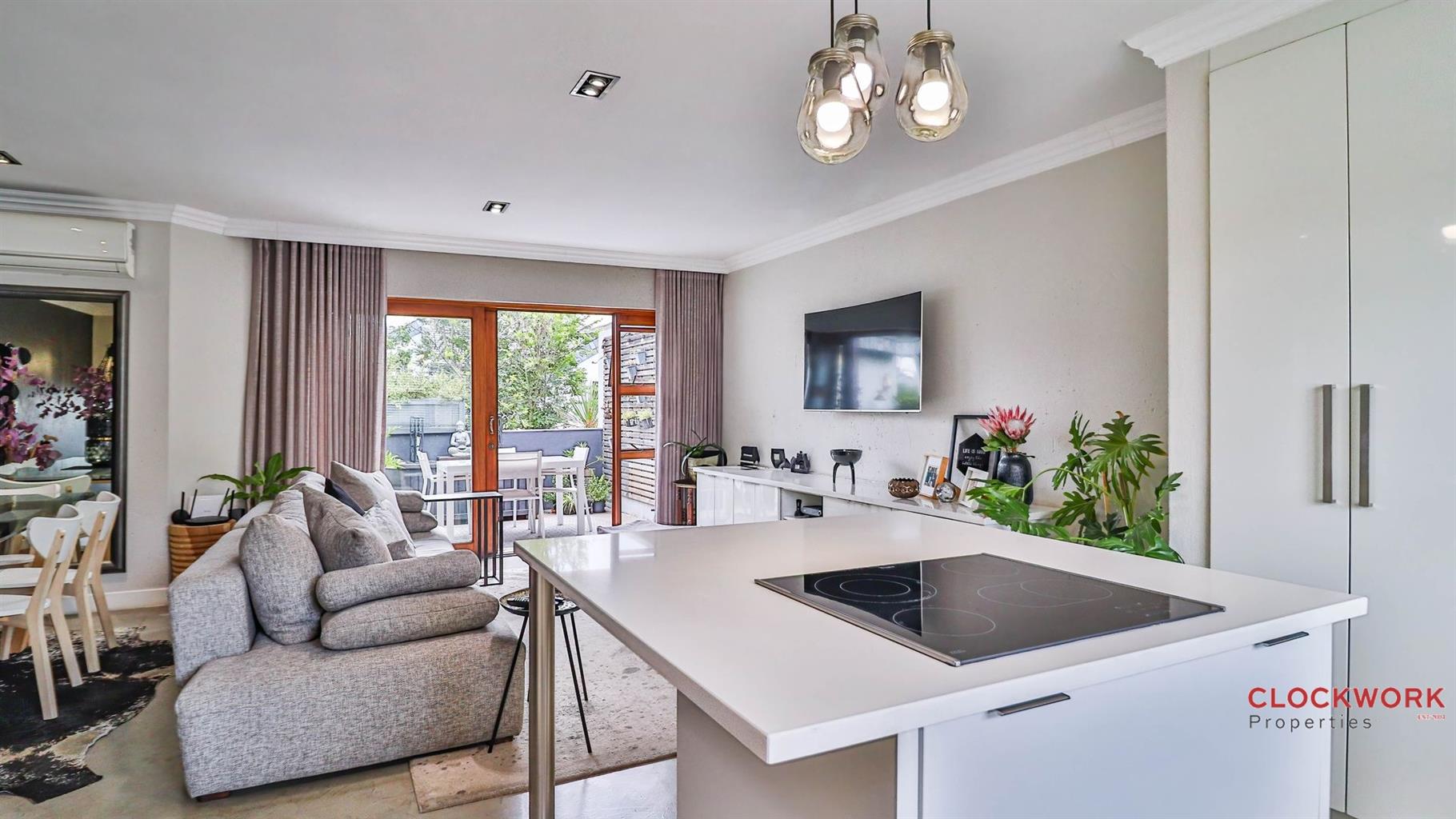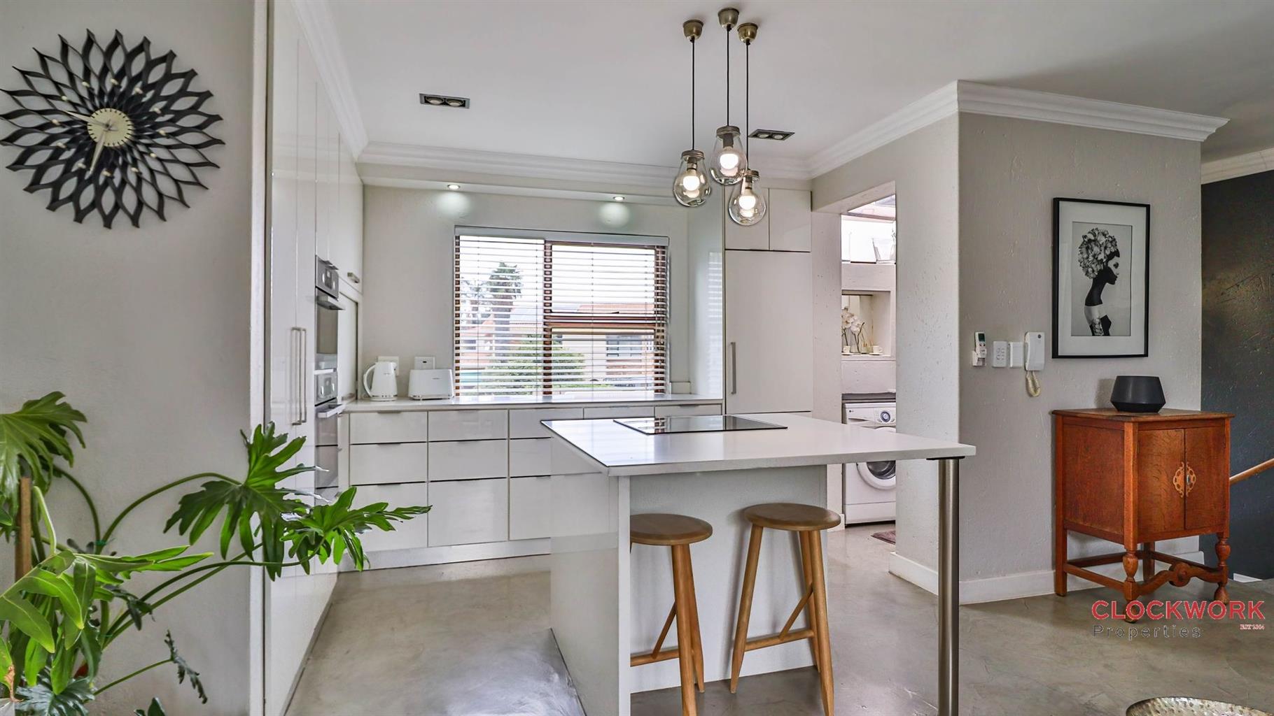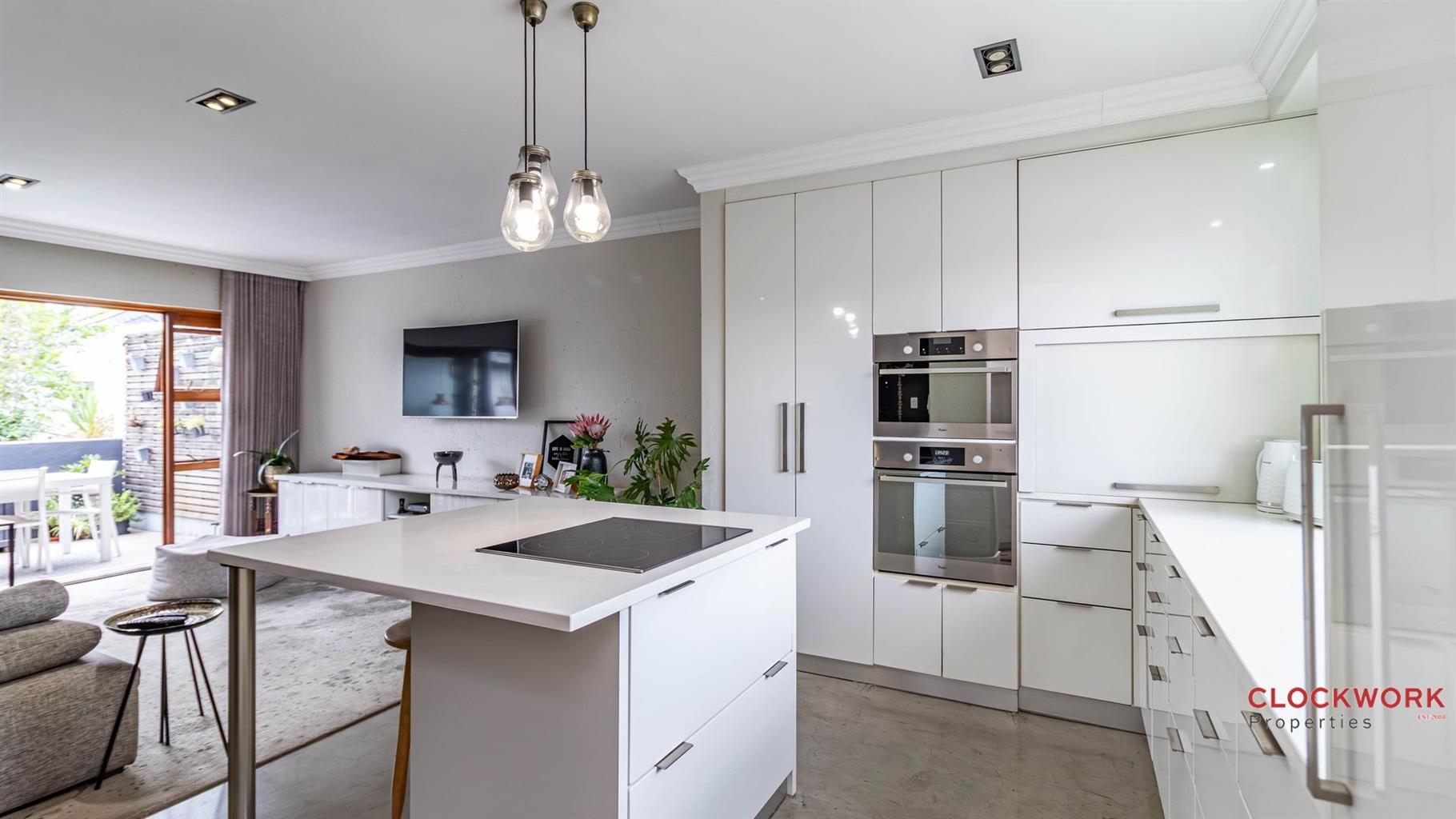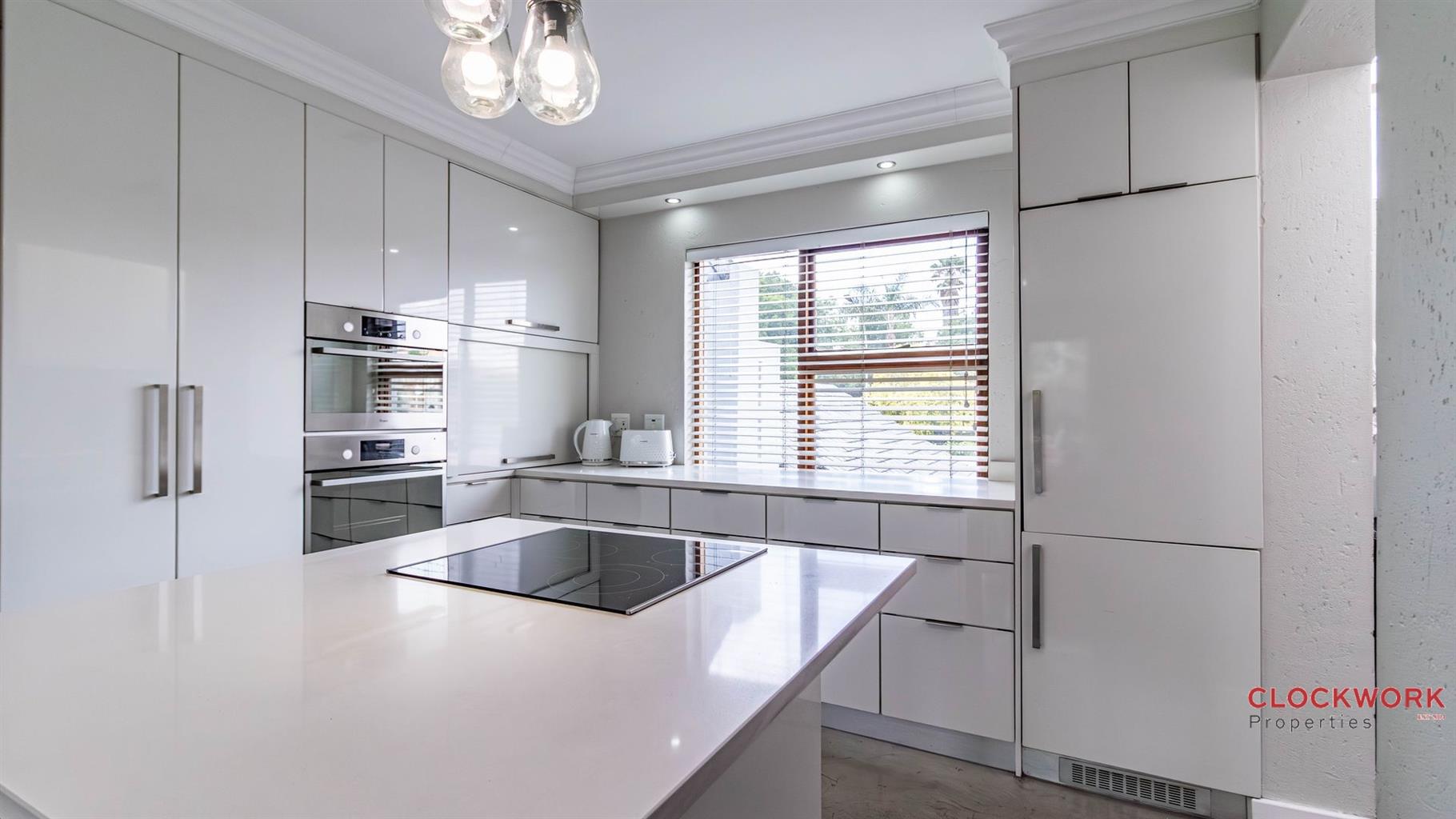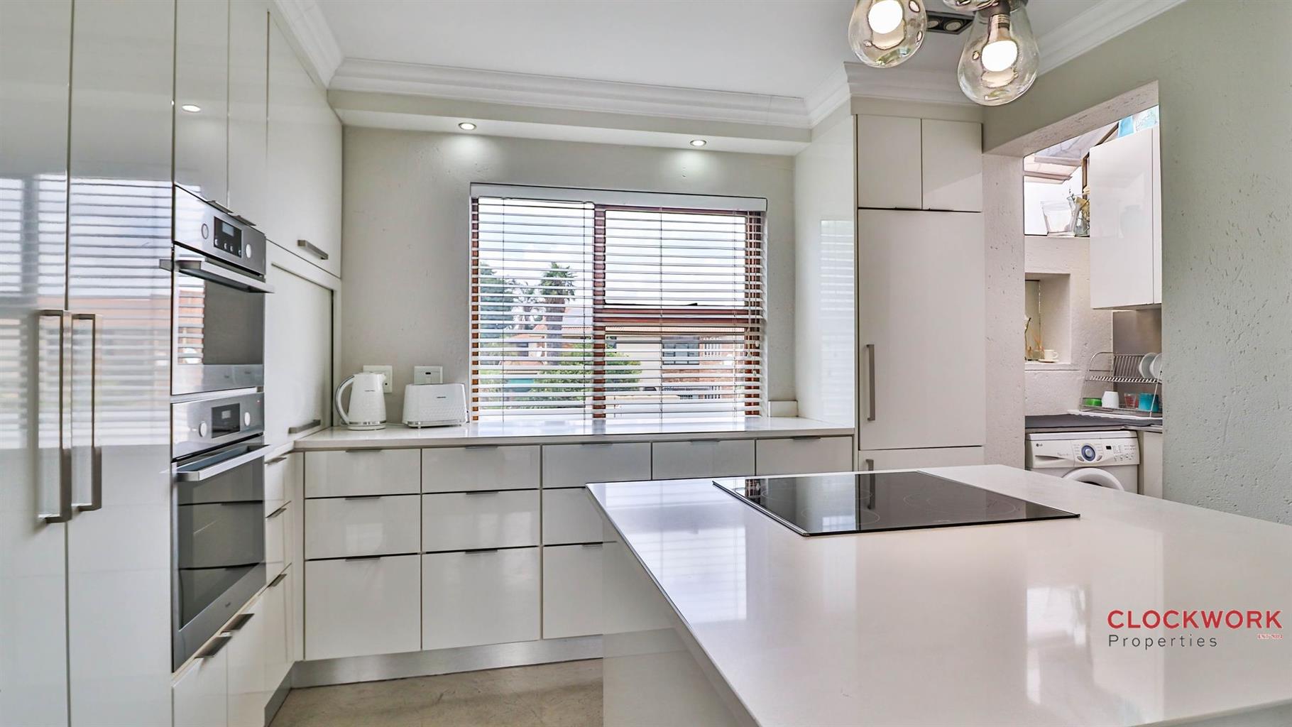 The designer kitchen is a standout, boasting Caesarstone countertops, a separate scullery, and integrated appliances including a fridge, convection microwave, and oven.