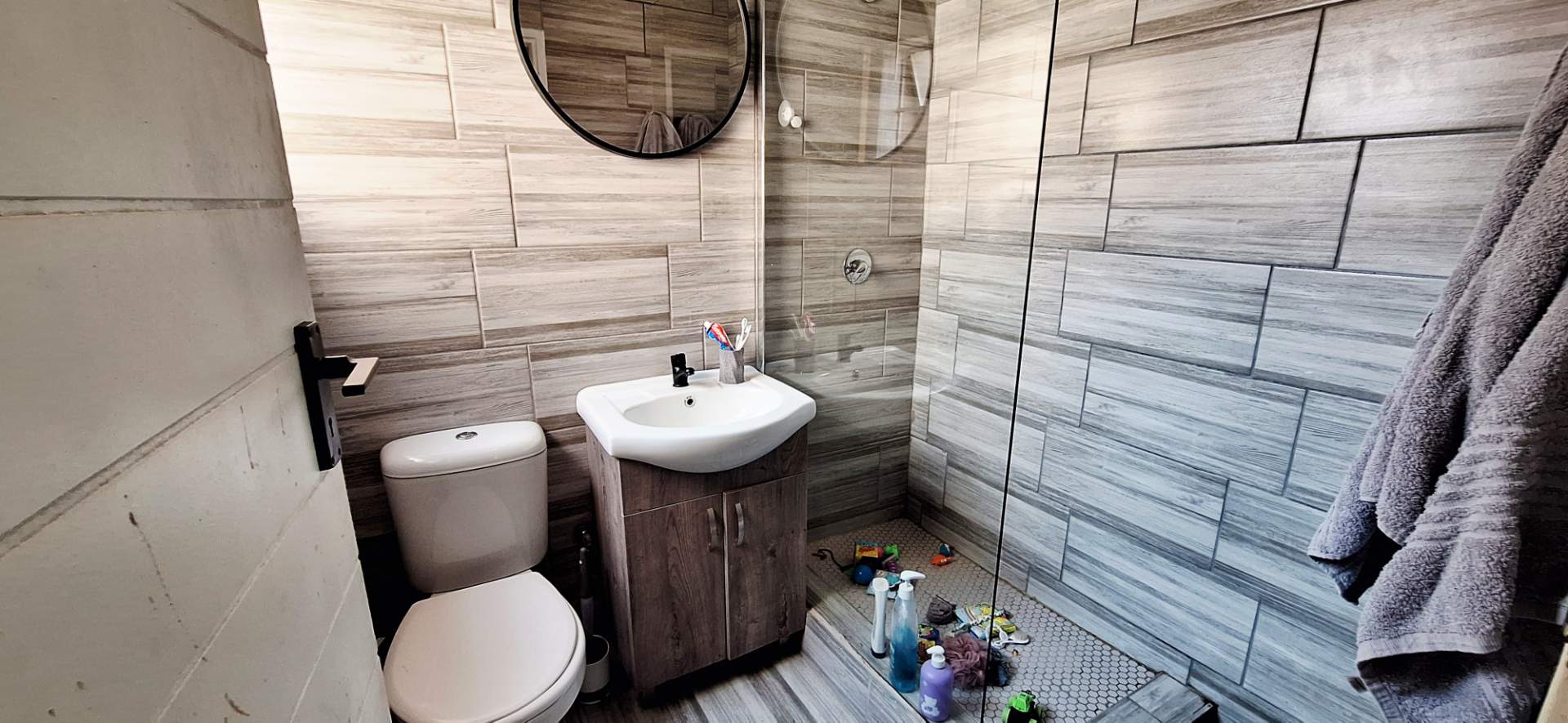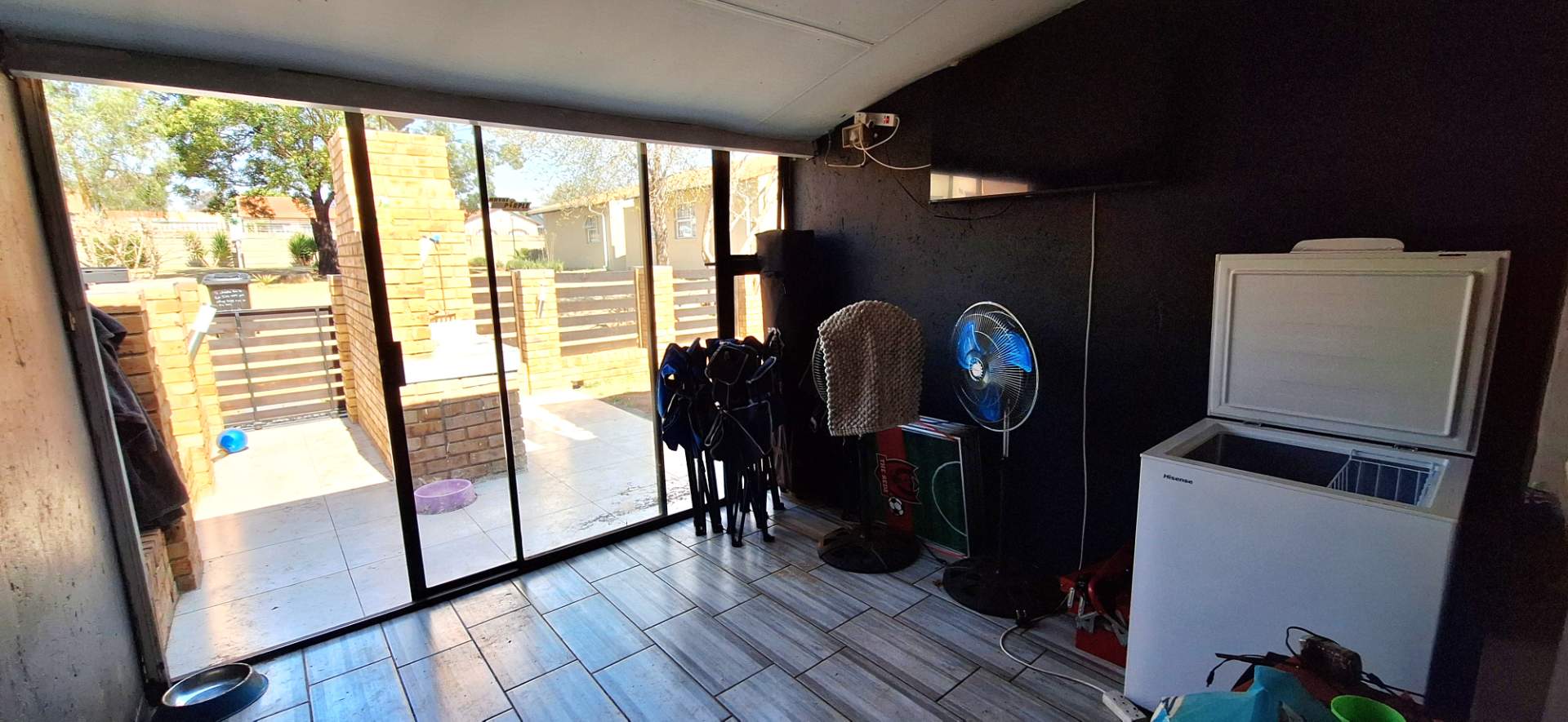 Step inside to find a home tiled throughout with contemporary tiles, creating a seamless and stylish flow. The open-plan lounge and kitchen area is designed with modern finishes and provides ample cupboard space, featuring a gas stove for the culinary enthusiast. The bathroom is tastefully appointed with modern fixtures including a loo, basin, and shower, complemented by an energy-efficient solar geyser.