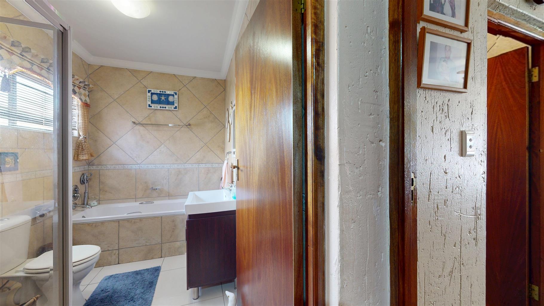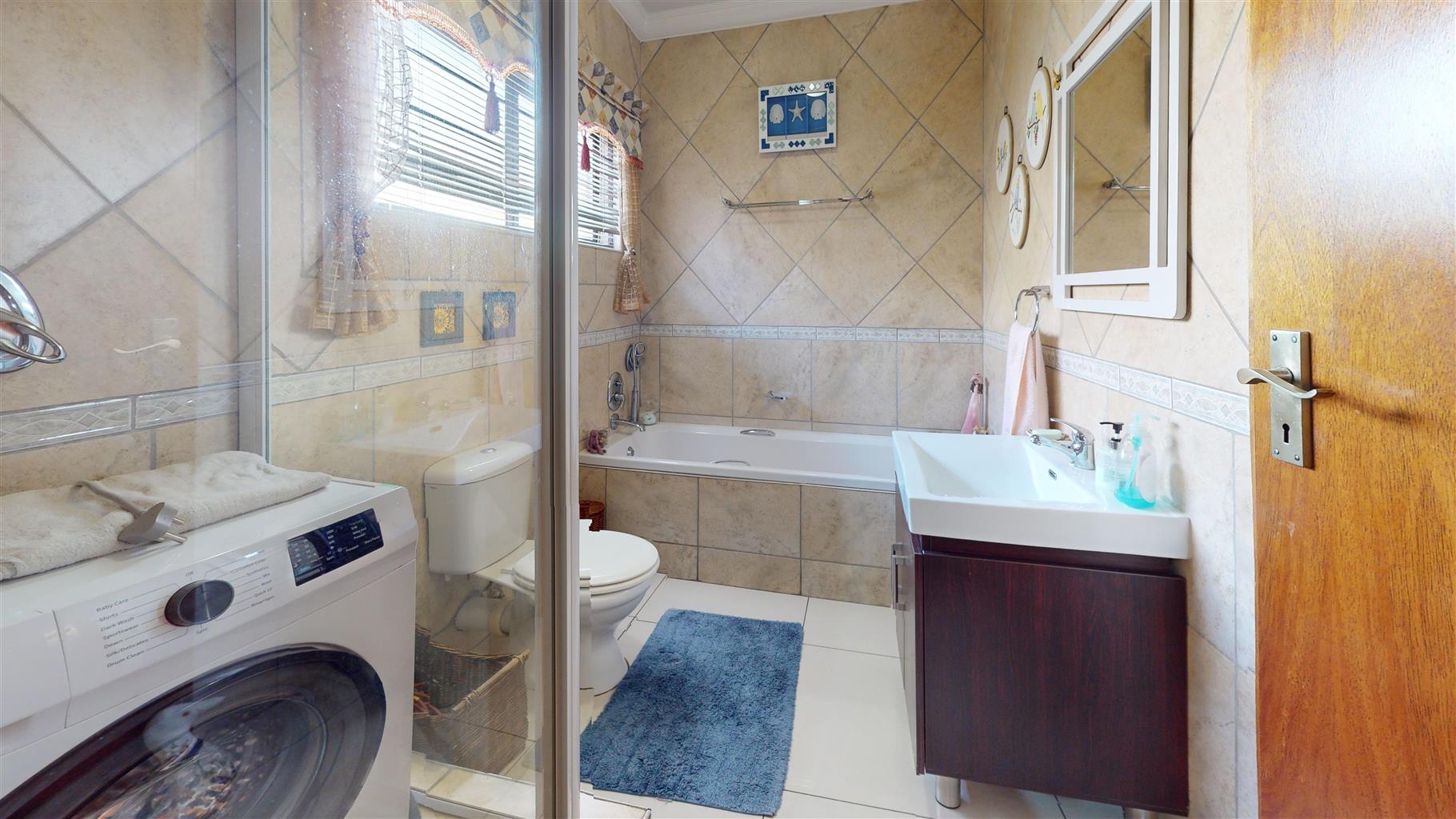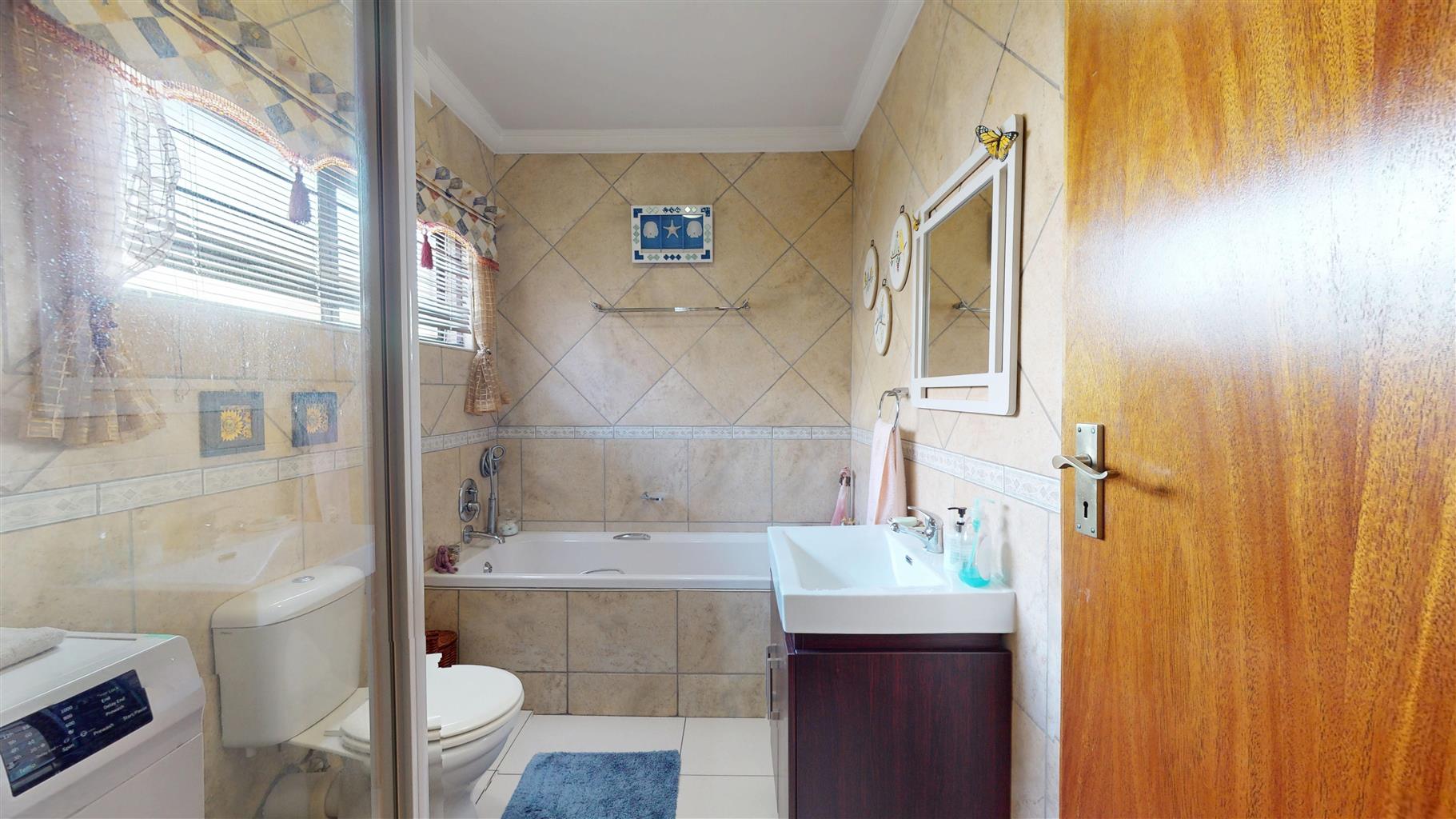 Inside, this home boasts three generously sized bedrooms, all basking in natural light and fitted with stunning floor-to-ceiling cherrywood cupboards. The main bedroom is particularly spacious, offering an abundance of cupboard space from wall to wall. It features a private en-suite bathroom, fully tiled for a sleek and modern finish.