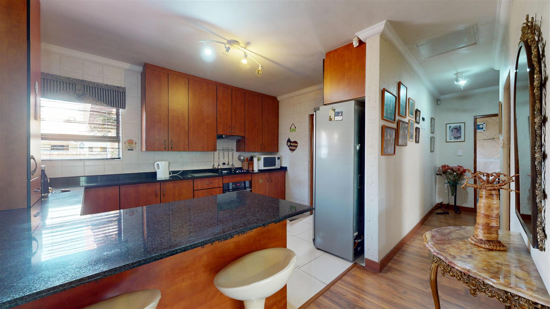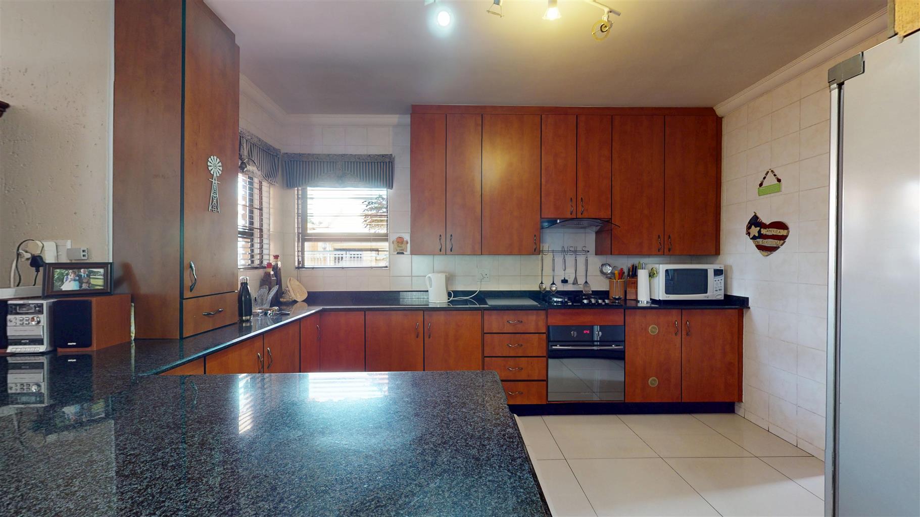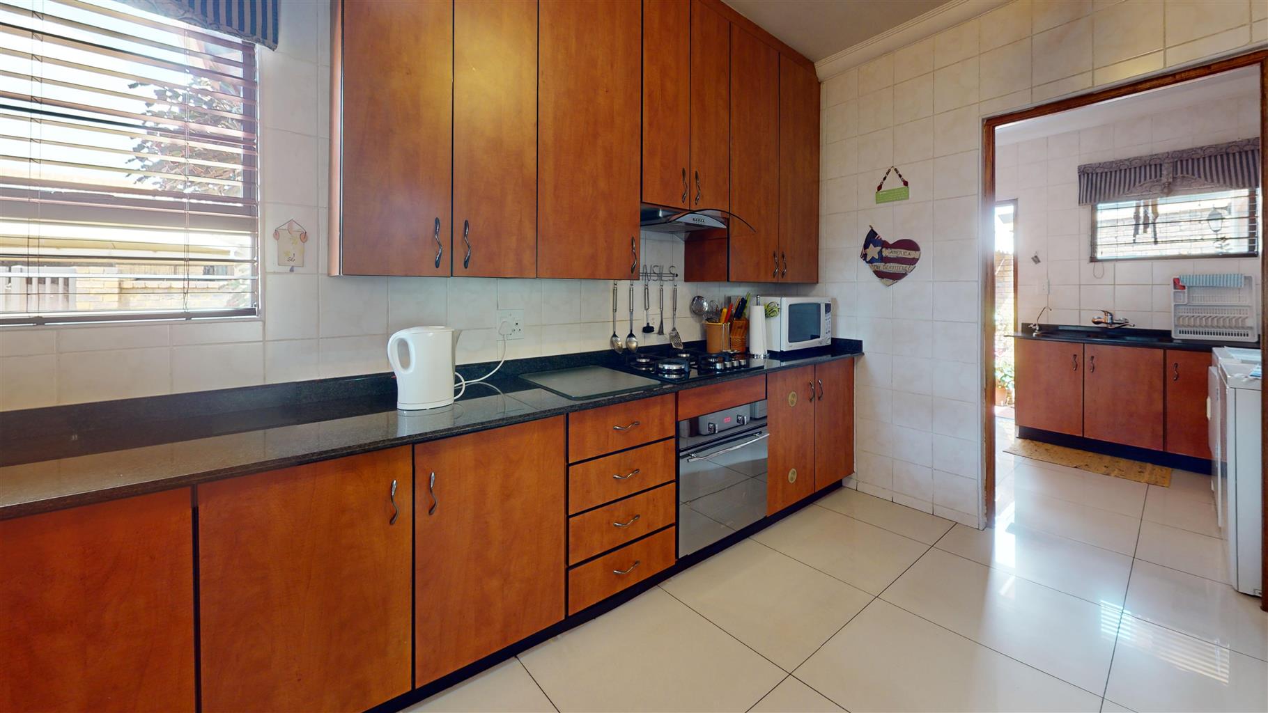 The kitchen is a chef’s dream, fitted with granite countertops, a gas stove, and a breakfast nook. A separate laundry and scullery area ensure added convenience and functionality.