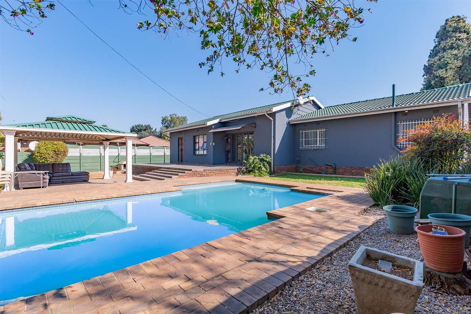 - Gazebo and sparkling pool