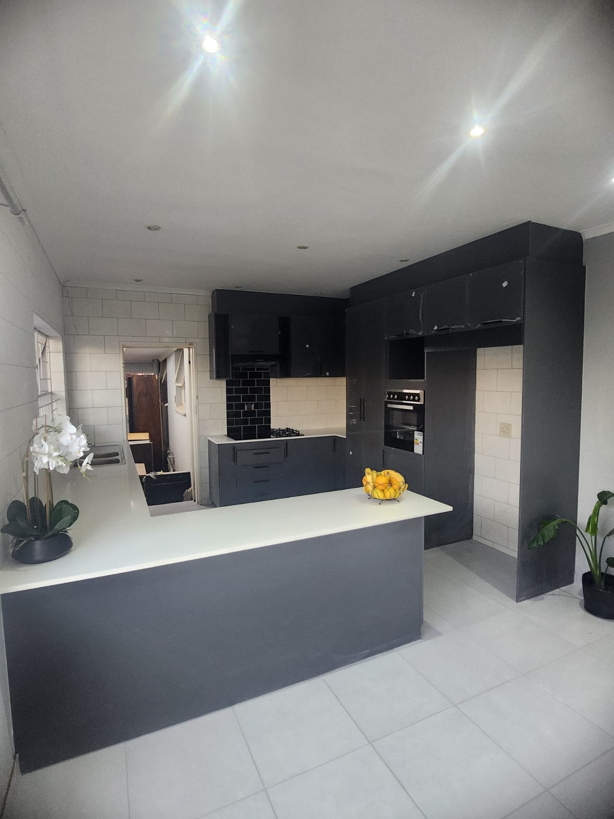 Kitchen with ample bics, eye level oven and hob, breakfast counbter, plumbed for washer