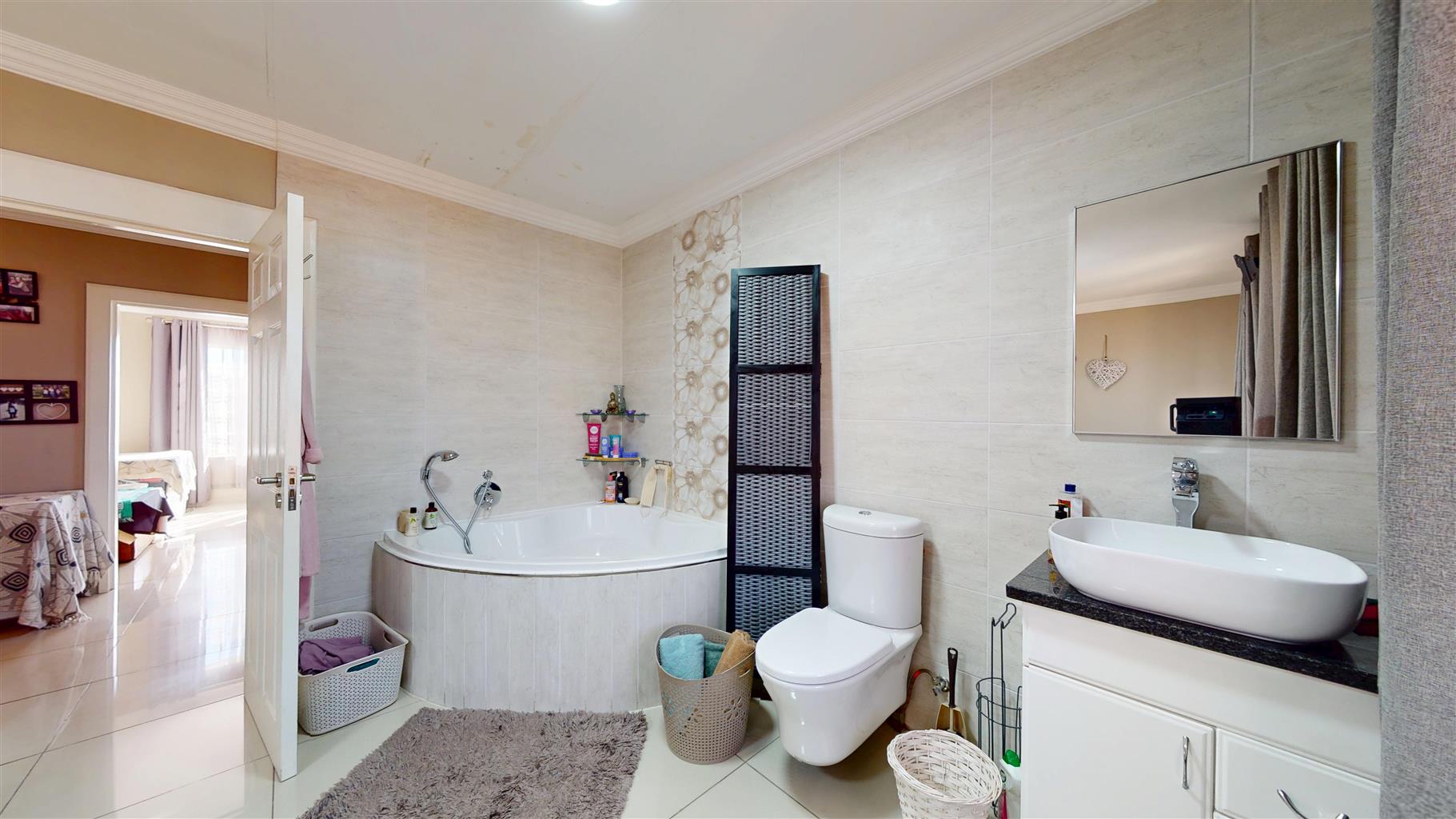 Offering two spacious bedrooms, the main bedroom includes an open-plan en-suite bathroom with a luxurious corner bath, vanity, and toilet. A second bathroom, neatly finished with a shower, toilet, and vanity, adds additional convenience for guests or family.