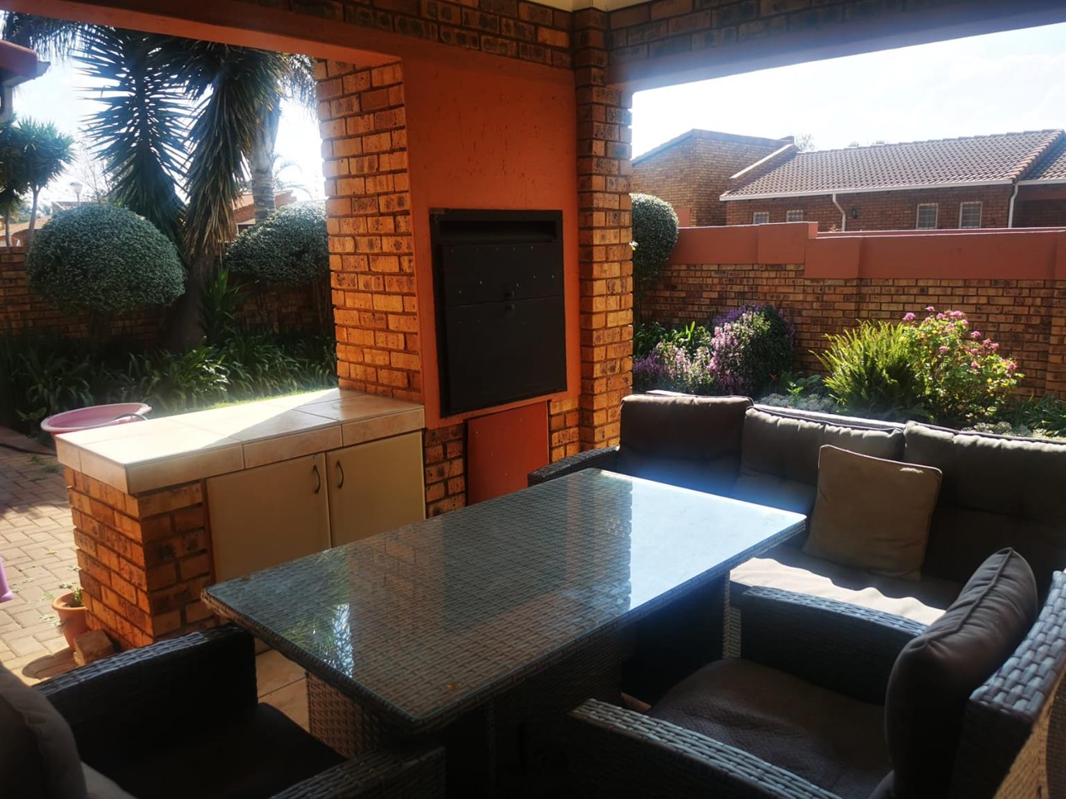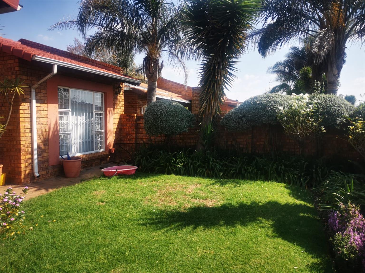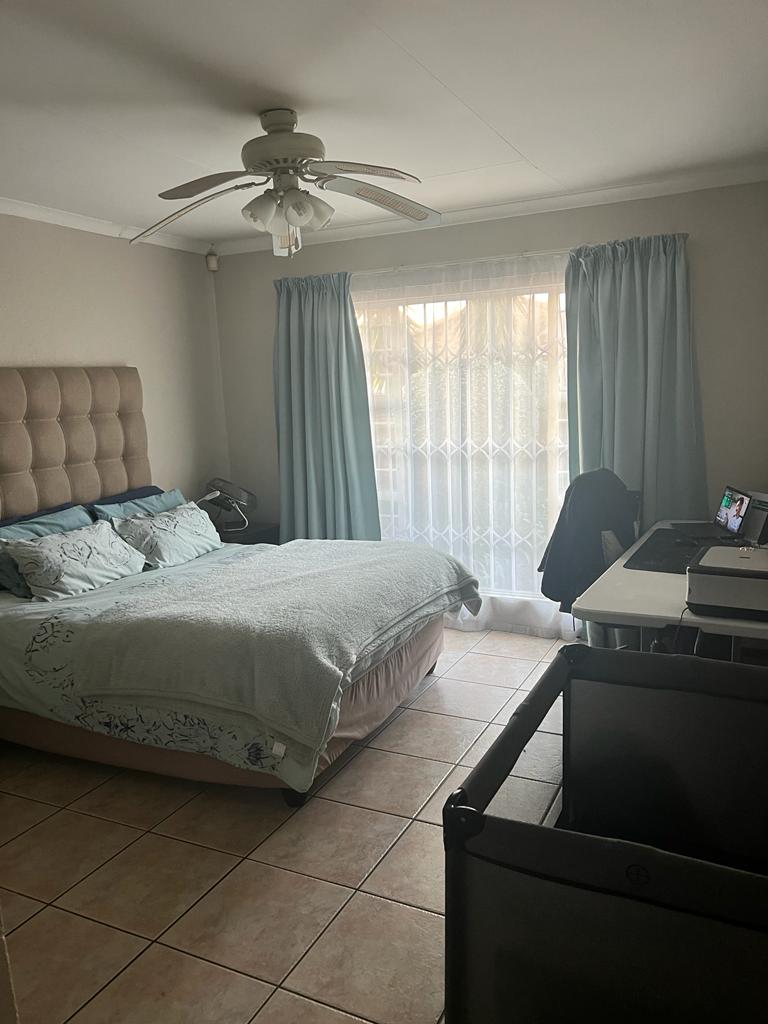 Townhouse with double garage, 3 bedrooms, 2 full bathrooms, lounge, dining room and large kitchen with scullery. Main bedroom has on suite bathroom with shower and bath and dressing room. Covered patio with built in braai and small garden. Alarm and security gates in a secure complex. Watering system installed. Remote controlled gates and garage door. Established garden. Fully tiled with under floor heating. Available 1 June for rent R14000 plus water and electricity.