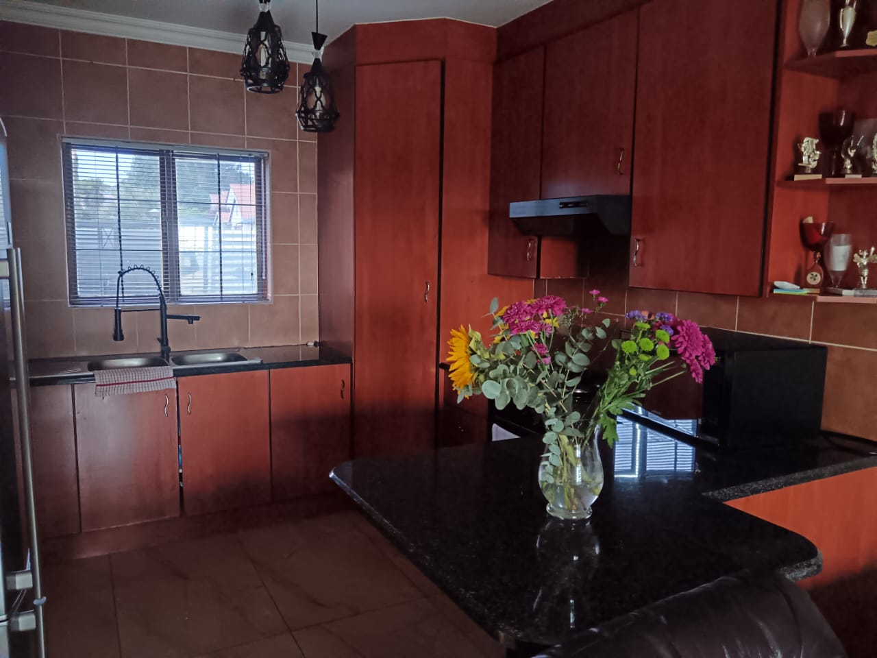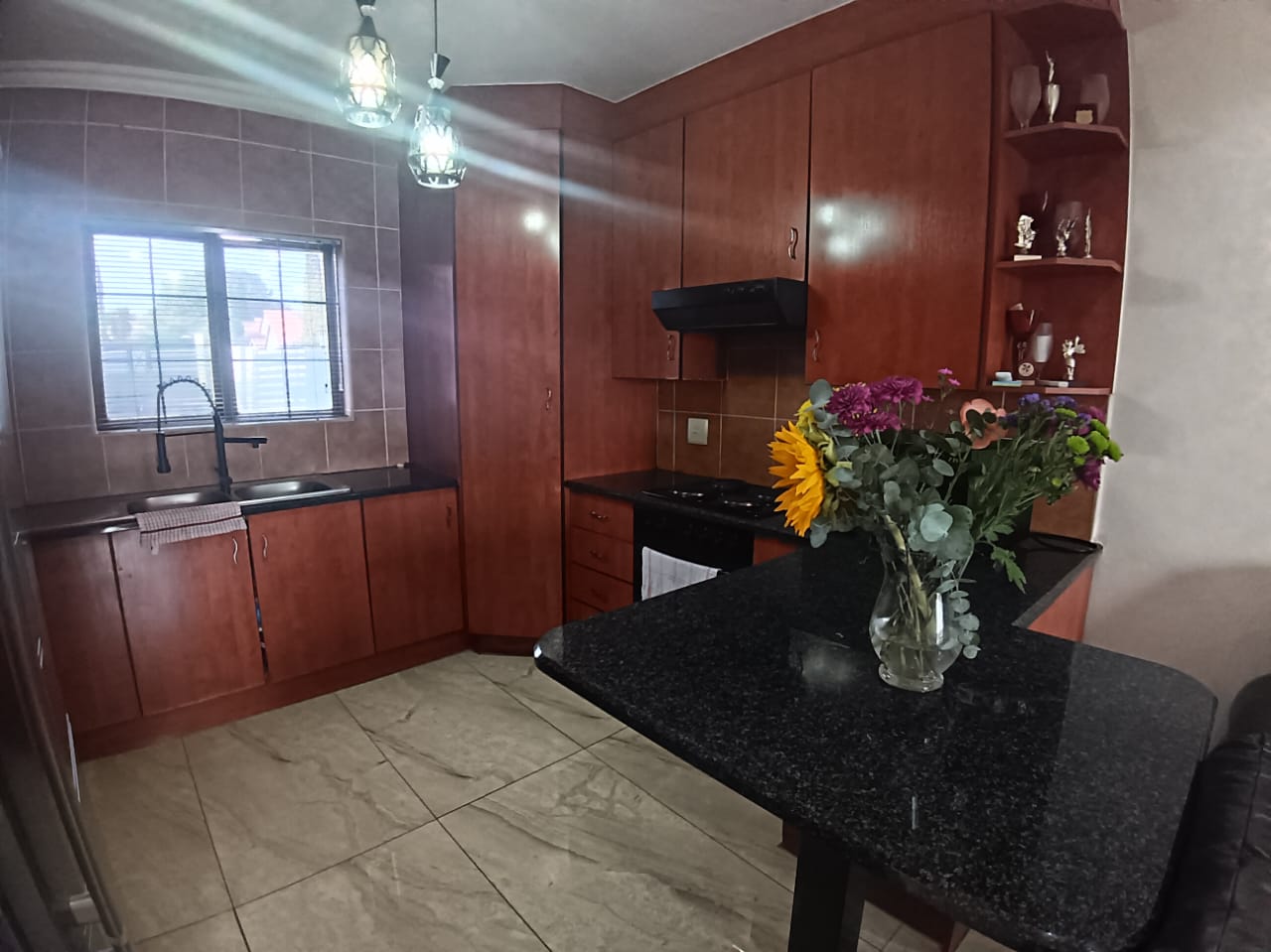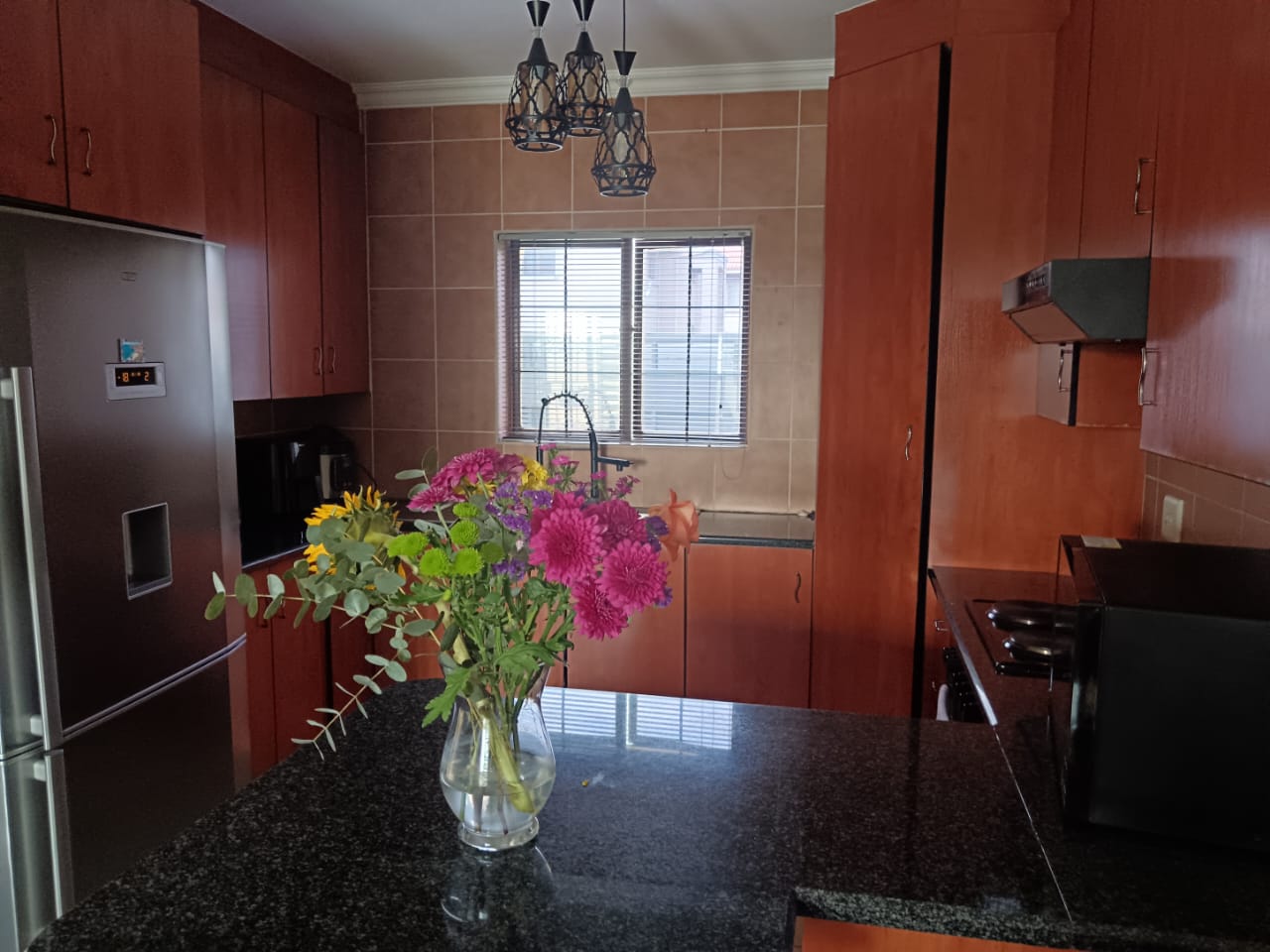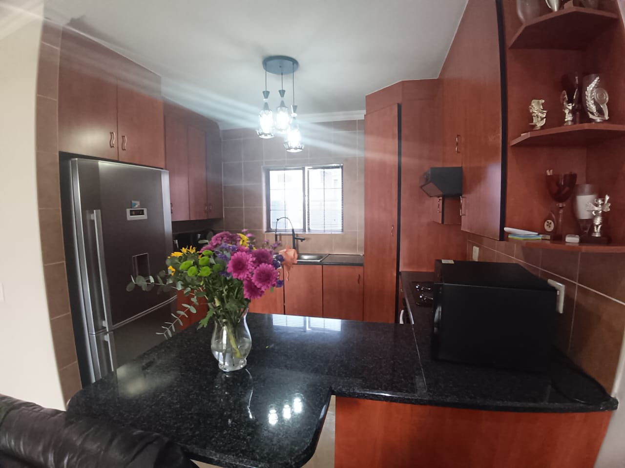 The modern kitchen features granite tops, a breakfast counter, and ample cupboard space.