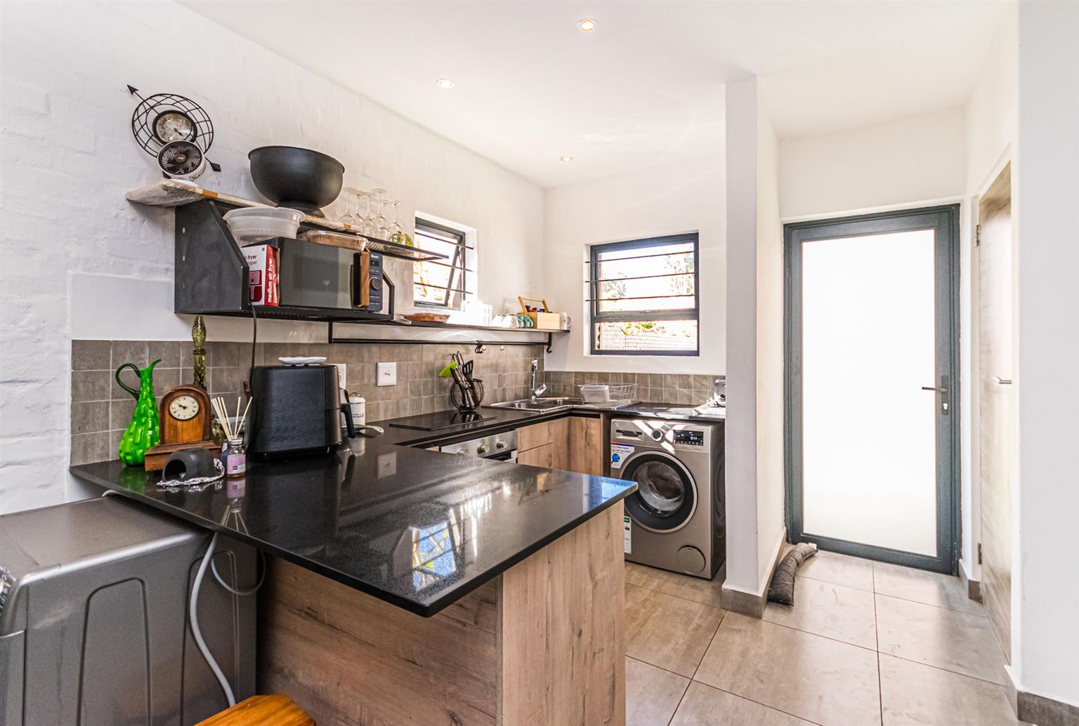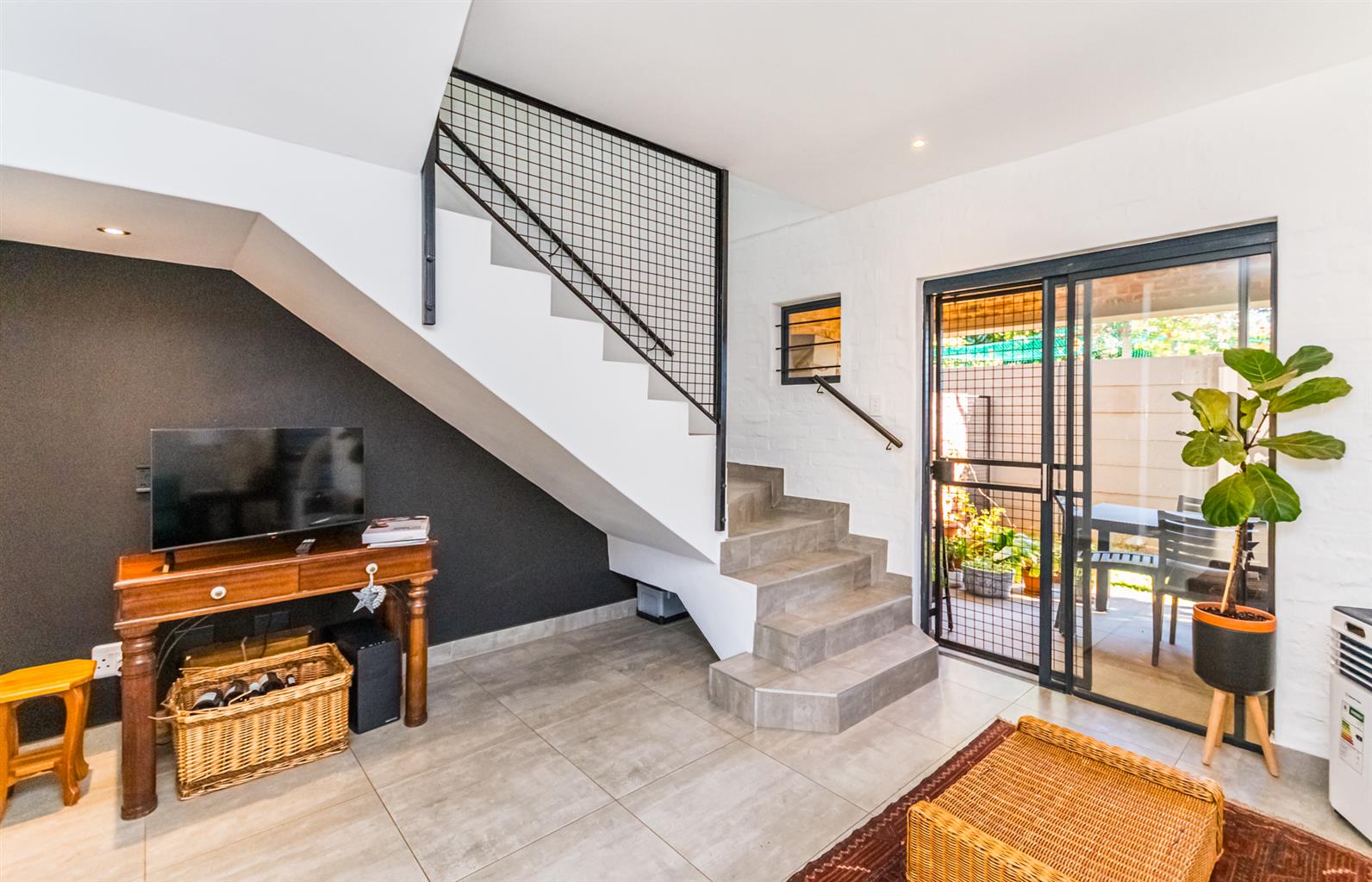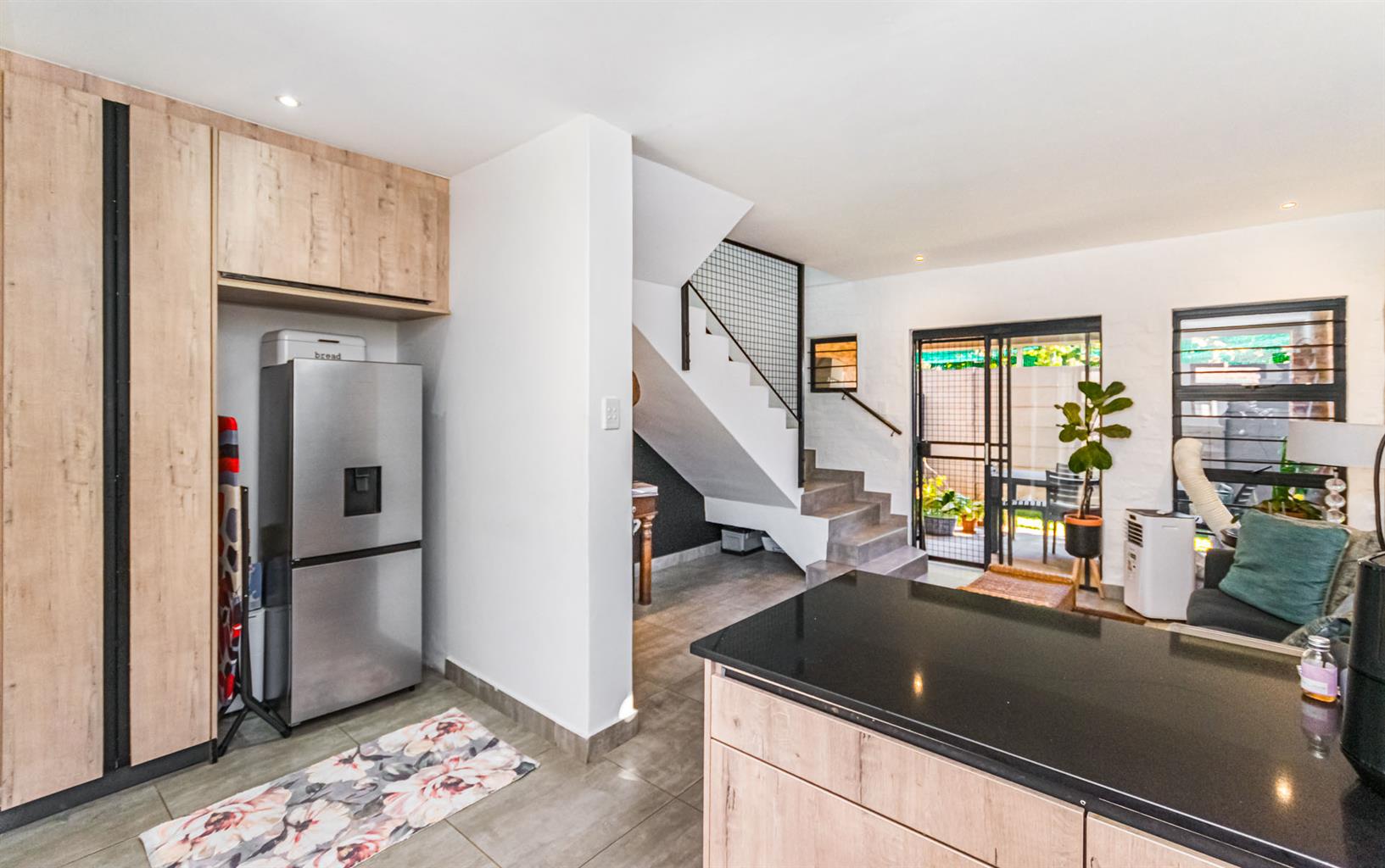 Step inside to a bright, open-plan living space with a contemporary feel. The kitchen is beautifully finished with granite countertops, a double sink, ample cupboard space, and a Snappy Chef induction stove—ideal for energy efficiency. A handy pantry cupboard keeps your groceries neatly stored. Downlights throughout the area create a warm and inviting atmosphere. A separate guest toilet is conveniently located on the ground floor, and the living area includes additional storage space beneath the staircase. Sliding glass doors open onto a covered entertainment patio and a private, pet-friendly garden equipped with an irrigation system.