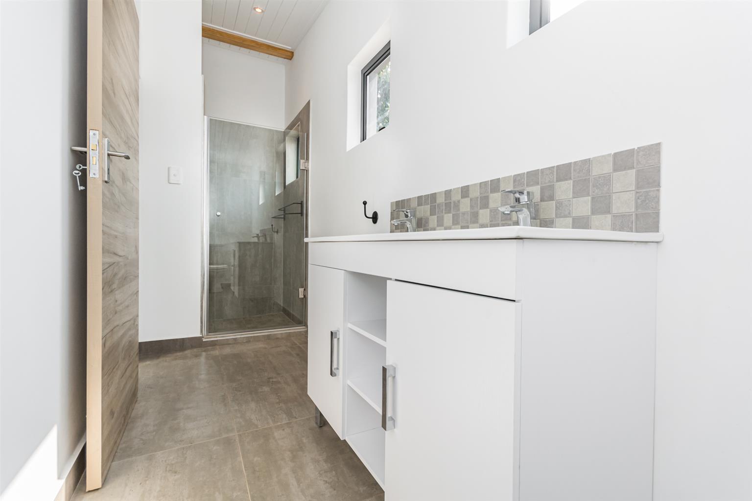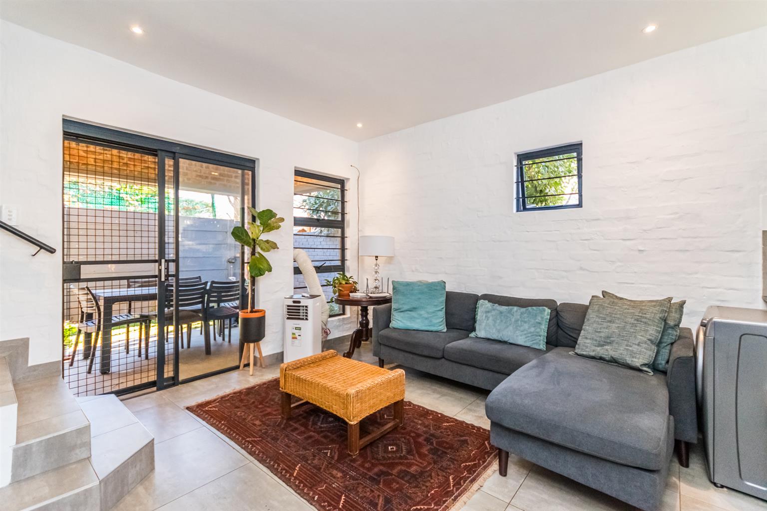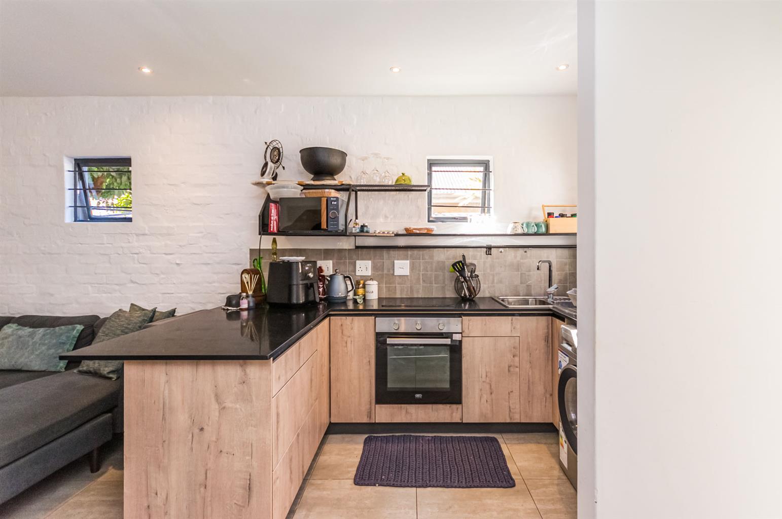 Step inside to a bright, open-plan living space with a contemporary feel. The kitchen is beautifully finished with granite countertops, a double sink, ample cupboard space, and a Snappy Chef induction stove—ideal for energy efficiency. A handy pantry cupboard keeps your groceries neatly stored. Downlights throughout the area create a warm and inviting atmosphere. A separate guest toilet is conveniently located on the ground floor, and the living area includes additional storage space beneath the staircase. Sliding glass doors open onto a covered entertainment patio and a private, pet-friendly garden equipped with an irrigation system.