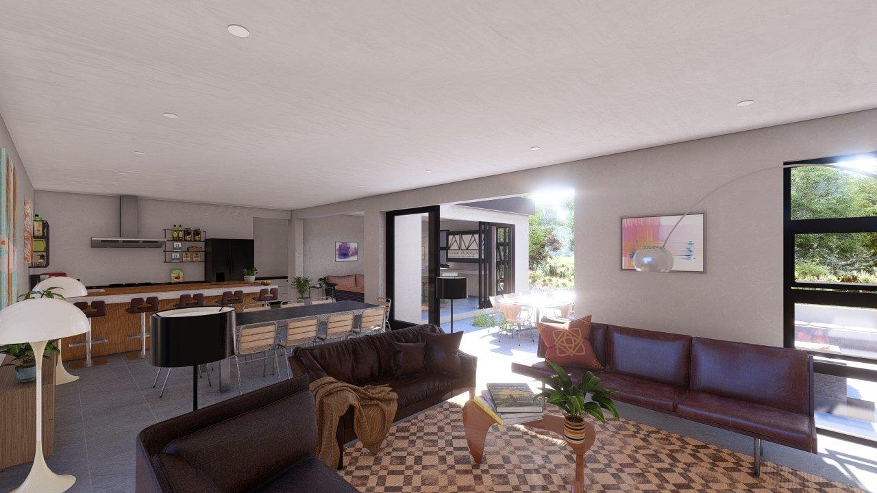 The ground level is where the magic happens. The home opens to a stylish open-plan living and dining area, a modern kitchen with a walk-in pantry, and a separate scullery and laundry. A fully equipped bar and entertainment room with a built-in braai flows effortlessly onto an open patio overlooking the pool, boma, and firepit perfect for relaxed evenings or weekend get-togethers. A study offers a quiet work-from-home space, while the ensuite guest room ensures comfort for visitors. A triple garage and staff quarters add to the functionality.