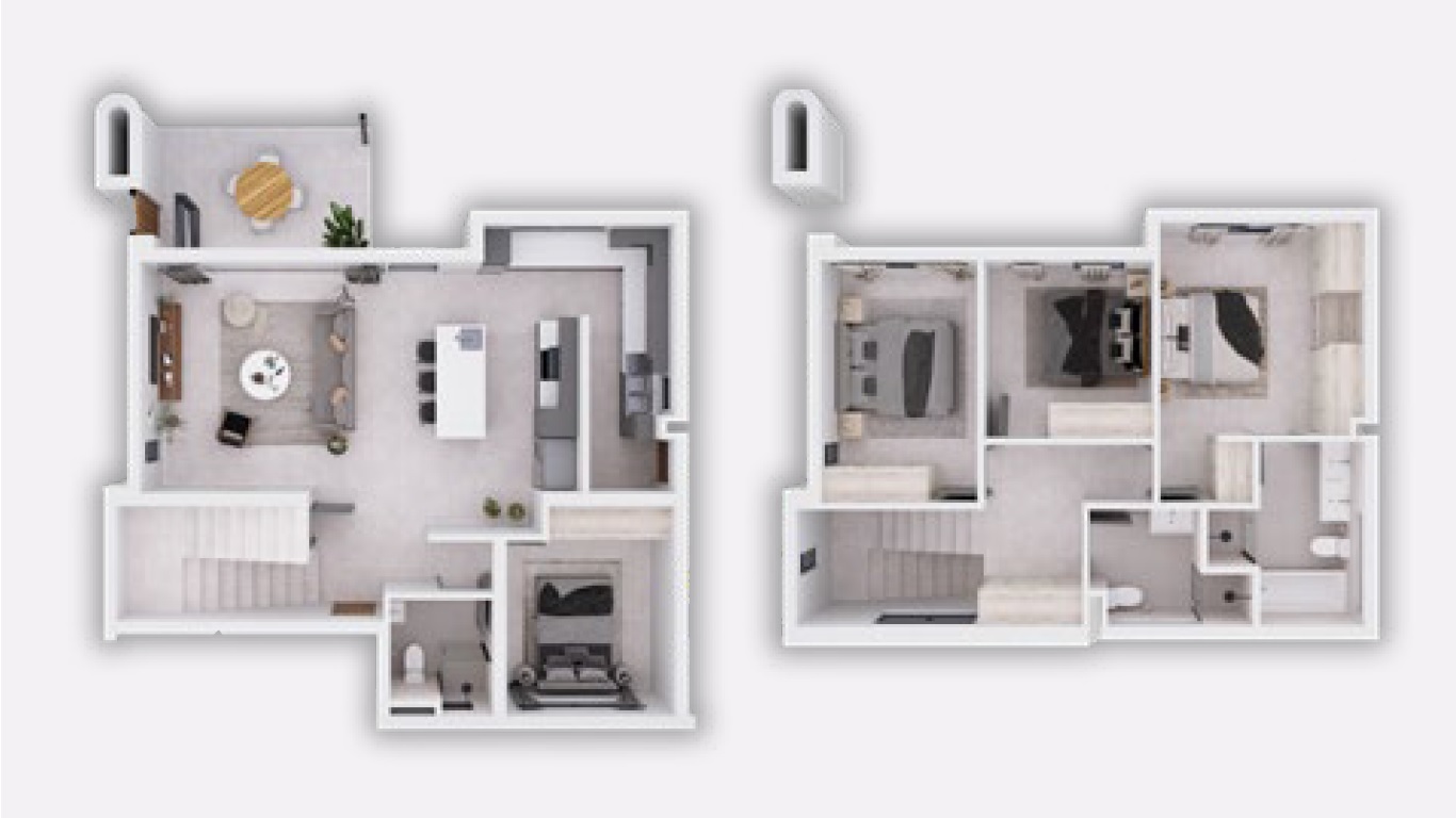 The layout features one bedroom and bathroom conveniently located on the ground floor, while upstairs you'll find three additional bedrooms and two more bathrooms.