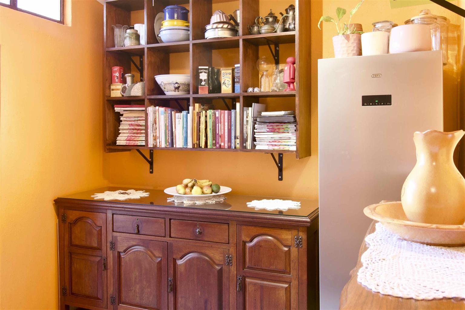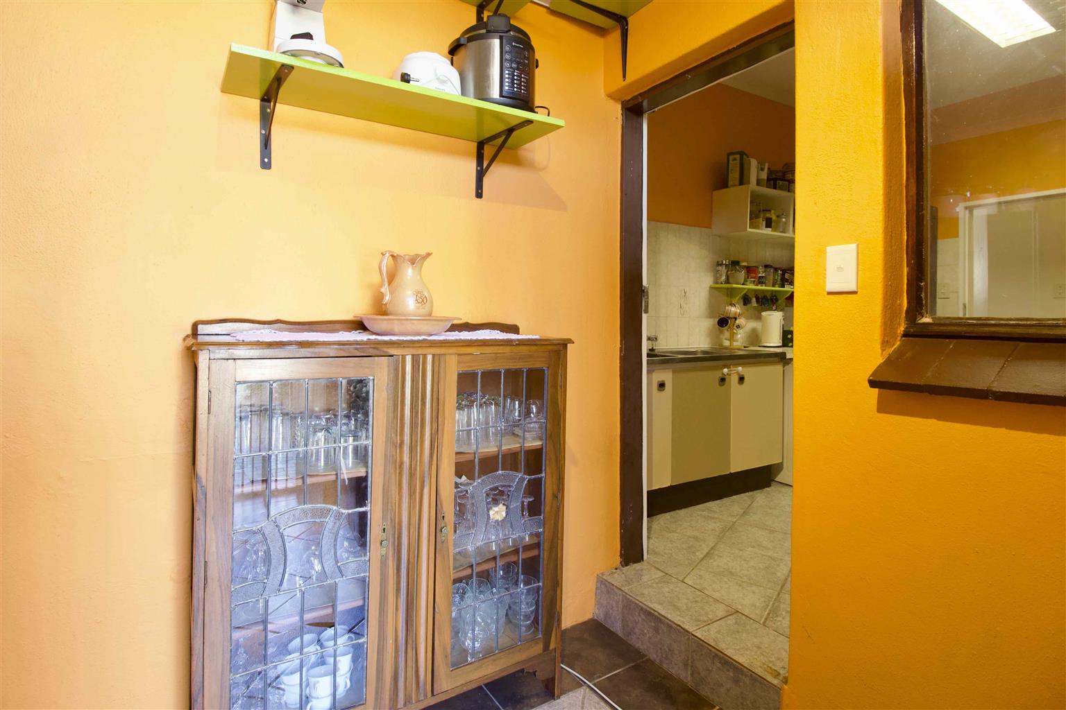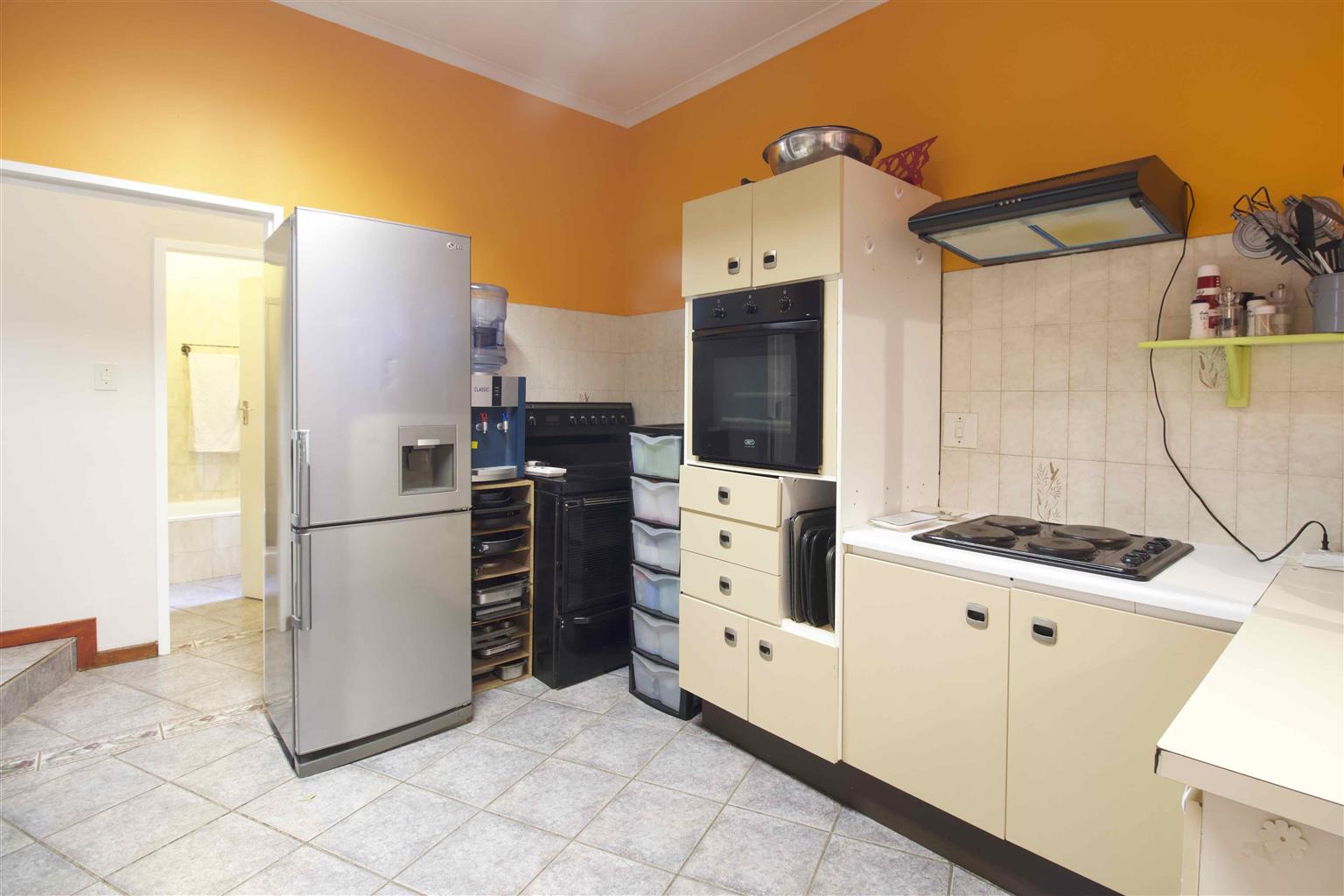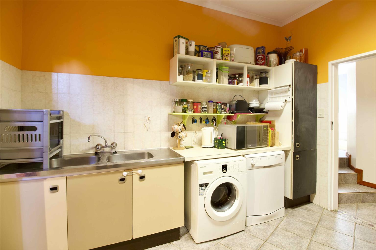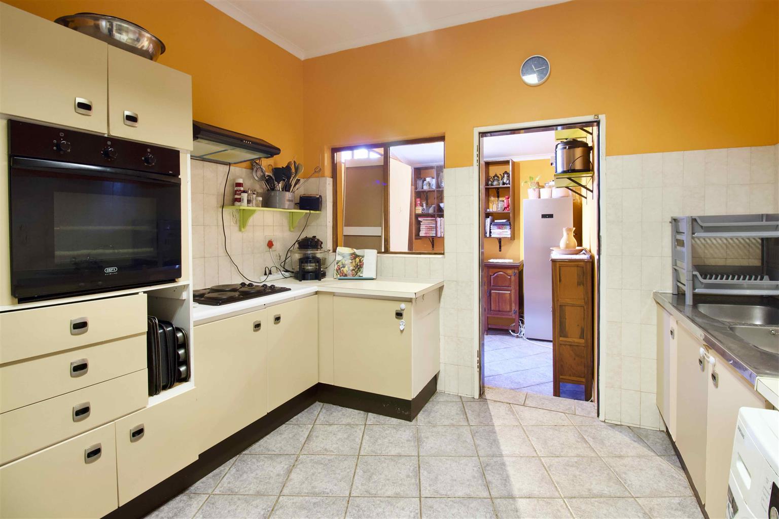 Kitchen offers ample cupboard space plus an enclosed storage area.