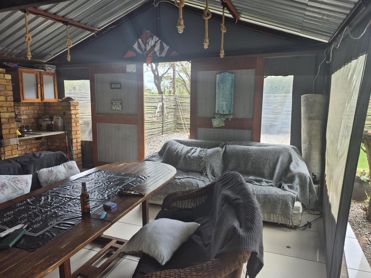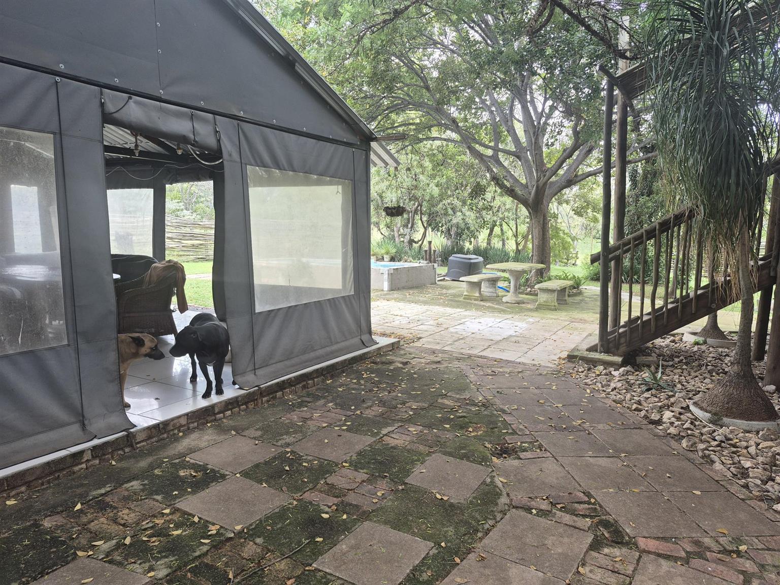 The sides of the lapa are awnings in case of rain. So, it can be opened or closed. All of this is in a lovely bushveld garden, with many cycads, and next to a pool.