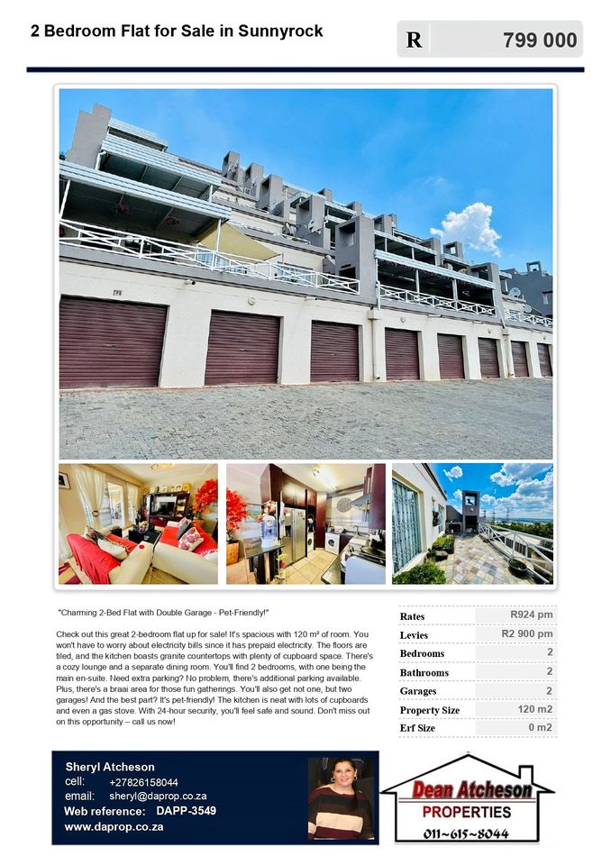 "Charming 2-Bed Flat with Double Garage - Pet-Friendly!" Check out this great 2-bedroom flat up for sale! It's spacious with 120 m² of room. You won't have to worry about electricity bills since it has prepaid electricity. The floors are tiled, and the kitchen boasts granite countertops with plenty of cupboard space. There's a cozy lounge and a separate dining room. You'll find 2 bedrooms, with one being the main en-suite. Need extra parking? No problem, there's additional parking available. Plus, there's a braai area for those fun gatherings. You'll also get not one, but two garages! And the best part? It's pet-friendly! The kitchen is neat with lots of cupboards and even a gas stove. With 24-hour security, you'll feel safe and sound. Don't miss out on this opportunity – call us now!