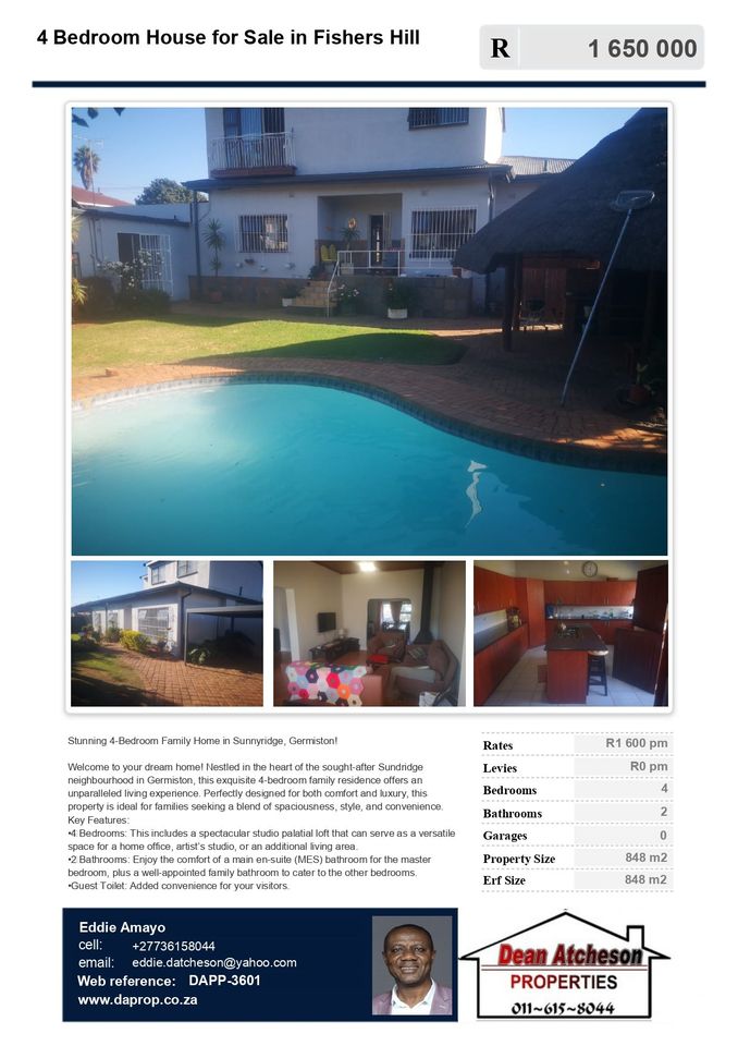 Stunning 4-Bedroom Family Home in Sunnyridge, Germiston! Welcome to your dream home! Nestled in the heart of the sought-after Sundridge neighbourhood in Germiston, this exquisite 4-bedroom family residence offers an unparalleled living experience. Perfectly designed for both comfort and luxury, this property is ideal for families seeking a blend of spaciousness, style, and convenience. Key Features: • 4 Bedrooms: This includes a spectacular studio palatial loft that can serve as a versatile space for a home office, artist’s studio, or an additional living area. • 2 Bathrooms: Enjoy the comfort of a main en-suite (MES) bathroom for the master bedroom, plus a well-appointed family bathroom to cater to the other bedrooms. • Guest Toilet: Added convenience for your visitors. • Lounge: A cozy and inviting space for family gatherings and relaxation. • Separate Dining Room: Perfect for formal dinners and special occasions. • Modern Kitchen: Equipped with contemporary appliances and a charming breakfast nook, making it the heart of the home. • Additional Parking: Ample parking space to accommodate multiple vehicles. • Established Garden: A beautifully maintained garden featuring a lapa and braai area, ideal for outdoor entertainment and family barbecues. • Sparkling Pool: A refreshing oasis for those hot summer days, providing endless fun and relaxation. • Granny Flat: An additional living space perfect for extended family, guests, or even as a rental opportunity.