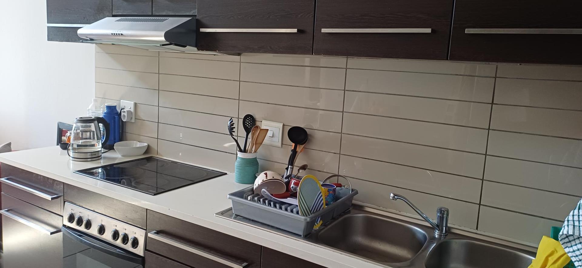 The apartment features two spacious bedrooms and one full bathroom. The main bedroom is designed with ample cupboard space to cater to all your storage needs. The open-plan kitchen is a chef's delight, boasting ample cupboard space and well-fitted with high-quality stainless steel appliances, including a fridge, washing machine, and tumble dryer.