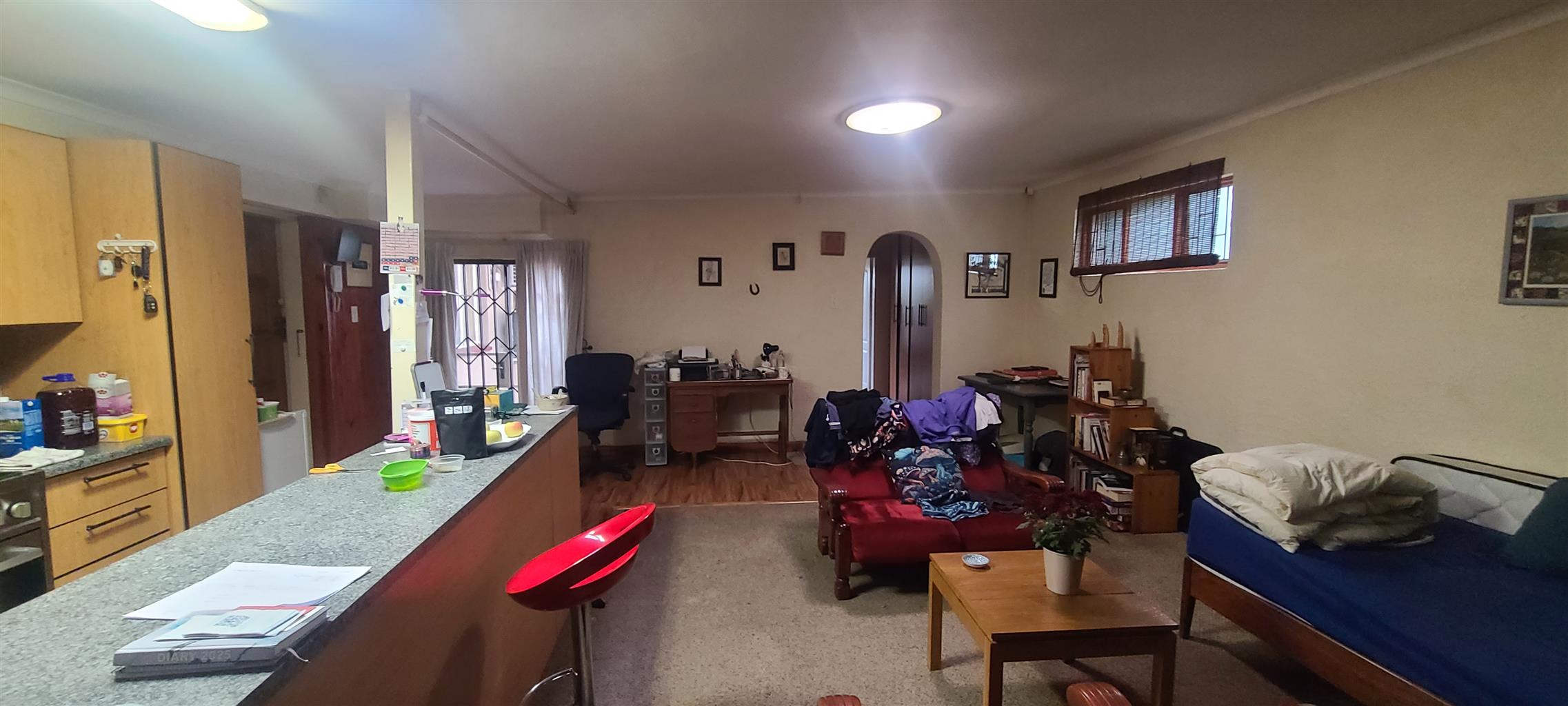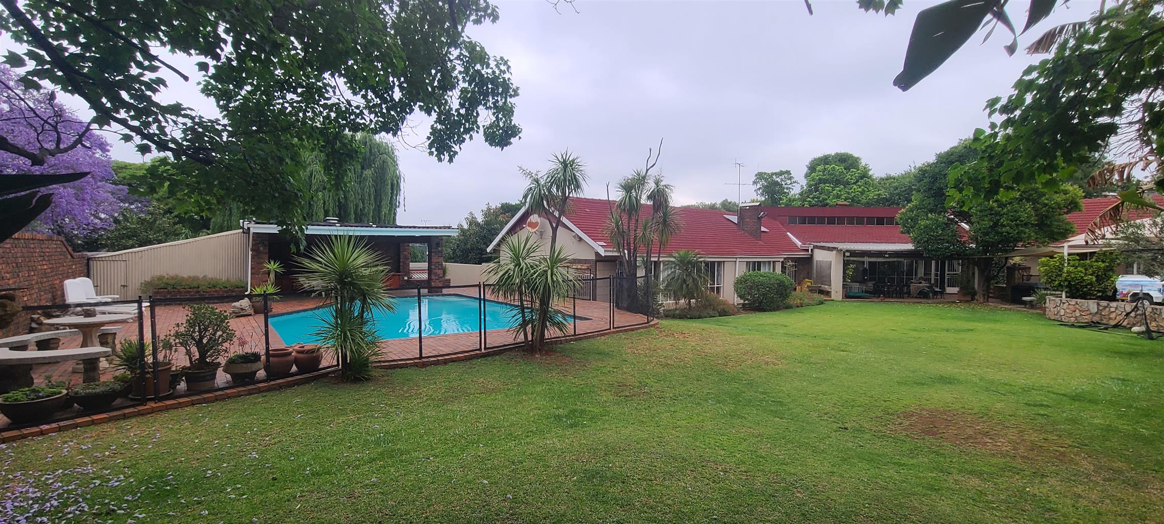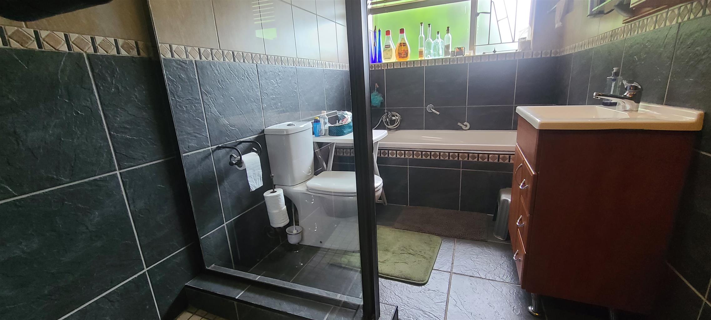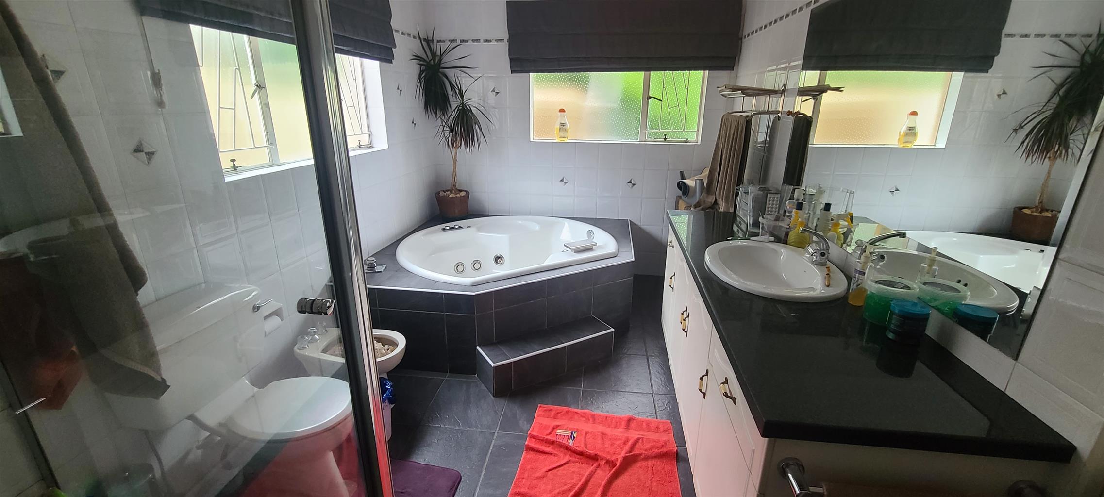 A must see. Neat and spacious home with a character, located in a boomed on a private cul de sec road. Offers five spacious bedrooms with modern sliding mirror door cupboards. Four modern full bathrooms and a guest toilet. Neat, modern, tiled cherry wood cupboard and granite tops kitchen. Open plan lounge and a dining. There is a massive self-contained two bedrooms cottage and a studio. There is a massive closed off entertainment area, and another open entertainment area right next to the pool. Lovely low maintenance garden. Double carports extra parking. Burglar proofed throughout, high walls with electric fence all around. It is near many good Edenvale schools & Greenstone mall.