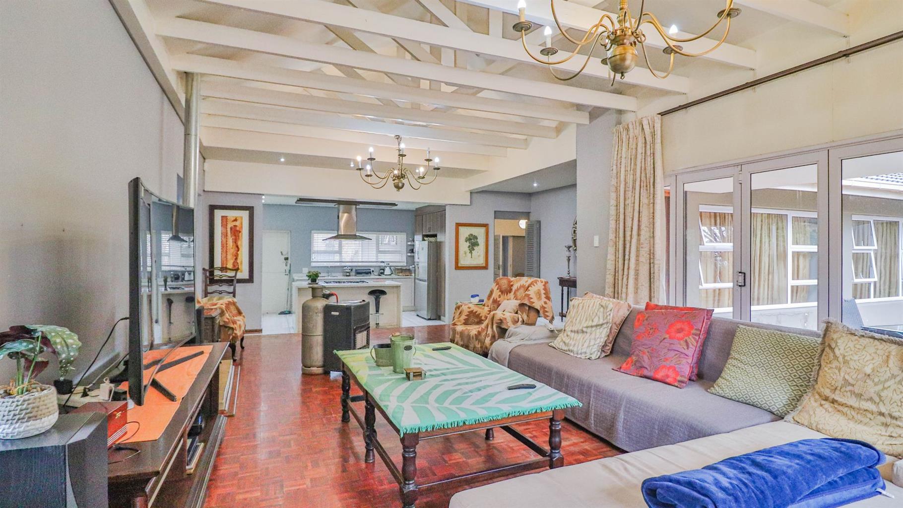 Lounge with dtacking doors opens to a patio area overlooking a manicured garden and sparkling swimming pool