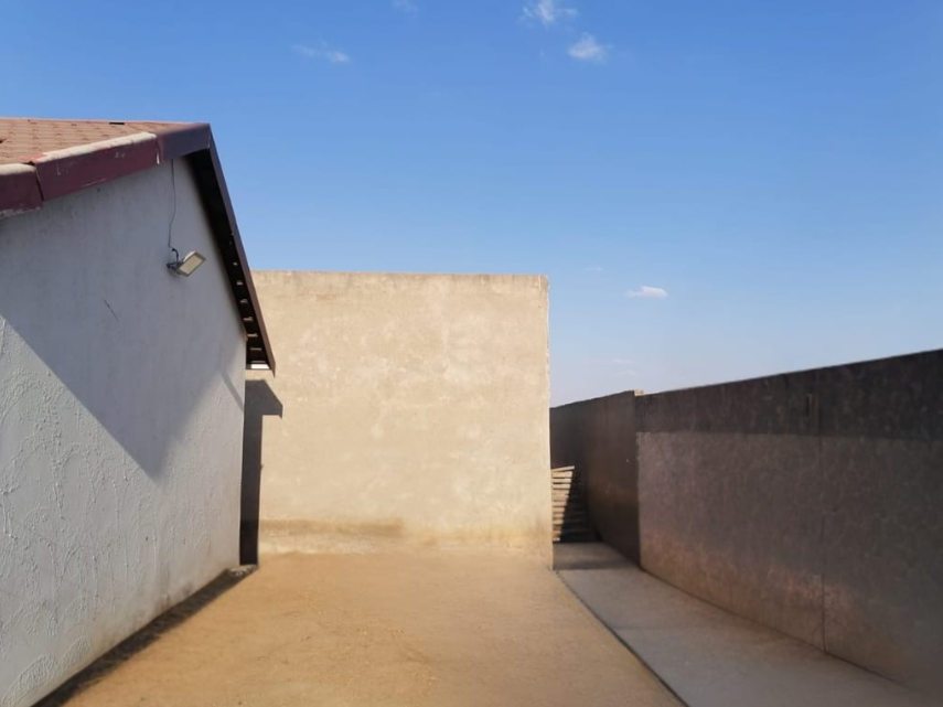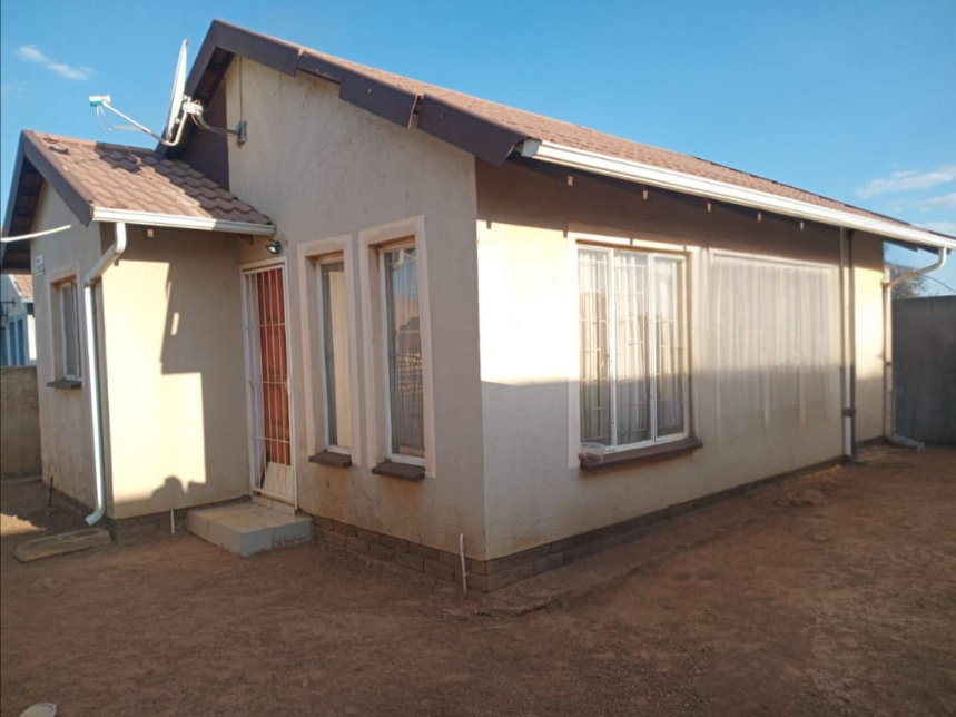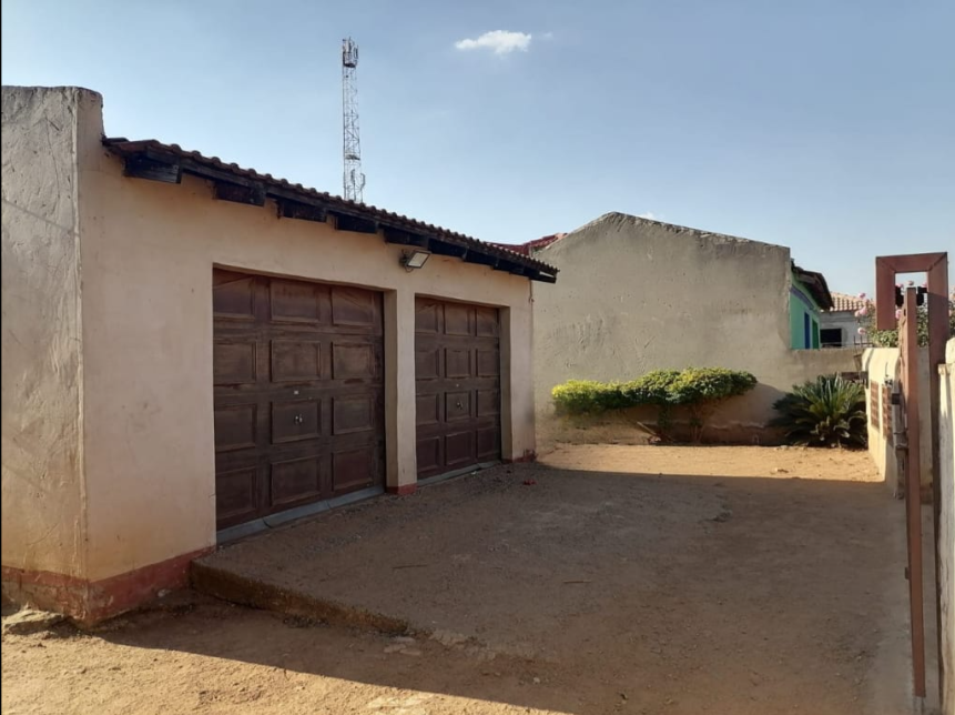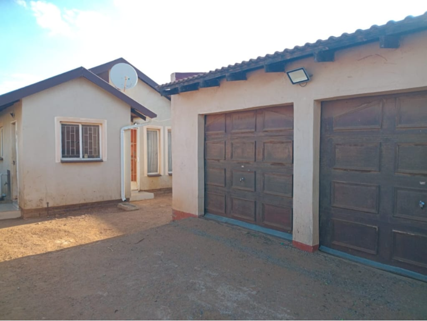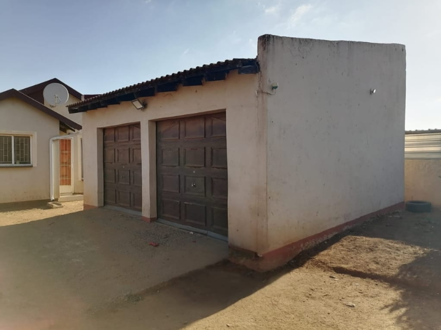 THE HOUSE IS TWO BEDROOM WITH KICHEN DINNING ROOM BATHROOM DOUBLE GARRAGE PAINTED WITH BADGLAPROOF ON THE DOORS AND WINDOS WALL FANCED SLADING GATE THE HOUSE IS NEAR THE PABLIC TRANSPORT ALSO NEAR THE LOCAL MALL LETSHENG MALL