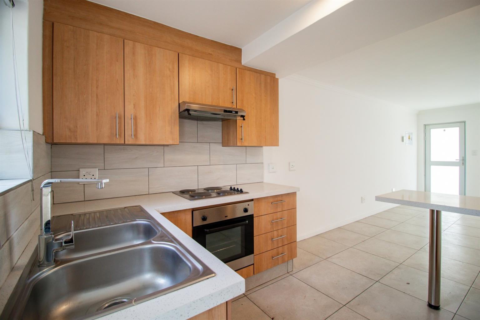 The kitchen has sufficient built-in cupboards, stove, and sink. Well organized, with place for a washing machine, or dishwasher with water connections in place.