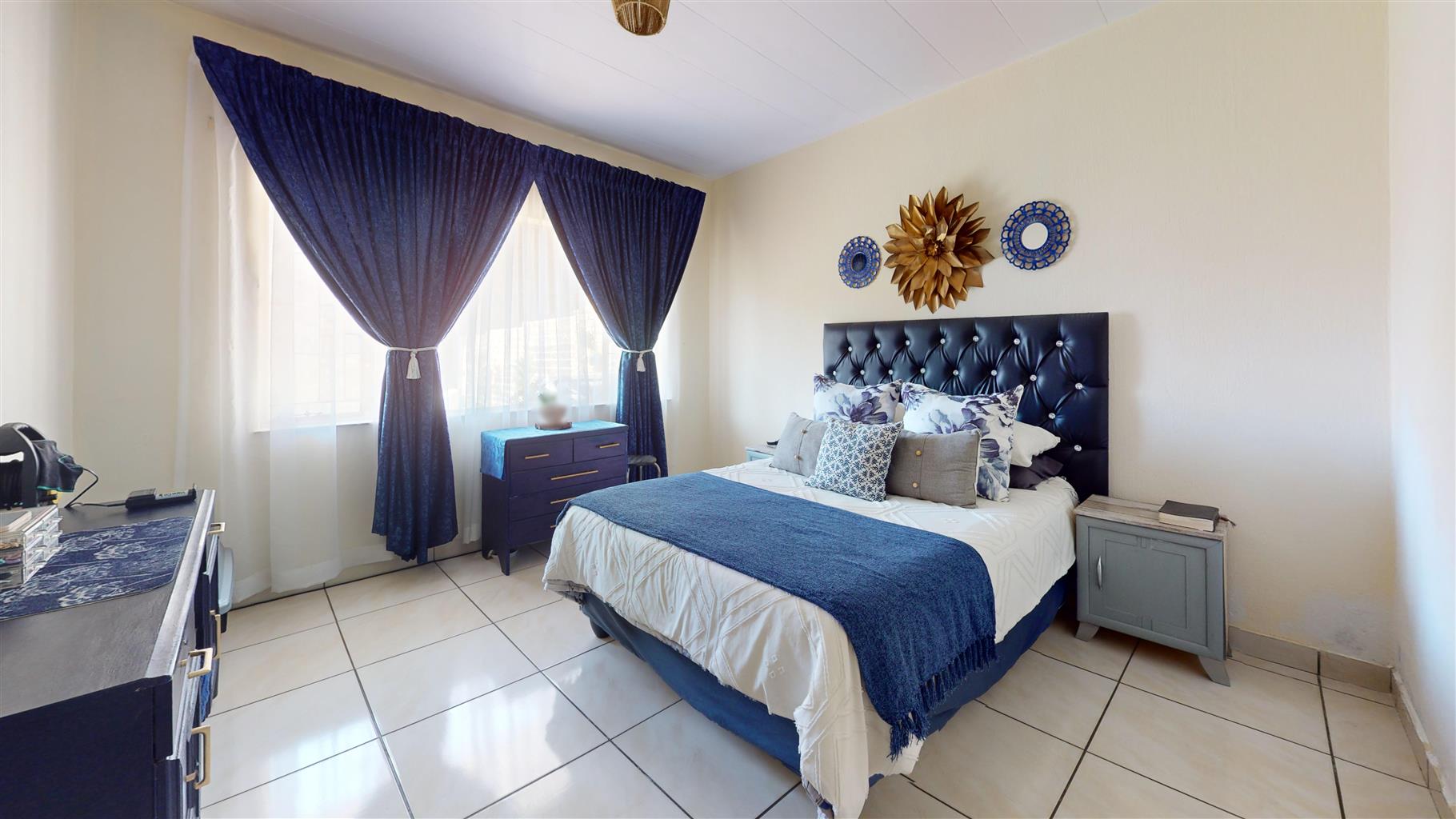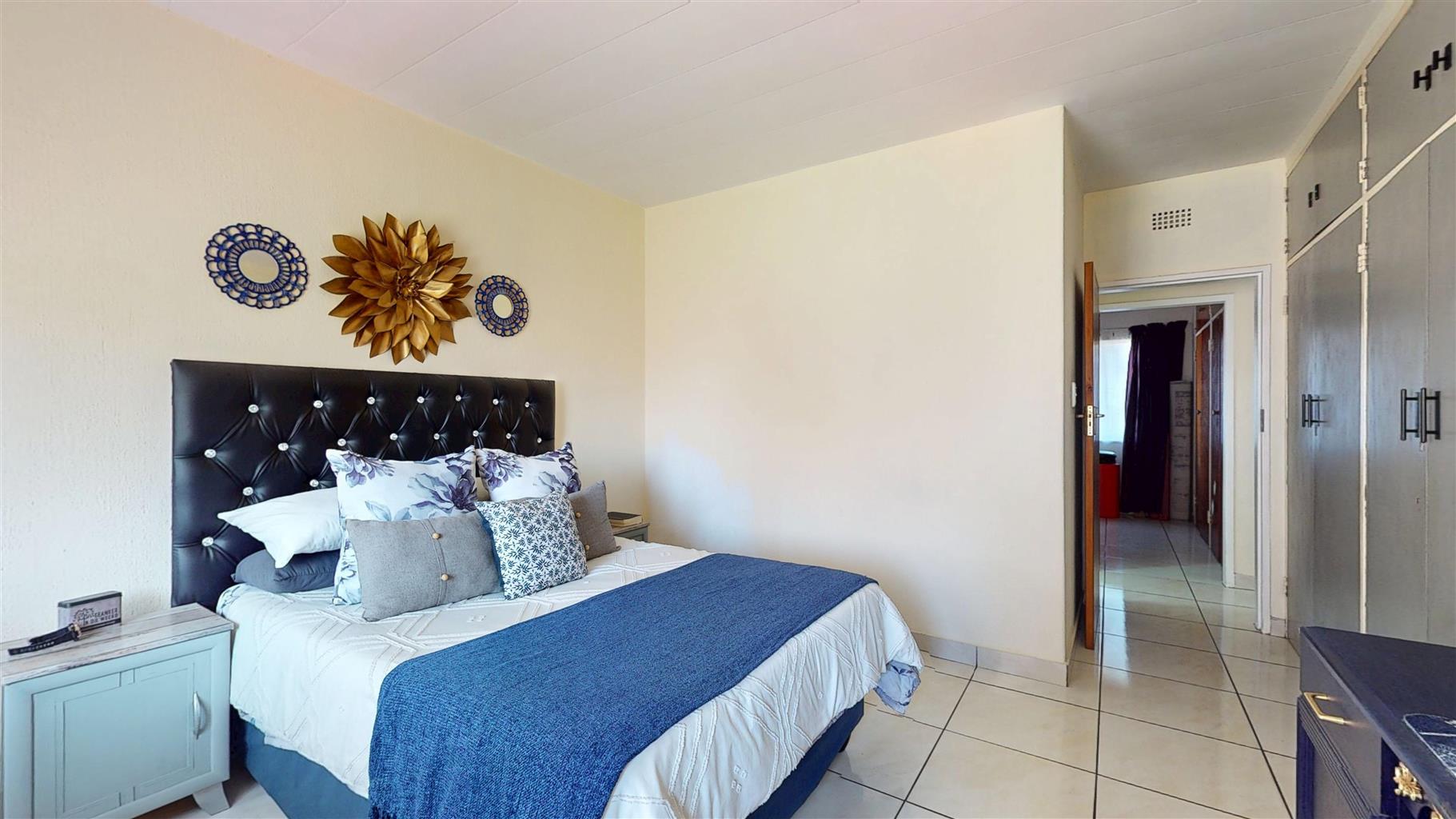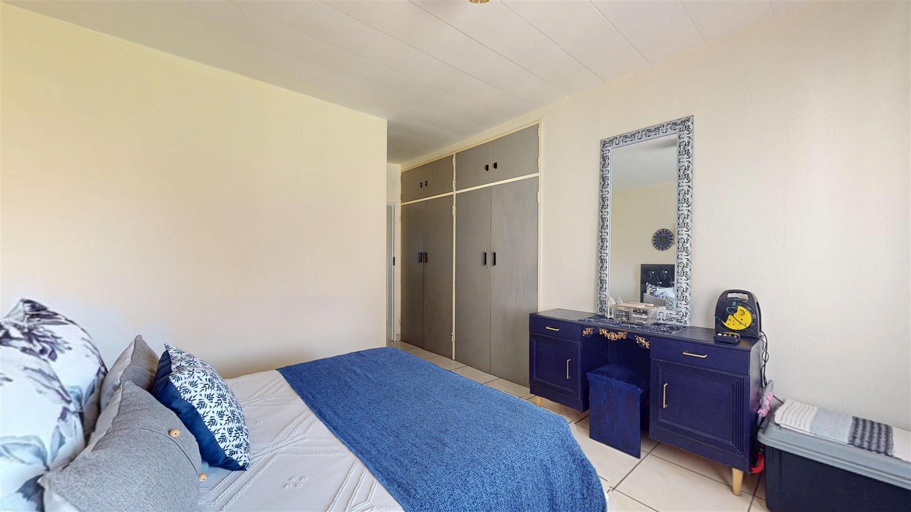 The spacious main bedroom comes complete with built-in cupboards and tiled flooring, while the second bedroom also includes built-in cupboards, making it ideal for guests, a home office, or family. A modern bathroom with a bathtub, toilet, and basin completes the interior.