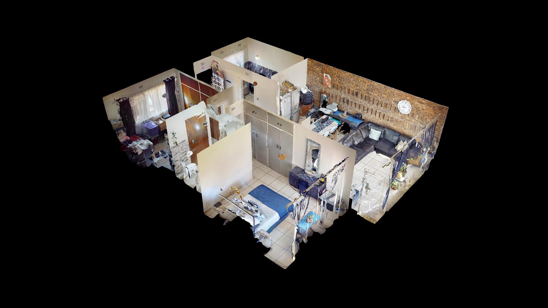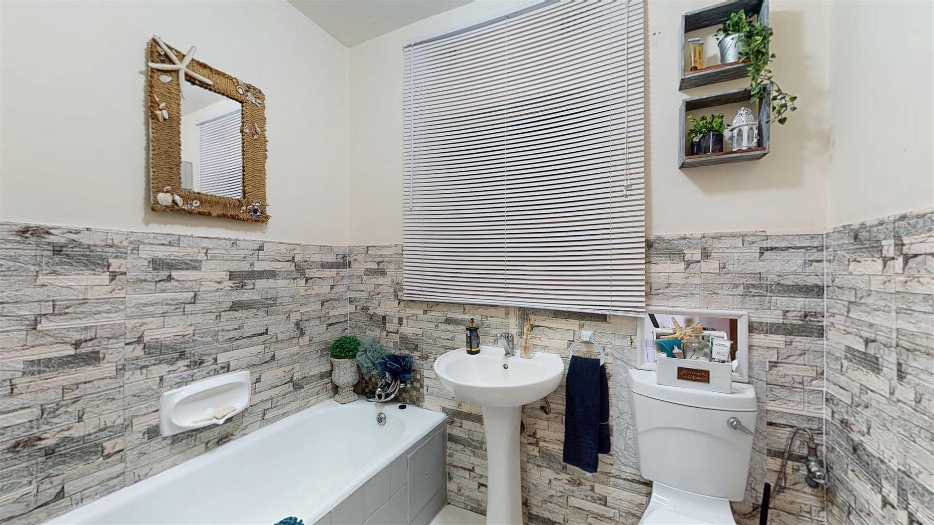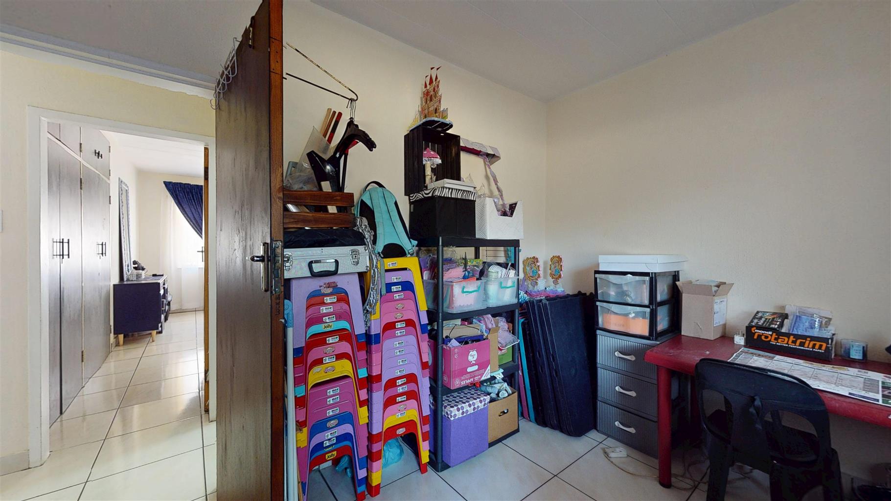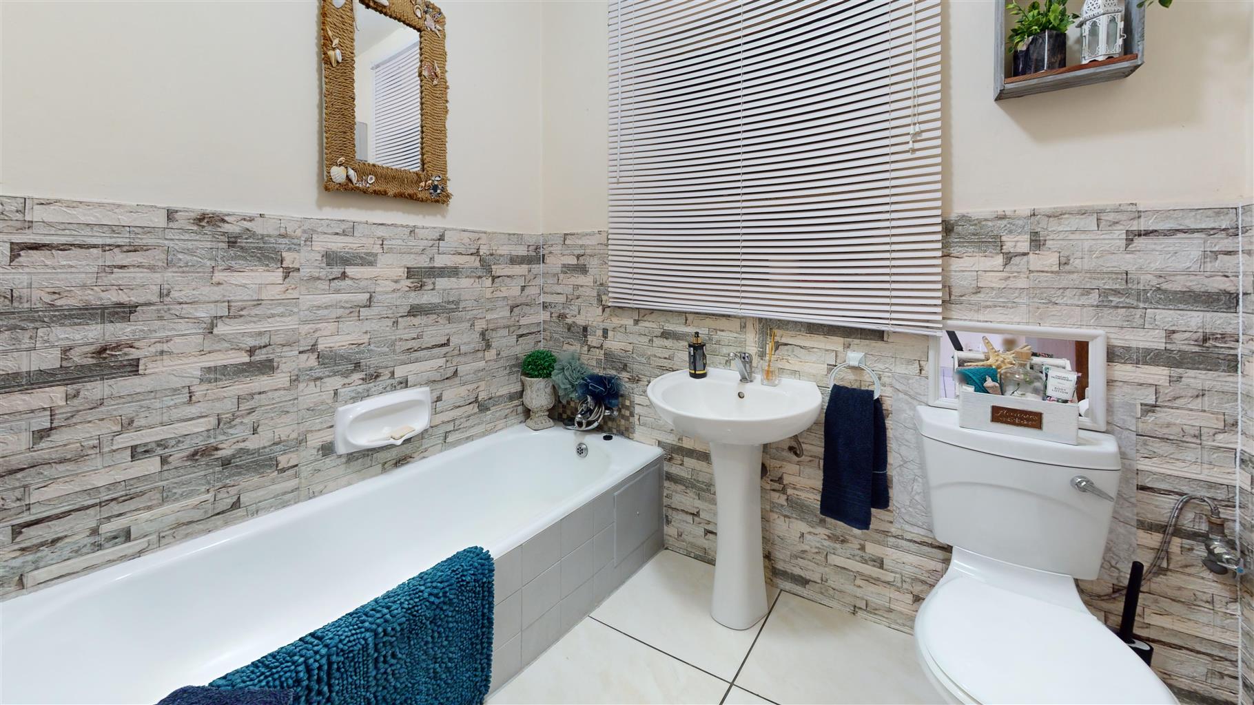 The spacious main bedroom comes complete with built-in cupboards and tiled flooring, while the second bedroom also includes built-in cupboards, making it ideal for guests, a home office, or family. A modern bathroom with a bathtub, toilet, and basin completes the interior.