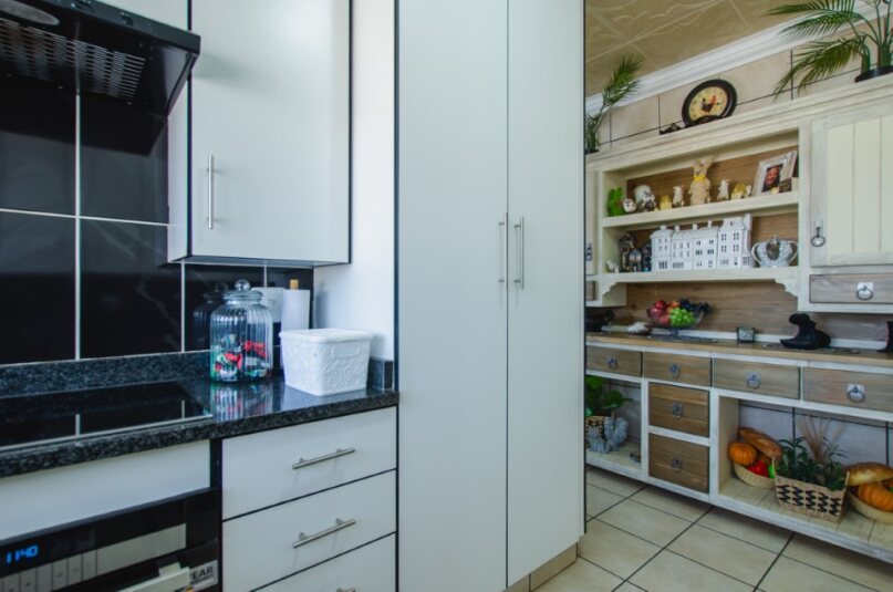 • Kitchen: Built-in cupboards, induction oven, separate scullery