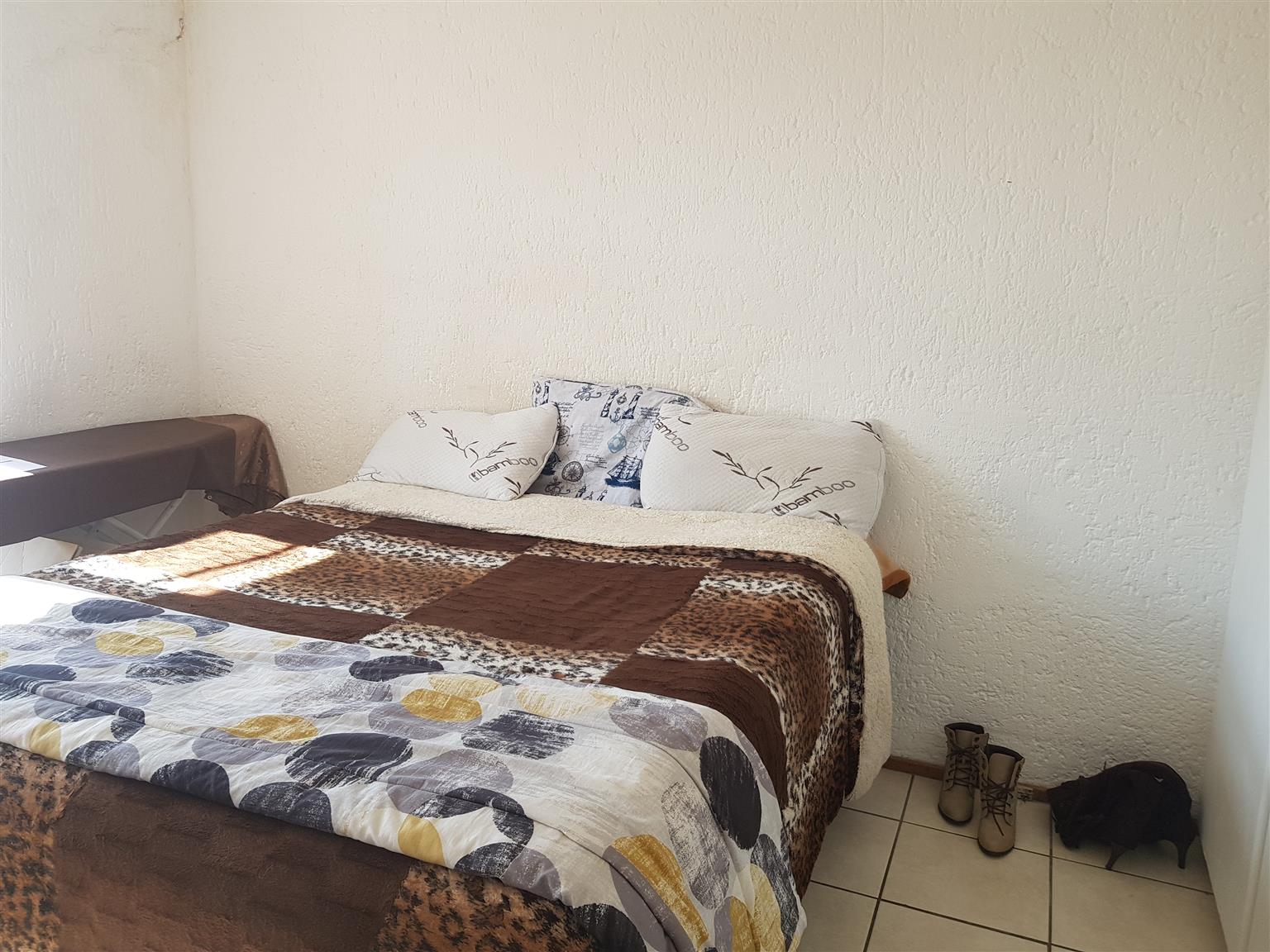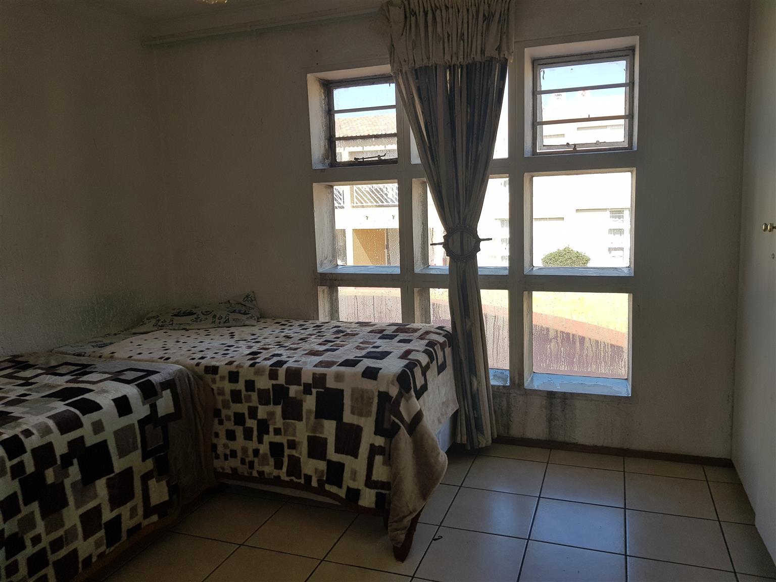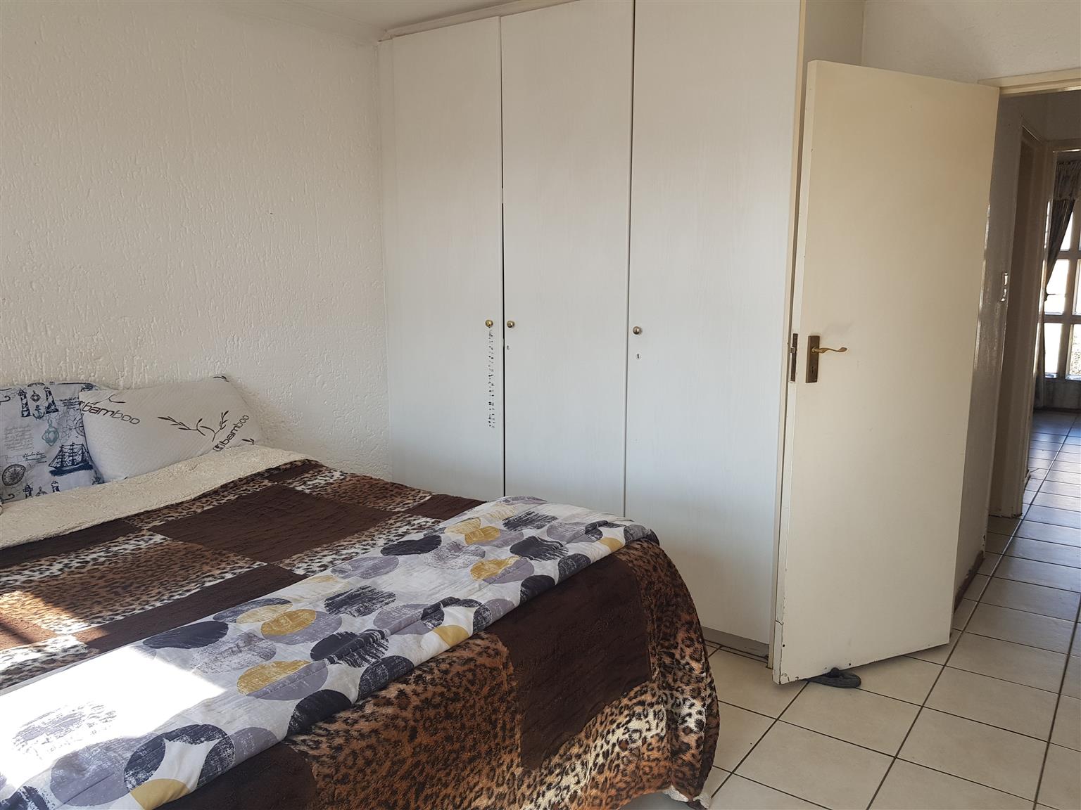 This generously sized upstairs unit features two tiled bedrooms, each equipped with built-in cupboards. The bathroom includes a bath, shower, toilet, and basin. The kitchen boasts ample built-in storage and flows seamlessly into the lounge and a large balcony.