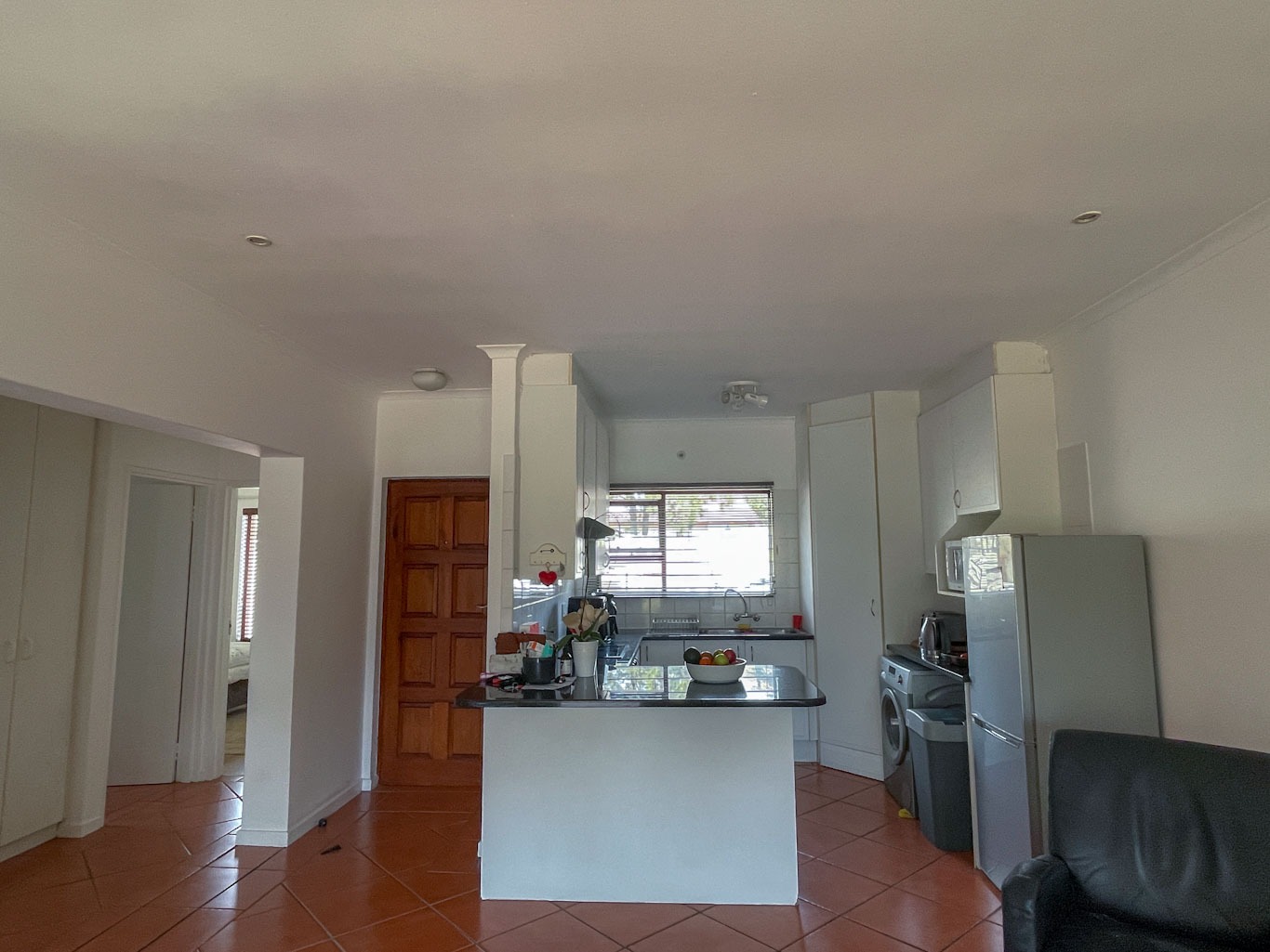 Open-plan kitchen with a breakfast bar, pantry, and space for two under-counter appliances