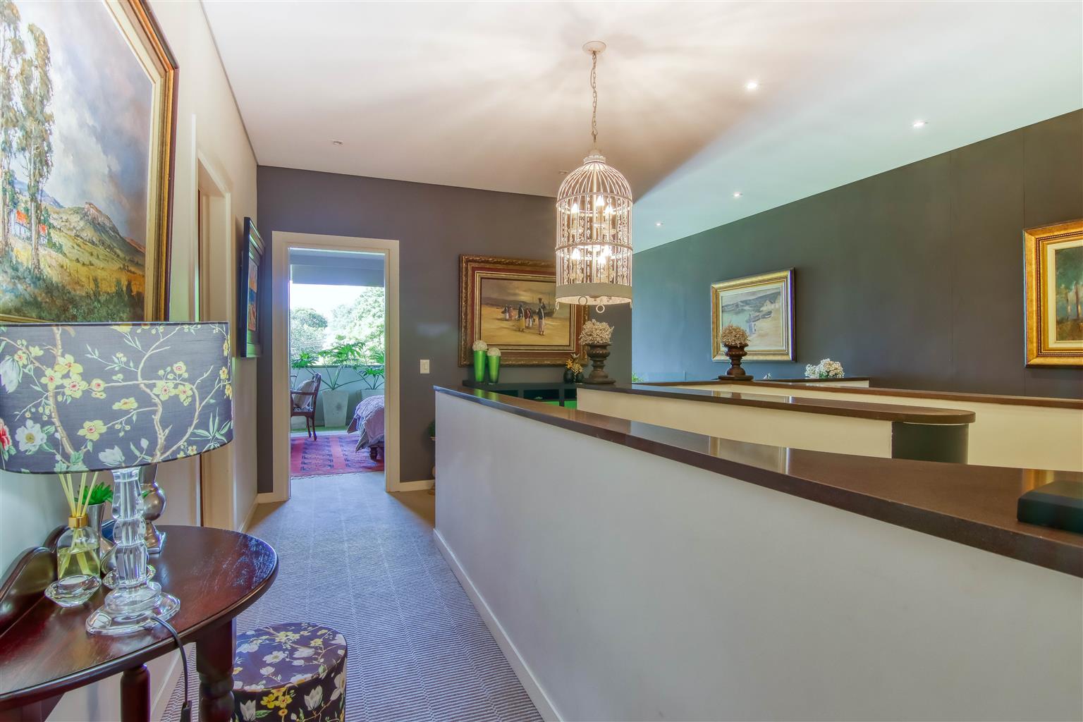 Feature, wooden spiral staircase leads to spacious landing and elegant bedroom wing – comprising 3 spacious bedroom suites and 3 bathrooms. Sumptuous main suite with access to private balcony and vantage views of the suburban treetops. Space on the landing to create a small, open-plan study/ reading area.