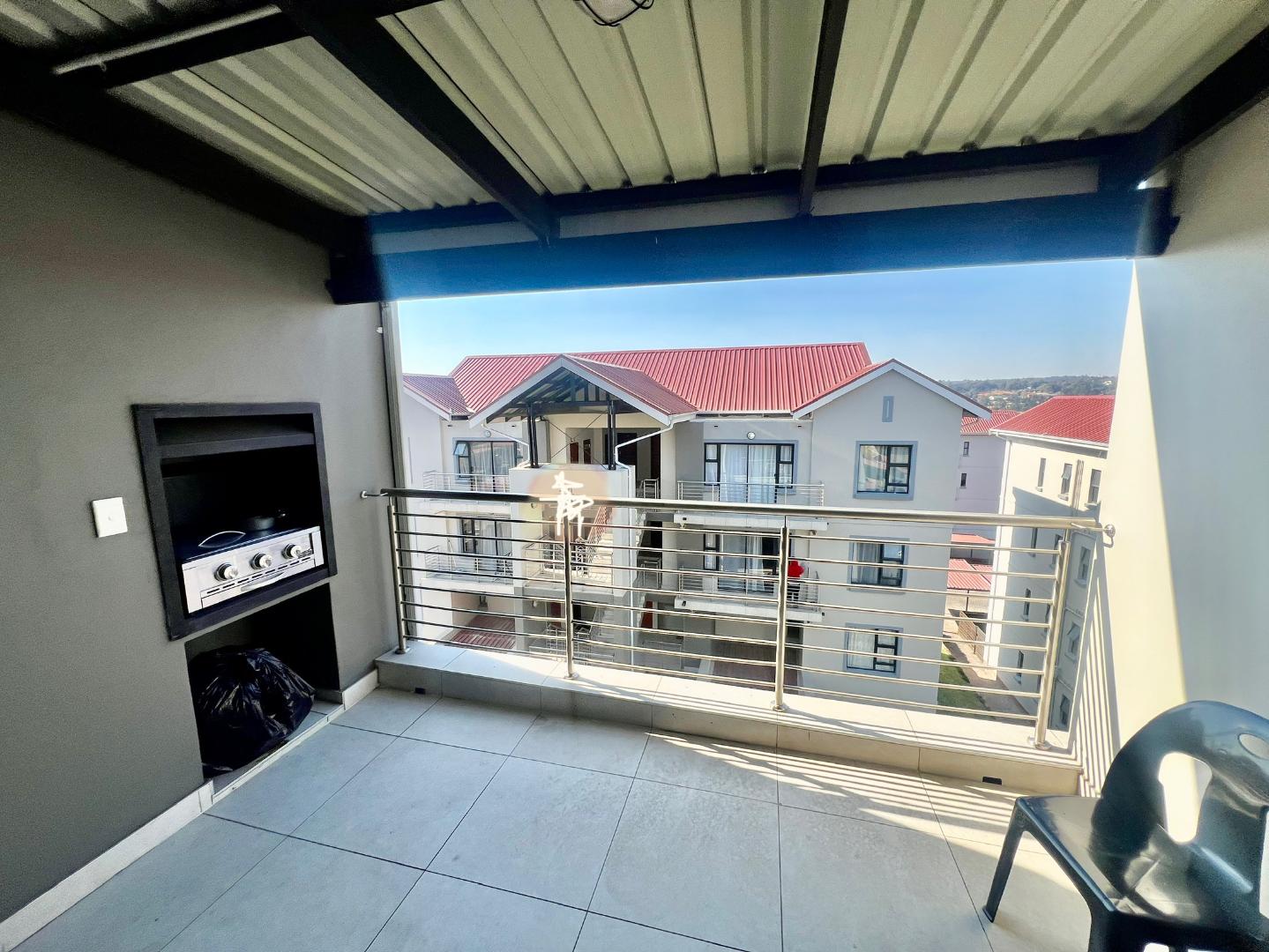 The unit features contemporary finishes throughout, with an open-plan layout that seamlessly connects the lounge area to a state-of-the-art kitchen. Step outside onto the spacious balcony, complete with a built-in gas braai, perfect for entertaining or simply enjoying the stunning views of the complex.
