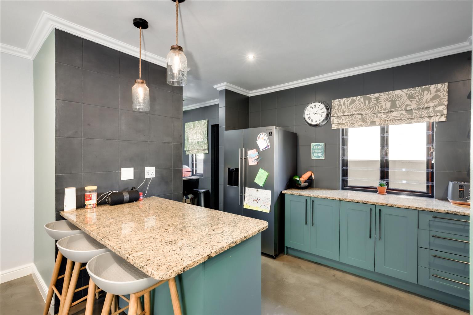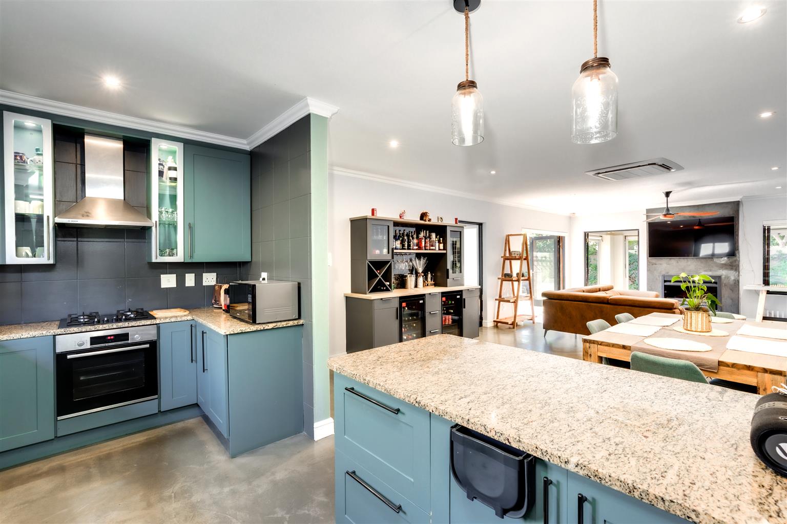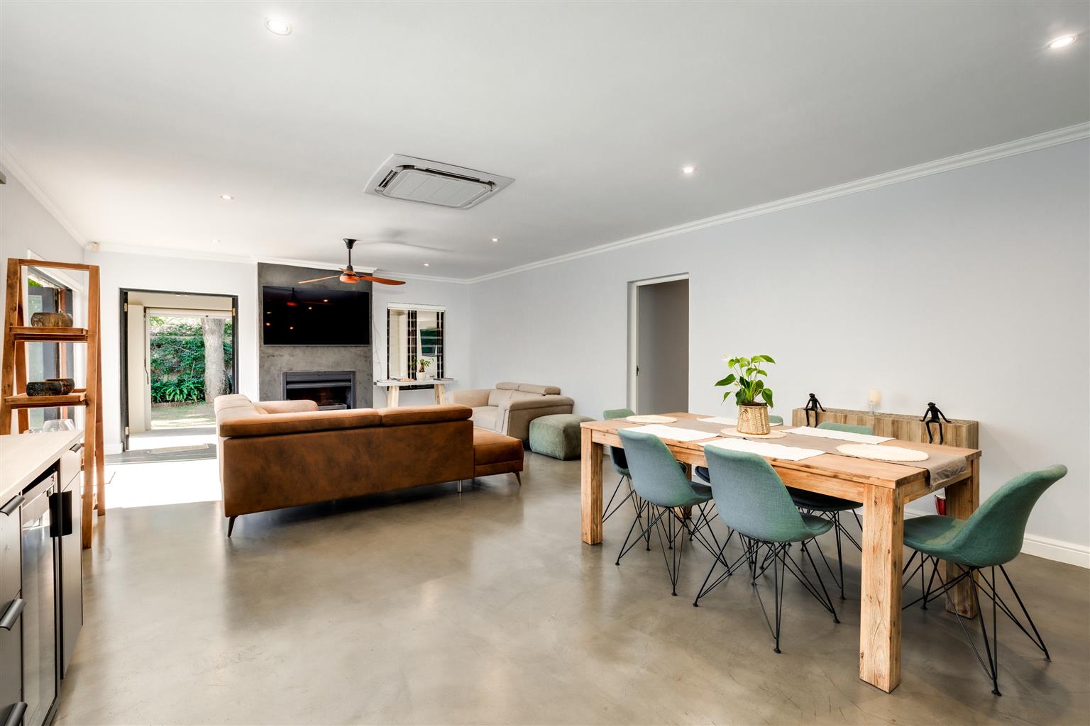 The entrance hall leads into the spacious open plan living areas, with a feature wood-burning fireplace and built-in bar. The living area leads out to an enclosed entertainers patio, with a built-in braai and serving station. Step off the patio onto the spacious and irrigated wrap around garden, with a decked pool area.