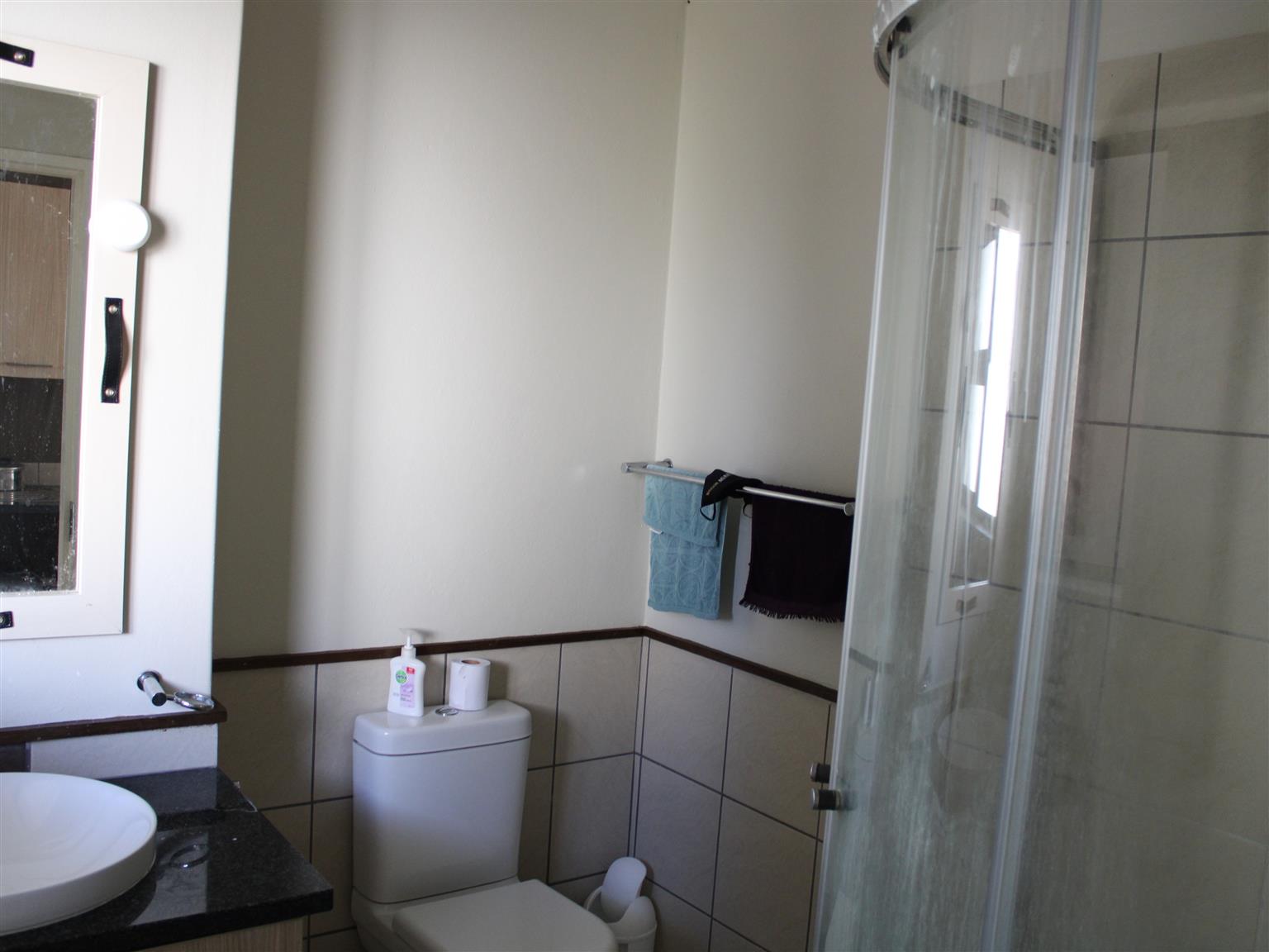 The unit is spacious and has high-quality finishes. It comes with a built-in wardrobe that has ample space, extra shelves, a kitchen that has a stove and granite top, and a bathroom with a shower.