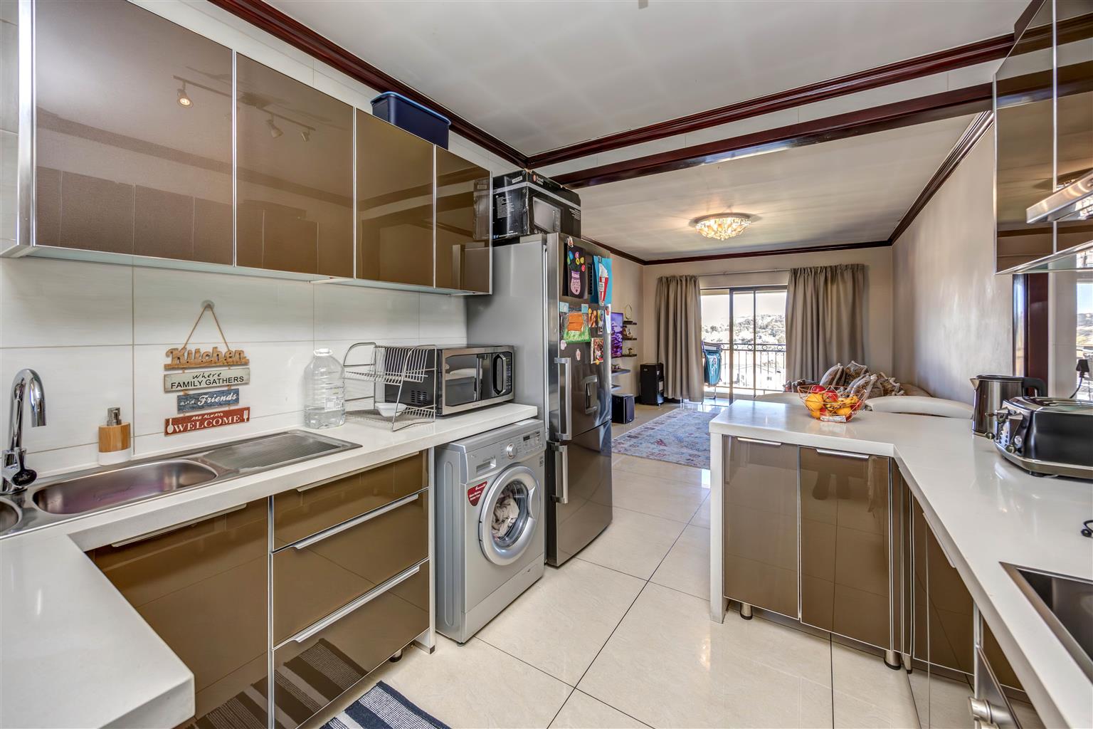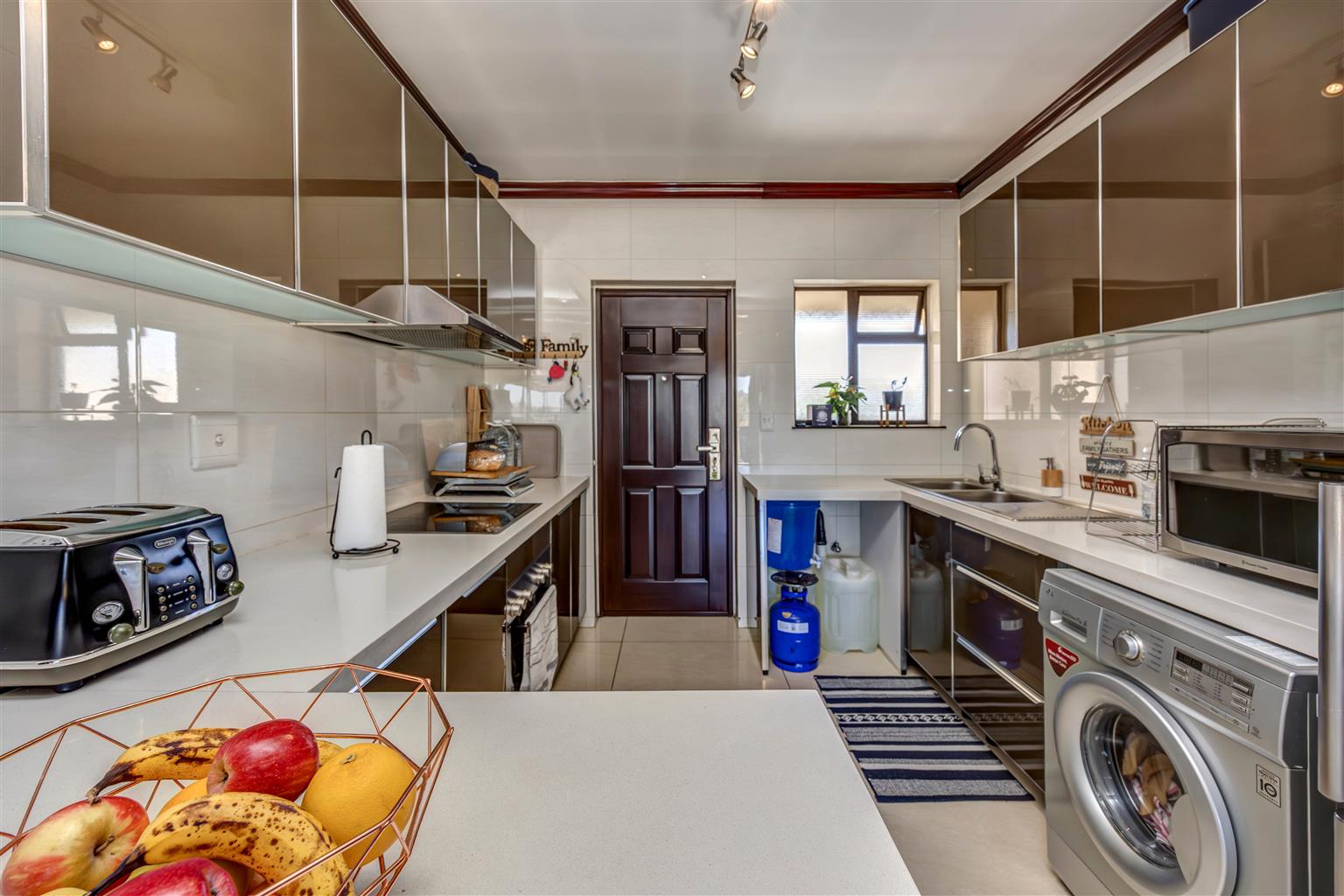 - A kitchen with caesar tops, electric stove and space for 2 appliances