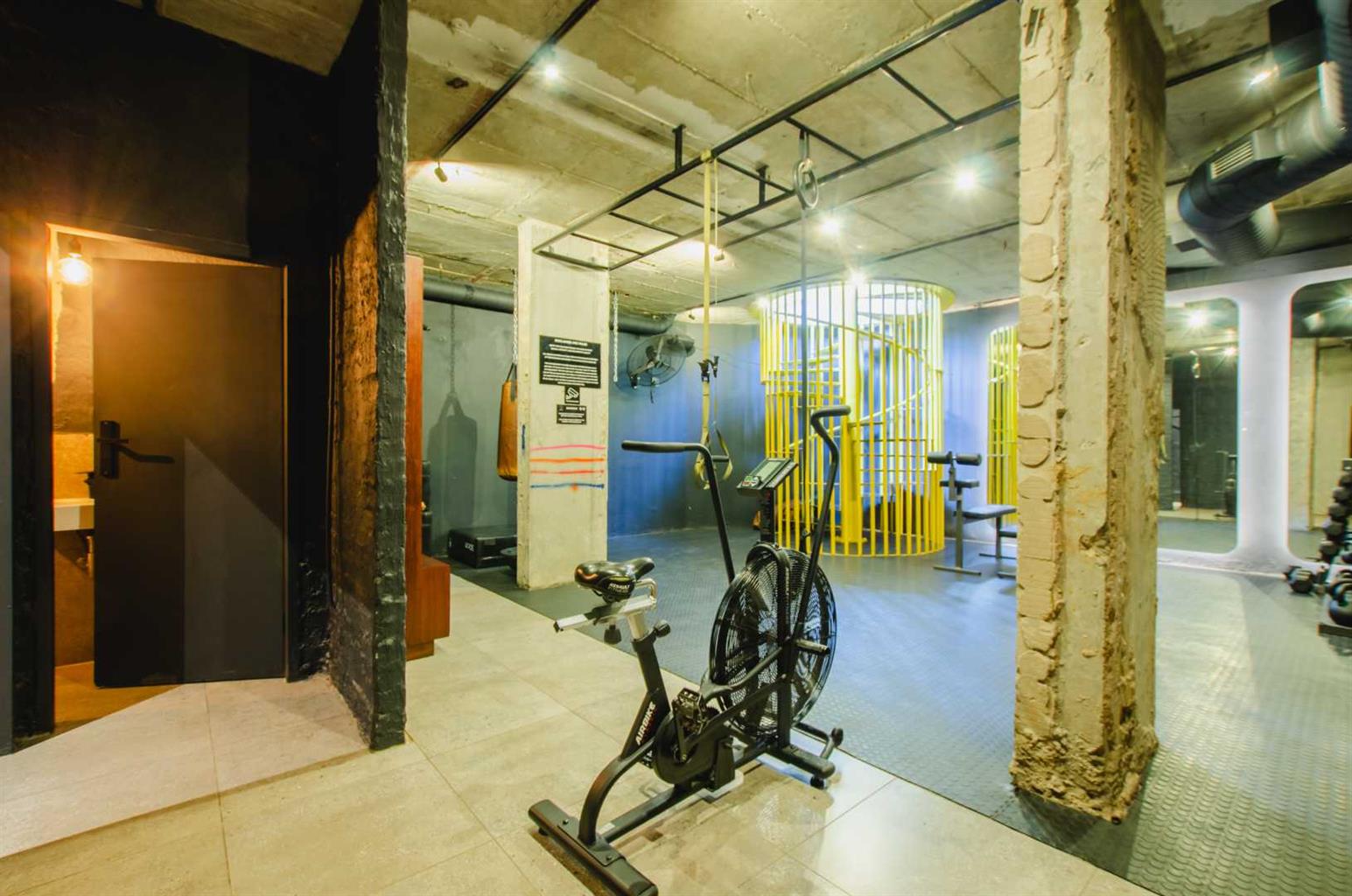 Black brick feature wall and raw concrete ceiling